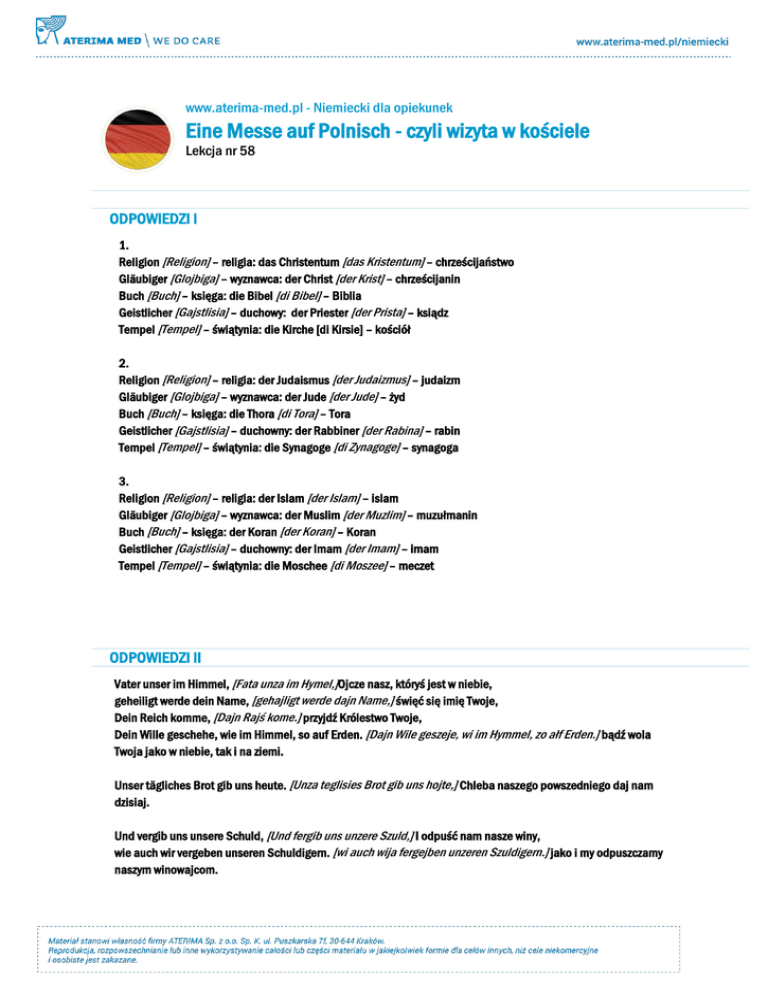 www.aterima-med.pl - Niemiecki dla opiekunek Eine Messe auf Polnisch - czyli wizyta w kościele Lekcja nr 58 ODPOWIEDZI I 1. Religion [Religion] – religia: das Christentum [das Kristentum] – chrześcijaństwo Gläubiger [Glojbiga] – wyznawca: der Christ [der Krist] – chrześcijanin Buch [Buch] – księga: die Bibel [di Bibel] – Biblia Geistlicher [Gajstlisia] – duchowy: der Priester [der Prista] – ksiądz Tempel [Tempel] – świątynia: die Kirche [di Kirsie] – kościół 2. Religion [Religion] – religia: der Judaismus [der Judaizmus] – judaizm Gläubiger [Glojbiga] – wyznawca: der Jude [der Jude] – żyd Buch [Buch] – księga: die Thora [di Tora] – Tora Geistlicher [Gajstlisia] – duchowny: der Rabbiner [der Rabina] – rabin Tempel [Tempel] – świątynia: die Synagoge [di Zynagoge] – synagoga 3. Religion [Religion] – religia: der Islam [der Islam] – islam Gläubiger [Glojbiga] – wyznawca: der Muslim [der Muzlim] – muzułmanin Buch [Buch] – księga: der Koran [der Koran] – Koran Geistlicher [Gajstlisia] – duchowny: der Imam [der Imam] – imam Tempel [Tempel] – świątynia: die Moschee [di Moszee] – meczet ODPOWIEDZI II Vater unser im Himmel, [Fata unza im Hymel,]Ojcze nasz, któryś jest w niebie, geheiligt werde dein Name, [gehajligt werde dajn Name,] święć się imię Twoje, Dein Reich komme, [Dajn Rajś kome.] przyjdź Królestwo Twoje, Dein Wille geschehe, wie im Himmel, so auf Erden. [Dajn Wile geszeje, wi im Hymmel, zo ałf Erden.] bądź wola Twoja jako w niebie, tak i na ziemi. Unser tägliches Brot gib uns heute. [Unza teglisies Brot gib uns hojte,] Chleba naszego powszedniego daj nam dzisiaj. Und vergib uns unsere Schuld, [Und fergib uns unzere Szuld,] I odpuść nam nasze winy, wie auch wir vergeben unseren Schuldigern. [wi auch wija fergejben unzeren Szuldigern.] jako i my odpuszczamy naszym winowajcom. Und führe uns nicht in Versuchung, [Und fyre uns niśt in Fer-zuchun,] I nie wódź nas na pokuszenie, sondern erlöse uns von dem Bösen. [zondern erlyze uns fon dem Byzen.] ale nas zbaw ode złego. Denn Dein ist das Reich und die Kraft und die Herrlichkeit in Ewigkeit. [den Dajn yst das Rajś und di Kraft und di Herliśkajt in Ewiśkajt.] Bo Twoje jest Królestwo, moc i chwała na wieki. Amen. [Amen.] Amen.