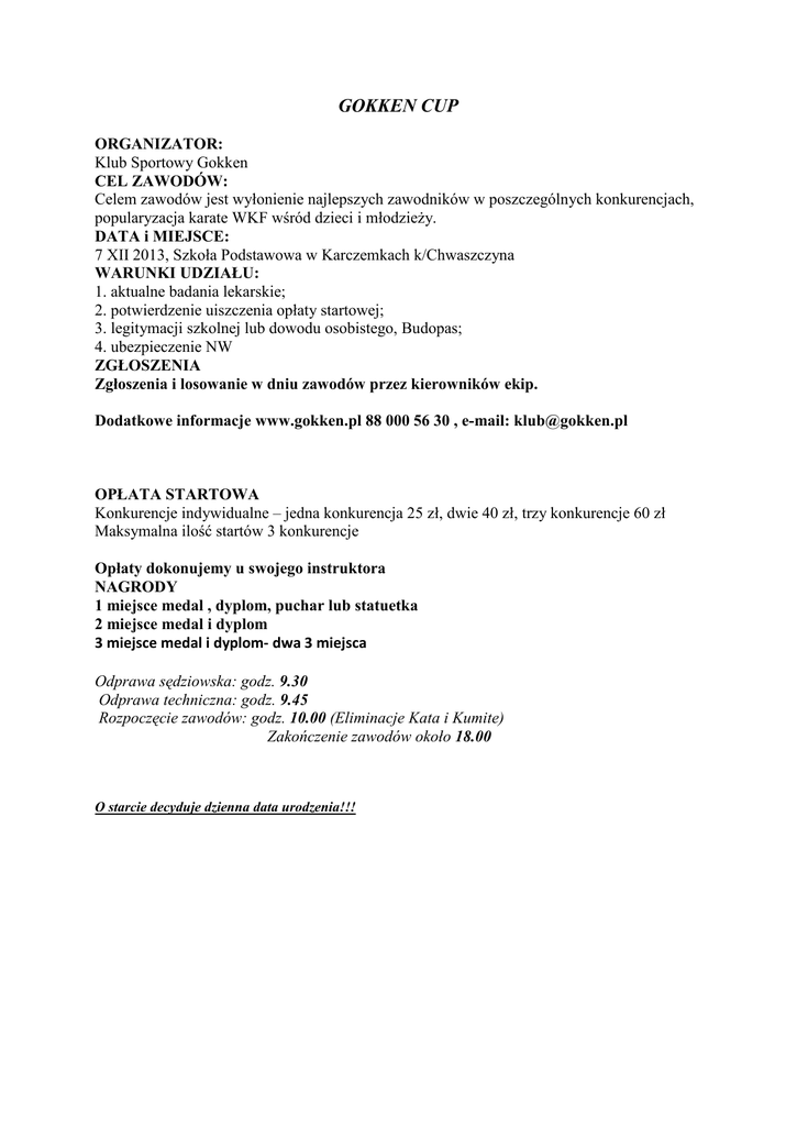 GOKKEN CUP ORGANIZATOR: Klub Sportowy Gokken CEL ZAWODÓW: Celem zawodów jest wyłonienie najlepszych zawodników w poszczególnych konkurencjach, popularyzacja karate WKF wśród dzieci i młodzieży. DATA i MIEJSCE: 7 XII 2013, Szkoła Podstawowa w Karczemkach k/Chwaszczyna WARUNKI UDZIAŁU: 1. aktualne badania lekarskie; 2. potwierdzenie uiszczenia opłaty startowej; 3. legitymacji szkolnej lub dowodu osobistego, Budopas; 4. ubezpieczenie NW ZGŁOSZENIA Zgłoszenia i losowanie w dniu zawodów przez kierowników ekip. Dodatkowe informacje www.gokken.pl 88 000 56 30 , e-mail: [email protected] OPŁATA STARTOWA Konkurencje indywidualne – jedna konkurencja 25 zł, dwie 40 zł, trzy konkurencje 60 zł Maksymalna ilość startów 3 konkurencje Opłaty dokonujemy u swojego instruktora NAGRODY 1 miejsce medal , dyplom, puchar lub statuetka 2 miejsce medal i dyplom 3 miejsce medal i dyplom- dwa 3 miejsca Odprawa sędziowska: godz. 9.30 Odprawa techniczna: godz. 9.45 Rozpoczęcie zawodów: godz. 10.00 (Eliminacje Kata i Kumite) Zakończenie zawodów około 18.00 O starcie decyduje dzienna data urodzenia!!! Konkurencje: Kihon dla dzieci ćwiczących od września 2013 roku (bez stopnia lub białe pasy z jedną belką, 9.1 kyu) - 5 lat młodsi chłopcy i dziewczęta razem - 6 lat i młodsi chłopcy - 6 lat i młodsi dziewczęta - 7 lat chłopcy - 7 lat dziewczęta - 8 – 9 lat chłopcy - 8 – 9 lat dziewczęta - 10 lat i wyżej chłopcy - 10 lat i wyżej dziewczęta Kihon dla dzieci ćwiczących od września 2012 roku (maksymalnie 9.2 kyu – dwie belki) - 6 lat i młodsi chłopcy - 6 lat i młodsi dziewczęta - 7 lat chłopcy - 7 lat dziewczęta - 8 – 9 lat chłopcy - 8 – 9 lat dziewczęta - 10 lat i wyżej chłopcy - 10 lat i wyżej dziewczęta Kata indywidualne białe pasy dziewczęta 7 lat i młodsze Kata indywidualne białe pasy chłopcy 7 lat i młodsi Kata indywidualne białe pasy dziewczęta 8-9 lat Kata indywidualne białe pasy chłopcy 8-9 lat Kata indywidualne białe pasy dziewczęta 10 – 11 lat Kata indywidualne białe pasy chłopcy 10-11 lat Kata indywidualne dziewcząt i chłopców7 lat i młodsi Kata indywidualne Dziewcząt 8 - 9 lat Kata indywidualne Chłopców 8 - 9 lat Kata indywidualne Dziewcząt 10 – 11 lat Kata indywidualne Chłopców 10 – 11 lat Kata indywidualne Dziewcząt 12 – 13 lat Kata indywidualne Chłopców 12 – 13 lat Kata indywidualne Kadetek 14 – 15 lat Kata indywidualne Kadetów 14 – 15 lat Kata indywidualne mężczyzn 16 – 17 lat + seniorzy Kata indywidualne kobiet 16 – 17 lat + seniorki Konkurencje kumite: KUMITE INDYWIDUALNE DZIEWCZĄT DO 7 LAT OPEN KUMITE INDYWIDUALNE CHŁOPCÓW DO 7 LAT OPEN Kumite indywidualne dziewcząt 8-9 lat ( - 27 kg; +27 kg) + osobna konkurencja białych pasów OPEN Kumite indywidualne chłopców 8-9 lat ( - 27 kg ; +27 kg) + osobna konkurencja białych pasów OPEN Kumite indywidualne Dziewcząt 10 – 11 lat (-35 kg ; +35 kg) + osobna konkurencja białych pasów OPEN Kumite indywidualne Chłopców 10 – 11 lat (-37kg;+37 kg) + osobna konkurencja białych pasów OPEN Kumite indywidualne Dziewcząt 12-13 lat (- 45 kg, +45 kg) + osobna konkurencja białych pasów OPEN Kumite indywidualne Chłopców 12-13 lat (-45kg;+45kg) + osobna konkurencja białych pasów OPEN Kumite indywidualne Dziewcząt 14-15 lat (- 47kg, - 54kg,+54kg) Kumite indywidualne Chłopców 14 – 15 lat (,-57kg,- 63kg, +63kg) Kumite indywidualne Chłopców 16 – 17 lat ( - 61 kg, - 68 kg, +68 kg) Kumite indywidualne Dziewcząt 16 – 17 lat ( -53 kg, -59 kg, +59 kg) Kumite indywidualne Mężczyzn + 18 OPEN Kumite indywidualne Kobiet + 18 OPEN ROZPISKA GODZINOWA Zgłoszenia min. 45 minut przed rozpoczęciem konkurencji 10.00 konkurencje białych pasów 13.00 – konkurencje kolorowych pasów od najmłodszych 7 i młodsi do 11 lat 15.00 konkurencje 12 – 13 lat i wyżej Sposób przeprowadzenia zawodów Zawody zostaną przeprowadzone według aktualnie obowiązujących przepisów WKF z podanymi poniżej zmianami: System pucharowy i dwa trzecie miejsca. W kata białych pasów oraz 7 lat i młodsi dowolne kata, można powtarzać. W kategoriach 8-9 lat oraz 10 – 11 lat można wykonywać dowolne dwa kata na przemian, w kategorii 12 – 13 lat dowolne trzy kata na przemian, kadeci/juniorzy w każdej rundzie inne kata. Organizator zastrzega sobie prawo połączenia konkurencji w sytuacji małej ilości zawodników w poszczególnych kategoriach. KUMITE - wg przepisów WKF - obowiązkowe ochraniacze na zęby, napięstniki koloru czerwonego i niebieskiego, ochraniacze na stopy i golenie czerwone i niebieskie – wzór WKF oraz ochraniacze na korpus. W kategorii kadet dodatkowo „maski”. Czas walki 2 min dla konkurencji Kadet, konkurencje 12 – 13 lat – 1.5 min, 10 – 11 lat i młodsi – 1 min Repesaże i dwa trzecie miejsca. Możliwość zważenia zawodnika przed konkurencją. Postanowienia dodatkowe 1. Ekspozycja i sprzedaż folderów, materiałów reklamowych, ulotek i pism oraz wszelkich walorów może odbywać się tylko za zgodą organizatora. 2. Każdy uczestnik zawodów zobowiązany jest do przestrzegania dyscypliny i porządku oraz ponosi całkowitą odpowiedzialność za ewentualne szkody wynikłe bądź spowodowane przez niego na terenie obiektu. 3. Organizator nie ponosi odpowiedzialności za rzeczy zaginione. 4. W sprawach nie ujętych niniejszym Regulaminem zastosowanie mają przepisy Kodeksu Cywilnego. 5. Lista sędziów zostanie ustalona przez organizatora w porozumieniu z Przewodniczącym Komisji Sędziowskiej WKF PZK. 6. Wszelkie kwestie sporne dotyczące przebiegu zawodów mogą być zgłaszane pod adresem Organizatora w trakcie zawodów 7. Przy planszach mogą przebywać tylko zawodnicy aktualnie startujących i ich trenerzy .