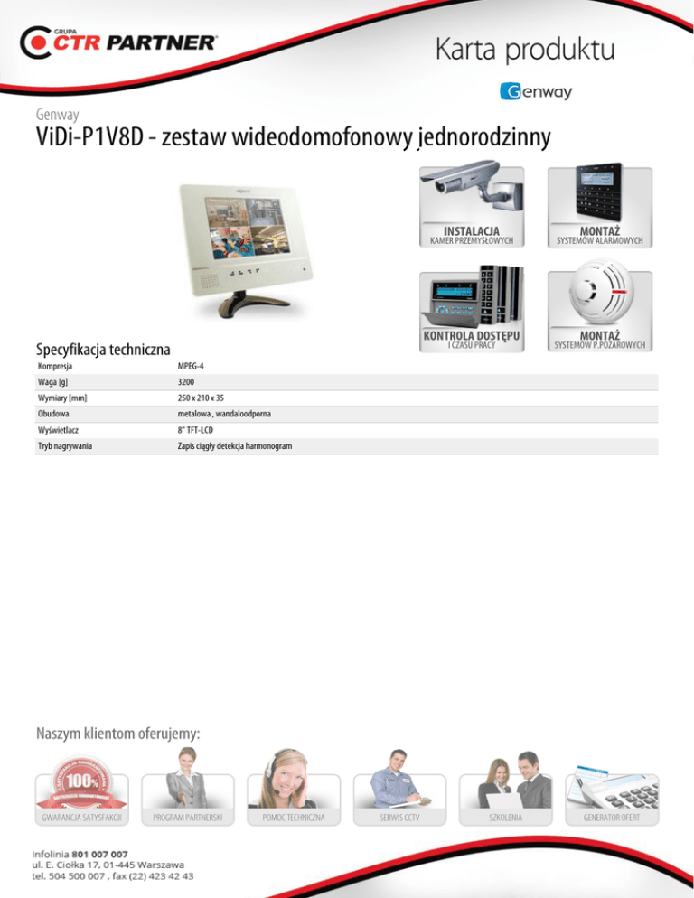 Genway ViDi-P1V8D - zestaw wideodomofonowy jednorodzinny INSTALACJA KAMER PRZEMYSŁOWYCH KONTROLA DOSTĘPU I CZASU PRACY Specyfikacja techniczna Kompresja MPEG-4 Waga [g] 3200 Wymiary [mm] 250 x 210 x 35 Obudowa metalowa , wandaloodporna Wyświetlacz 8" TFT-LCD Tryb nagrywania Zapis ciągły detekcja harmonogram MONTAŻ SYSTEMÓW ALARMOWYCH MONTAŻ SYSTEMÓW P.POŻAROWYCH Naszym klientom oferujemy: GWARANCJA SATYSFAKCJI PROGRAM PARTNERSKI POMOC TECHNICZNA SERWIS CCTV SZKOLENIA GENERATOR OFERT