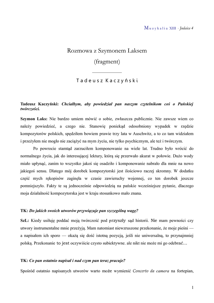 Mu z y k a l i a XIII · Judaica 4 Rozmowa z Szymonem Laksem (fragment) Tadeusz Kaczyński Tadeusz Kaczyński: Chciałbym, aby powiedział pan naszym czytelnikom coś o Pańskiej twórczości. Szymon Laks: Nie bardzo umiem mówić o sobie, zwłaszcza publicznie. Nie zawsze wiem co należy powiedzieć, a czego nie. Stanowię poniekąd odosobniony wypadek w rzędzie kompozytorów polskich, spędziłem bowiem prawie trzy lata w Auschwitz, a to co tam widziałem i przeżyłem nie mogło nie zaciążyć na mym życiu, nie tylko psychicznym, ale też i twórczym. Po powrocie stamtąd zarzuciłem komponowanie na wiele lat. Trudno było wrócić do normalnego życia, jak do interesującej lektury, którą się przerwało akurat w połowie. Dużo wody miało upłynąć, zanim to wszystko jakoś się osadziło i komponowanie nabrało dla mnie na nowo jakiegoś sensu. Dlatego mój dorobek kompozytorski jest ilościowo raczej skromny. W dodatku część mych rękopisów zaginęła w czasie zawieruchy wojennej, co ten dorobek jeszcze pomniejszyło. Fakty te są jednocześnie odpowiedzią na pańskie wcześniejsze pytanie, dlaczego moja działalność kompozytorska jest w kraju stosunkowo mało znana. TK: Do jakich swoich utworów przywiązuje pan szczególną wagę? SzL: Kiedy usiłuję poddać moją twórczość pod przyszły sąd historii. Nie mam pewności czy utwory instrumentalne mnie przeżyją. Mam natomiast niewzruszone przekonanie, że moje pieśni — a napisałem ich sporo — okażą się dość istotną pozycją, jeśli nie uniwersalną, to przynajmniej polską. Przekonanie to jest oczywiście czysto subiektywne. ale nikt nie może mi go odebrać... TK: Co pan ostatnio napisał i nad czym pan teraz pracuje? Spośród ostatnio napisanych utworów warto może wymienić Concerto da camera na fortepian, 1 Mu z y k a l i a XIII · Judaica 4 9 instrumentów dętych i perkusję [1964], które uzyskało pierwszą nagrodę na konkursie kompozytorskim organizowanym dorocznie przez Casino w Divonne-les-Bains i tam też zostało po raz pierwszy wykonane 27 czerwca br. [1964] w ramach Festiwalu Muzyki Kameralnej. Poza tym napisałem niedawno muzykę sceniczną do żydowskiej komedii muzycznej Córki kowala Pereca Hirszbeina1. Było to dość wdzięczne zadanie kompozytorskie, ze względu na szereg z góry narzuconych ograniczeń. Premiera widowiska odbyła się w końcu maja w Paryżu i przysporzyła mi dużo zadowolenia. Obecnie pracuję nad cyklicznym utworem na zespół smyczkowy. Będzie to albo „kwartet orkiestrowy” albo rodzaj suity na smyczki — jeszcze nie wiem2. Pierwotna publikacja wywiadu: „Ruch Muzyczny”, 1964 nr 21 (1-15 XI), s. 15-16. Przypisami opatrzył Michał Klubiński. 1 Perec Hirszbein (1880-1948), rosyjski dramatopisarz języku jidysz, nazywany Maeterlinckiem tego języka. Tworzył podstawy drugiej złotej ery teatru jidysz, która miała miejsce po I wojnie światowej. Autor sztuk Kontrakt (1907), Złoty łańcuch (1908), Zielone pola (1916), Córki Smitha (1918), Navla (1924). Wystawienie sztuki Hirszbeina La fille de forgeron, z muzyką Szymona Laksa, odbyło się w 1964 r. w Paryżu. 2 Z projektu zrodziła się Symfonia na smyczki (1964), wyk. po raz pierwszy w Poznaniu w 1965. 2