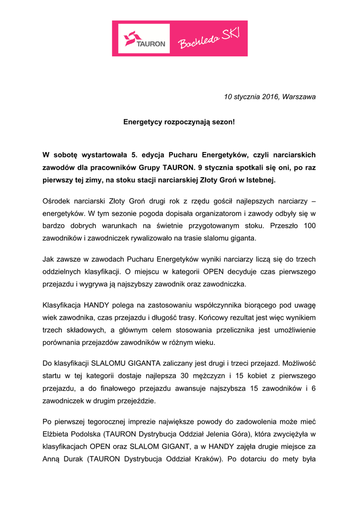 10 stycznia 2016, Warszawa Energetycy rozpoczynają sezon! W sobotę wystartowała 5. edycja Pucharu Energetyków, czyli narciarskich zawodów dla pracowników Grupy TAURON. 9 stycznia spotkali się oni, po raz pierwszy tej zimy, na stoku stacji narciarskiej Złoty Groń w Istebnej. Ośrodek narciarski Złoty Groń drugi rok z rzędu gościł najlepszych narciarzy – energetyków. W tym sezonie pogoda dopisała organizatorom i zawody odbyły się w bardzo dobrych warunkach na świetnie przygotowanym stoku. Przeszło 100 zawodników i zawodniczek rywalizowało na trasie slalomu giganta. Jak zawsze w zawodach Pucharu Energetyków wyniki narciarzy liczą się do trzech oddzielnych klasyfikacji. O miejscu w kategorii OPEN decyduje czas pierwszego przejazdu i wygrywa ją najszybszy zawodnik oraz zawodniczka. Klasyfikacja HANDY polega na zastosowaniu współczynnika biorącego pod uwagę wiek zawodnika, czas przejazdu i długość trasy. Końcowy rezultat jest więc wynikiem trzech składowych, a głównym celem stosowania przelicznika jest umożliwienie porównania przejazdów zawodników w różnym wieku. Do klasyfikacji SLALOMU GIGANTA zaliczany jest drugi i trzeci przejazd. Możliwość startu w tej kategorii dostaje najlepsza 30 mężczyzn i 15 kobiet z pierwszego przejazdu, a do finałowego przejazdu awansuje najszybsza 15 zawodników i 6 zawodniczek w drugim przejeździe. Po pierwszej tegorocznej imprezie największe powody do zadowolenia może mieć Elżbieta Podolska (TAURON Dystrybucja Oddział Jelenia Góra), która zwyciężyła w klasyfikacjach OPEN oraz SLALOM GIGANT, a w HANDY zajęła drugie miejsce za Anną Durak (TAURON Dystrybucja Oddział Kraków). Po dotarciu do mety była bardzo zadowolona ze swojego rezultatu:„Udało mi się dzisiaj wygrać, bardzo się cieszę. To świetna zabawa, dlatego zapraszam wszystkich pracowników TAURON do wzięcia udziału w kolejnych imprezach – w Krynicy i Małym Cichym.“ Wśród mężczyzn w klasyfikacji OPEN triumfował Tomasz Żyła (TAURON Wytwarzanie – centrala), który był też liderem przed trzecim przejazdem SLALOMU GIGANTA. Niestety na trasie przydarzyła mu się przygoda, która kosztowała go stratę kilkunastu sekund i ostatecznie zajął 15. miejsce. „To była chwila nieuwagi, nie dociążyłem dolnej narty i niestety upadłem. Obyło się bez żadnej kontuzji i to jest najważniejsze. Ogólnie zawody oceniam bardzo dobrze – super organizacja, świetnie przygotowany stok i wspaniała atmosfera. Na pewno będę walczył w kolejnych edycjach.“ Błąd Tomasza Żyły wykorzystał Marcin Kaszyca (TAURON Polska Energia S.A.), który z każdym przejazdem piął się wyżej w klasyfikacji finałowej. Pierwszy przejazd, a więc klasyfikację OPEN zakończył na 4. miejscu. Po drugim przejeździe przegrywał już tylko z Tomaszem Żyłą, a w trzecim okazał się najlepszy. Tym samym to on triumfował w klasyfikacji SLALOM GIGANT.„Pierwszy zjazd był dla mnie treningowy, po raz pierwszy stałem na nartach tej zimy. Z każdym przejazdem szło mi coraz lepiej, no i w końcu się udało. Rok temu mieliśmy tutaj fatalną deszczową pogodę, a dzisiaj warunki bardzo przyzwoite. Puchar Energetyków to znakomita inicjatywa, jestem mile zaskoczony, że tak wielu ludzi z różnych zakątków Polski przyjeżdża startować. Z roku na rok poziom rywalizacji jest coraz wyższy. Bardzo bym chciał aby w tym sezonie udało mi się uzbierać jak najwięcej punktów do klasyfikacji generalnej i zwyciężyć w całej edycji.“ W rywalizacji drużynowej po pierwszym przystanku na czele tabeli znajdują się narciarze z TAURON Wytwarzanie E. Łaziska, przed TAURON Wytwarzanie centrala i TAURON Polska Energia S.A. Przed pracownikami sektora energetycznego jeszcze dwie imprezy. W ostatnią sobotę stycznia spotkają się na Jaworzynie Krynickiej, a w niedzielę 28 lutego decydujące starcie rozegra się w Małym Cichym. Więcej informacji odnośnie projektu TAURON Bachleda Ski znaleźć można na stronie internetowej www.tauronbachledaski.pl oraz na facebook.com/TauronBachledaSki. Andrzej Lesiewski [email protected] +48 512 348 232 TAURON Polska Energia SA jest spółką holdingową w grupie kapitałowej, która zajmuje się wydobyciem węgla, wytwarzaniem, dystrybucją i sprzedażą energii. Grupa TAURON wraz z GZE obejmuje swoim działaniem 18 proc. powierzchni kraju i jest największym sprzedawcą i dystrybutorem energii w Polsce oraz jednym z największych podmiotów gospodarczych w kraju. W skład Grupy TAURON wchodzą m.in. TAURON Wydobycie, TAURON Wytwarzanie, TAURON Ekoenergia, TAURON Ciepło, TAURON Dystrybucja, TAURON Sprzedaż oraz TAURON Obsługa Klienta. Andrzej Bachleda-Curuś II – (ur. 2 stycznia 1947 roku w Zakopanem) to najbardziej utytułowany polski narciarz alpejski. Dwukrotnie reprezentował Polskę na Igrzyskach Olimpijskich – w 1968 roku w Grenoble, gdzie zdobył 6. lokatę w slalomie specjalnym oraz w Sapporo w roku 1972, plasując się na 9. pozycji w slalomie gigancie. W jego kolekcji znajdują się też medale Narciarskich Mistrzostw Świata - brąz za kombinację alpejską w Val Gardena w 1970 roku oraz srebro zdobyte w 1974 w St. Moritz w tej samej konkurencji. Wybitnym wynikiem było też 2. miejsce w slalomowej klasyfikacji Pucharu Świata i 6. miejsce w klasyfikacji generalnej w sezonie 1971/1972. Andrzej Bachleda-Curuś wielokrotnie tryumfował też na Zimowych Uniwersjadach i Spartakiadach Armii Zaprzyjaźnionych. Na najwyższym podium Mistrzostw Polski stawał aż 14 razy. W trakcie swojej kariery ścigał się z największymi legendami narciarstwa alpejskiego, takimi jak Jean Claude Killy czy Gustavo Thöni. Jest pierwszym Polakiem uhonorowanym prestiżową nagrodą „Fair Play” przyznawaną przez UNESCO. W 2009 roku otrzymał Krzyż Kawalerski Orderu Odrodzenia Polski.