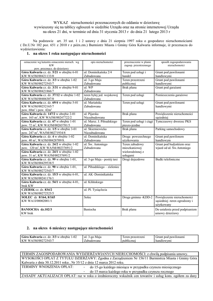 WYKAZ nieruchomości przeznaczonych do oddania w dzierżawę wywieszony się na tablicy ogłoszeń w siedzibie Urzędu oraz na stronie internetowej Urzędu na okres 21 dni, w terminie od dnia 31 stycznia 2013 r do dnia 21 lutego 2013 r Na podstawie art. 35 ust. 1 i 2 ustawy z dnia 21 sierpnia 1997 roku o gospodarce nieruchomościami ( Dz.U.Nr 102 poz. 651 z 2010 r z późn.zm.) Burmistrz Miasta i Gminy Góra Kalwaria informuje, iż przeznacza do wydzierżawienia: 1. na okres 1 roku następujące nieruchomości oznaczenie wg katastru oznaczenie nieruch. wg KW pow. przeznacz. do dzierżawy opis nieruchomości przeznaczenie w planie zagosp. przestrzennego sposób zagospodarowania nieruchomości Góra Kalwaria cz. dz. 5/21 w obrębie 6-01 KW WA5M/00421133/0 Góra Kalwaria cz. dz. 3/3 w obrębie 1-02 KW WA5M/00272543/7 Góra Kalwaria cz. dz. 3/31 w obrębie 9-01 KW WA5M/00421866/7 Góra Kalwaria cz. dz. 37/12 w obrębie 1-02 KW WA5M/00406307/0 Góra Kalwaria cz. dz. 69/4 w obrębie 5-01 KW WA5M/00252165/7 pow. 68m2 i pow. 42m2 Góra Kalwaria dz. 147/2 w obrębie 2-01 pow. 165 m2, KW WA5M/00247722/2 Góra Kalwaria cz. dz. 67 w obrębie 1-01 pow. 72 m2, KW WA5M/00265781/5 Góra Kalwaria cz. dz. 1/5 w obrębie 3-01 pow. 247 m2, WA5M/00271934/8 Góra Kalwaria cz. dz. 4 w obrębie 1-02 pow. 40 m2, WA5M/00428709/8. Góra Kalwaria cz. dz. 24/2 w obrębie 1-02 pow. 120 m2, KW WA5M/00237691/2 Góra Kalwaria cz. dz. 24/1 w obrębie 1-02 pow. 31 m2, KW WA5M/00237691/2 Góra Kalwaria cz. dz. 99 w obrębie 1-01, KW WA5M/00429538/5 Góra Kalwaria cz. dz. 90 w obrębie 1-01, KW WA5M/00272543/7 Góra Kalwaria cz. dz. 15/3 w obrębie 6-01, KW WA5M/00241176/1 Góra Kalwaria cz. dz. 54/1 w obrębie 4-01, brak KW CZERSK cz. dz. 834/2 KW WA5M/00272525/5 SOLEC dz 8/164, 8/165 KW WA1I/00002001/1 ul. Dominikańska 2/4 Zabudowana ul. 3-go Maja Zabudowana ul. WP Zabudowana teren byłej jed. wojskowej Zabudowana ul. Mariańska Zabudowana Teren pod usługi i handel Teren przestrzeni publicznej Brak planu Grunt pod pawilonami handlowymi Grunt pod pawilonami handlowymi Grunt pod garażami Teren pod usługi Pomieszczenia garażowe Teren pod usługi Grunt pod pawilonami handlowymi ul. Pijarska Niezabudowana ul. Marsz. J. Piłsudskiego Zabudowana ul. Skierniewicka Niezabudowana ul. Dominikańska Zabudowana ul. Św. Antoniego Zabudowana Brak planu Solec Droga gminna -KDD-2 Powiększenie nieruchomości sąsiedniej -teren ogrodzony i użytkowany BANIOCHA dz.102/3 KW brak Baniocha Brak planu Do ustalenia przed podpisaniem umowy dzierżawy Teren przestrzeni publicznej Grunt pod pawilonami handlowymi ul. 3-go Maja - postój taxi Powiększenie nieruchomości sąsiedniej Teren pod usługi i ciągi Tymczasowy dworzec PKS pieszo-jezdne Brak planu Parking samochodowy Droga powszechnego użytkowania Teren zabudowy mieszkaniowej wielorodzinnej z usługami Drogi dojazdowe Grunt pod pawilonem handlowym Grunt pod budynkiem oraz wjazd od ul. Św.Antoniego Budki telefoniczne ul. Piłsudskiego – zieleniec ul. AK–Dominikańska ul. Kilińskiego ul. Pl. Tysiąclecia 2. na okres 6 miesiecy następujące nieruchomości Góra Kalwaria cz. dz. 3/3 w obrębie 1-02 KW WA5M/00272543/7 ul. 3-go Maja Zabudowana TERMIN ZAGOSPODAROWANIA WYDZIERŻAWIANYCH NIERUCHOMOŚCI: z chwilą podpisania umowy. WYSOKOŚCI OPŁAT Z TYTUŁU DZIERŻAWY: Zgodna z Zarządzeniem Nr 156/11 Burmistrza Miasta i Gminy Góra Kalwaria z dnia 30.12.2011 roku , Nr 35/12 z dnia 12 marca 2012 roku. TERMINY WNOSZENIA OPŁAT: - do 15-go każdego miesiąca w przypadku czynszu miesięcznego - do 15 marca każdego roku w przypadku czynszu rocznego ZASADY AKTUALIZACJI OPŁAT: raz w roku o średnioroczny wskaźnik cen towarów i usług kons. ogółem za dany rok, w stosunku do roku poprzedzającego dany rok lub zmiana stawki wynikająca ze zmiany Zarządzenia Burmistrza w sprawie stawek czynszu dzierżawnego – dotyczy umów zawartych na okres 3 lat. Szczegółowe warunki dzierżawy zostaną określone w „umowie dzierżawy”. Osoby, którym przysługuje pierwszeństwo w nabyciu w/w nieruchomości, zgodnie z art.34 ust.1 pkt. 1 i 2 ustawy o gospodarce nieruchomościami winny złożyć wniosek o nabycie nieruchomości w terminie nie dłuższym niż 6 tygodni, licząc od dnia wywieszenia wykazu. Dodatkowych informacji można uzyskać w Referacie Geodezji i Gospodarki Nieruchomościami pokój nr 11 lub pod nr telefonów (22) 72 73 411-13 w.155 , 72 73 430 Wykaz umieszczony zostaje również na stronie internetowej Urzędu: www.gorakalwaria.pl Informację o wywieszeniu wykazu podano do publicznej wiadomości przez ogłoszenie w prasie lokalnej. Z up. Burmistrza Miasta i Gminy mgr inż. Marek Rutowicz z-ca Burmistrza