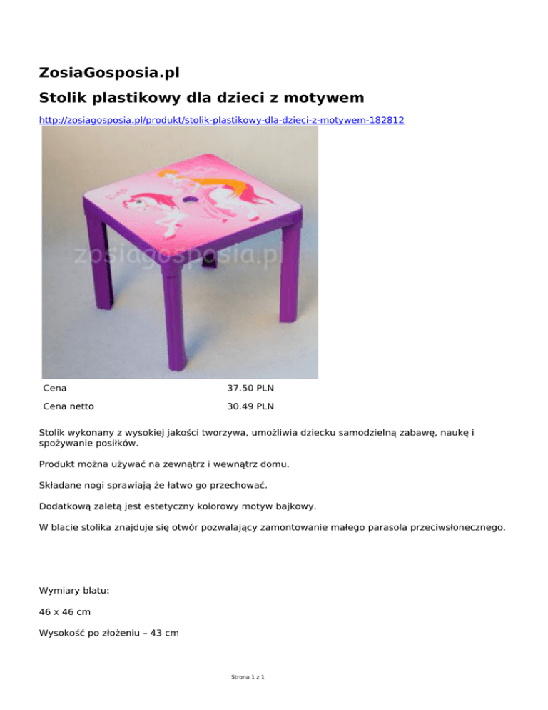 ZosiaGosposia.pl Stolik plastikowy dla dzieci z motywem http://zosiagosposia.pl/produkt/stolik-plastikowy-dla-dzieci-z-motywem-182812 Cena 37.50 PLN Cena netto 30.49 PLN Stolik wykonany z wysokiej jakości tworzywa, umożliwia dziecku samodzielną zabawę, naukę i spożywanie posiłków. Produkt można używać na zewnątrz i wewnątrz domu. Składane nogi sprawiają że łatwo go przechować. Dodatkową zaletą jest estetyczny kolorowy motyw bajkowy. W blacie stolika znajduje się otwór pozwalający zamontowanie małego parasola przeciwsłonecznego. Wymiary blatu: 46 x 46 cm Wysokość po złożeniu – 43 cm Strona 1 z 1