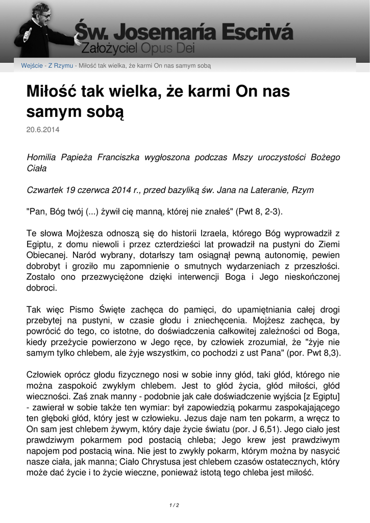 Wejście - Z Rzymu - Miłość tak wielka, że karmi On nas samym sobą Miłość tak wielka, że karmi On nas samym sobą 20.6.2014 Homilia Papieża Franciszka wygłoszona podczas Mszy uroczystości Bożego Ciała Czwartek 19 czerwca 2014 r., przed bazyliką św. Jana na Lateranie, Rzym "Pan, Bóg twój (...) żywił cię manną, której nie znałeś" (Pwt 8, 2-3). Te słowa Mojżesza odnoszą się do historii Izraela, którego Bóg wyprowadził z Egiptu, z domu niewoli i przez czterdzieści lat prowadził na pustyni do Ziemi Obiecanej. Naród wybrany, dotarłszy tam osiągnął pewną autonomię, pewien dobrobyt i groziło mu zapomnienie o smutnych wydarzeniach z przeszłości. Zostało ono przezwyciężone dzięki interwencji Boga i Jego nieskończonej dobroci. Tak więc Pismo Święte zachęca do pamięci, do upamiętniania całej drogi przebytej na pustyni, w czasie głodu i zniechęcenia. Mojżesz zachęca, by powrócić do tego, co istotne, do doświadczenia całkowitej zależności od Boga, kiedy przeżycie powierzono w Jego ręce, by człowiek zrozumiał, że "żyje nie samym tylko chlebem, ale żyje wszystkim, co pochodzi z ust Pana" (por. Pwt 8,3). Człowiek oprócz głodu fizycznego nosi w sobie inny głód, taki głód, którego nie można zaspokoić zwykłym chlebem. Jest to głód życia, głód miłości, głód wieczności. Zaś znak manny - podobnie jak całe doświadczenie wyjścia [z Egiptu] - zawierał w sobie także ten wymiar: był zapowiedzią pokarmu zaspokajającego ten głęboki głód, który jest w człowieku. Jezus daje nam ten pokarm, a wręcz to On sam jest chlebem żywym, który daje życie światu (por. J 6,51). Jego ciało jest prawdziwym pokarmem pod postacią chleba; Jego krew jest prawdziwym napojem pod postacią wina. Nie jest to zwykły pokarm, którym można by nasycić nasze ciała, jak manna; Ciało Chrystusa jest chlebem czasów ostatecznych, który może dać życie i to życie wieczne, ponieważ istotą tego chleba jest miłość. 1/2 W Eucharystii przekazywana jest miłość Boga wobec nas: miłość tak wielka, że karmi On nas samym sobą; miłość bezinteresowna, zawsze do dyspozycji każdej osoby głodnej i potrzebującej odrodzenia swych sił. Życie doświadczeniem wiary oznacza pozwolenie, by karmił nas Pan i budowanie swego życia nie na dobrach materialnych, ale na tym, co nie ginie: darach Boga, Jego Słowie i Jego Ciele. Jeśli spojrzymy wokół nas, to zdajemy sobie sprawę, że istnieje tak wiele propozycji pokarmu, które nie pochodzą od Pana i które pozornie bardziej zaspokajają. Niektóre są podsycane pieniądzem, inne sukcesem i próżnością, inne władzą i pychą. Ale pokarmem, który nas naprawdę posila i zaspokaja jest tylko ten, który daje nam Pan! Pokarm, który daje nam Pan, różni się od innych i być może nie wydaje się nam tak smaczny, jak jakieś jedzenie, które daje nam świat. Tak więc marzymy o innych posiłkach, jak Żydzi na pustyni, tęskniący za mięsem i cebulą, które jedli w Egipcie, ale zapominali, że spożywali te posiłki przy stole zniewolenia. W tych chwilach pokusy, mieli oni pamięć, ale jakąś pamięć chorą, selektywną. Każdy z nas może dziś postawić sobie pytanie: a ja? Gdzie chcę jeść? Przy jakim stole pragnę się karmić? Przy stole Pańskim? Czy też marzę, by jeść smaczne potrawy, lecz w niewoli? Jaka jest moja pamięć? Czy jest to pamięć zbawiającego mnie Pana, czy też pamięć o czosnku i cebuli niewoli? Jaką pamięcią sycę moją duszę? Ojciec nam mówi: "Żywiłem cię manną, której nie znali twoi przodkowie". Odzyskajmy pamięć i nauczmy się rozpoznawać fałszywy chleb, który oszukuje i niszczy, ponieważ jest owocem egoizmu, samowystarczalności i grzechu. Wkrótce pójdziemy w procesji za Jezusem realnie obecnym w Eucharystii. Hostia jest naszą manną, przez którą Pan daje nam samego siebie. Do Niego zwracamy się z ufnością: Jezu, broń nas przed pokusami zniewalającego nas pokarmu tego świata; oczyść naszą pamięć, aby nie była uwięziona w samolubnej i doczesnej selektywności, ale była żywą pamięcią Twojej obecności przez całe dzieje Twego ludu, pamięcią, która staje się "pamiątką" Twego gestu odkupieńczej miłości. Amen. 2/2 Powered by TCPDF (www.tcpdf.org)