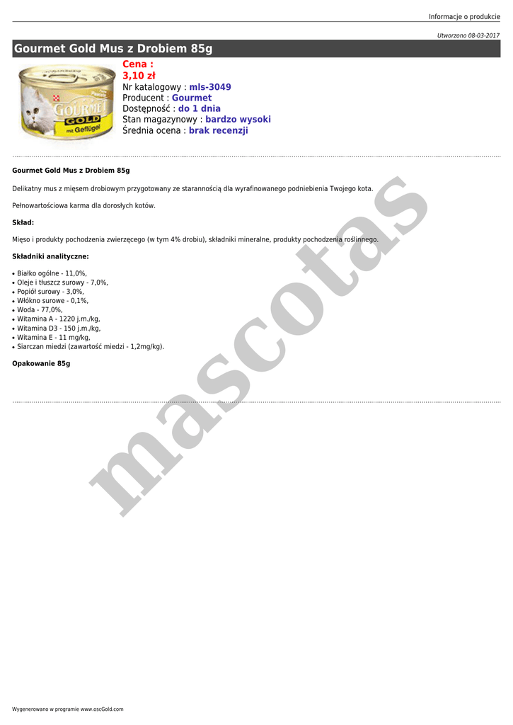 Informacje o produkcie Utworzono 08-03-2017 Gourmet Gold Mus z Drobiem 85g Cena : 3,10 zł Nr katalogowy : mls-3049 Producent : Gourmet Dostępność : do 1 dnia Stan magazynowy : bardzo wysoki Średnia ocena : brak recenzji Gourmet Gold Mus z Drobiem 85g Delikatny mus z mięsem drobiowym przygotowany ze starannością dla wyrafinowanego podniebienia Twojego kota. s Pełnowartościowa karma dla dorosłych kotów. Skład: Składniki analityczne: ● ● ● ● ● ● ● ● ● Białko ogólne - 11,0%, Oleje i tłuszcz surowy - 7,0%, Popiół surowy - 3,0%, Włókno surowe - 0,1%, Woda - 77,0%, Witamina A - 1220 j.m./kg, Witamina D3 - 150 j.m./kg, Witamina E - 11 mg/kg, Siarczan miedzi (zawartość miedzi - 1,2mg/kg). m as Opakowanie 85g co ta Mięso i produkty pochodzenia zwierzęcego (w tym 4% drobiu), składniki mineralne, produkty pochodzenia roślinnego. Wygenerowano w programie www.oscGold.com