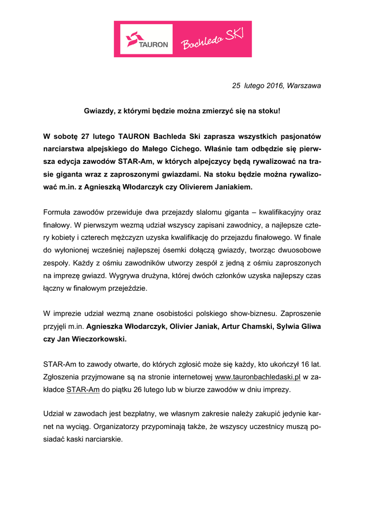 25 lutego 2016, Warszawa Gwiazdy, z którymi będzie można zmierzyć się na stoku! W sobotę 27 lutego TAURON Bachleda Ski zaprasza wszystkich pasjonatów narciarstwa alpejskiego do Małego Cichego. Właśnie tam odbędzie się pierwsza edycja zawodów STAR-Am, w których alpejczycy będą rywalizować na trasie giganta wraz z zaproszonymi gwiazdami. Na stoku będzie można rywalizować m.in. z Agnieszką Włodarczyk czy Olivierem Janiakiem. Formuła zawodów przewiduje dwa przejazdy slalomu giganta – kwalifikacyjny oraz finałowy. W pierwszym wezmą udział wszyscy zapisani zawodnicy, a najlepsze cztery kobiety i czterech mężczyzn uzyska kwalifikację do przejazdu finałowego. W finale do wyłonionej wcześniej najlepszej ósemki dołączą gwiazdy, tworząc dwuosobowe zespoły. Każdy z ośmiu zawodników utworzy zespół z jedną z ośmiu zaproszonych na imprezę gwiazd. Wygrywa drużyna, której dwóch członków uzyska najlepszy czas łączny w finałowym przejeździe. W imprezie udział wezmą znane osobistości polskiego show-biznesu. Zaproszenie przyjęli m.in. Agnieszka Włodarczyk, Olivier Janiak, Artur Chamski, Sylwia Gliwa czy Jan Wieczorkowski. STAR-Am to zawody otwarte, do których zgłosić może się każdy, kto ukończył 16 lat. Zgłoszenia przyjmowane są na stronie internetowej www.tauronbachledaski.pl w zakładce STAR-Am do piątku 26 lutego lub w biurze zawodów w dniu imprezy. Udział w zawodach jest bezpłatny, we własnym zakresie należy zakupić jedynie karnet na wyciąg. Organizatorzy przypominają także, że wszyscy uczestnicy muszą posiadać kaski narciarskie. Pełny kalendarz imprez oraz więcej informacji o projekcie TAURON Bachleda Ski, znaleźć można na stronie internetowej www.tauronbachledaski.pl oraz na facebook.com/TauronBachledaSki. Kontakt dla mediów: Andrzej Lesiewski [email protected] +48 512 348 232 TAURON Polska Energia SA jest spółką holdingową w grupie kapitałowej, która zajmuje się wydobyciem węgla, wytwarzaniem, dystrybucją i sprzedażą energii. Grupa TAURON wraz z GZE obejmuje swoim działaniem 18 proc. powierzchni kraju i jest największym sprzedawcą i dystrybutorem energii w Polsce oraz jednym z największych podmiotów gospodarczych w kraju. W skład Grupy TAURON wchodzą m.in. TAURON Wydobycie, TAURON Wytwarzanie, TAURON Ekoenergia, TAURON Ciepło, TAURON Dystrybucja, TAURON Sprzedaż oraz TAURON Obsługa Klienta. Andrzej Bachleda-Curuś II – (ur. 2 stycznia 1947 roku w Zakopanem) to najbardziej utytułowany polski narciarz alpejski. Dwukrotnie reprezentował Polskę na Igrzyskach Olimpijskich – w 1968 roku w Grenoble, gdzie zdobył 6. lokatę w slalomie specjalnym oraz w Sapporo w roku 1972, plasując się na 9. pozycji w slalomie gigancie. W jego kolekcji znajdują się też medale Narciarskich Mistrzostw Świata - brąz za kombinację alpejską w Val Gardena w 1970 roku oraz srebro zdobyte w 1974 w St. Moritz w tej samej konkurencji. Wybitnym wynikiem było też 2. miejsce w slalomowej klasyfikacji Pucharu Świata i 6. miejsce w klasyfikacji generalnej w sezonie 1971/1972. Andrzej Bachleda-Curuś wielokrotnie tryumfował też na Zimowych Uniwersjadach i Spartakiadach Armii Zaprzyjaźnionych. Na najwyższym podium Mistrzostw Polski stawał aż 14 razy. W trakcie swojej kariery ścigał się z największymi legendami narciarstwa alpejskiego, takimi jak Jean Claude Killy czy Gustavo Thöni. Jest pierwszym Polakiem uhonorowanym prestiżową nagrodą „Fair Play” przyznawaną przez UNESCO. W 2009 roku otrzymał Krzyż Kawalerski Orderu Odrodzenia Polski.
