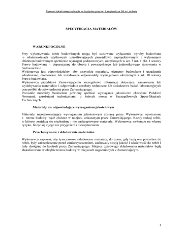 Remont lokali mieszkalnych w budynku przy ul. Langiewicza 26 w Lublinie SPECYFIKACJA MATERIAŁÓW WARUNKI OGÓLNE Przy wykonywaniu robót budowlanych mogą być stosowane wyłączenie wyroby budowlane o właściwościach użytkowych umożliwiających prawidłowo zaprojektowanym i wykonanym obiektom budowlanym spełnienie wymagań podstawowych, określonych w art. 5 ust. 1 pkt. 1 ustawy Prawo budowlane – dopuszczone do obrotu i powszechnego lub jednostkowego stosowania w budownictwie. Wykonawca jest odpowiedzialny, aby wszystkie materiały, elementy budowlane i urządzenia wbudowane, montowane lub instalowane odpowiadały wymaganiom określonym a art. 10 ustawy Prawo budowlane. Wykonawca przedstawi Zamawiającemu szczegółowe informacje dotyczące, zamawiania lub wydobywania materiałów i odpowiednie aprobaty techniczne lub świadectwa badań laboratoryjnych oraz próbki do zatwierdzenia przez Zamawiającego. Pozostałe materiały budowlane powinny spełniać wymagania jakościowe określone Polskimi Normami, aprobatami technicznymi, o których mowa w Szczegółowych Specyfikacjach Technicznych. Materiały nie odpowiadające wymaganiom jakościowym Materiały nieodpowiadające wymaganiom jakościowym zostaną przez Wykonawcę wywiezione z terenu budowy, bądź złożone w miejscu wskazanym przez Zamawiającego. Każdy rodzaj robót, w którym znajdują się niezbadane i nie zaakceptowane materiały, Wykonawca wykonuje na własne ryzyko, licząc się z jego nie przyjęciem i niezapłaceniem. Przechowywanie i składowanie materiałów Wykonawca zapewni, aby tymczasowo składowane materiały, do czasu, gdy będą one potrzebne do robót, były zabezpieczone przed zanieczyszczeniem, zachowały swoją jakość i właściwość do robót i były dostępne do kontroli przez Zamawiającego. Miejsca czasowego składowania materiałów będą zlokalizowane w obrębie terenu budowy w miejscach uzgodnionych z Zamawiającym. 1 Remont lokali mieszkalnych w budynku przy ul. Langiewicza 26 w Lublinie SZCZEGÓŁOWE WYMOGI TECHNICZNE Płytki ceramiczne 1. Płytki powinny odpowiadać następującym normom: Glazura szkliwiona Nasiąkliwość Odporność na plamienie Wytrzymałość na zginanie Twardość Terakota - Nasiąkliwość Antypoślizgowość Grubość Odporność na ścieranie Wytrzymałość na zginanie Twardość 2. < 10 min. Klasa 4 min. 15N/mm2 3-4 wg. skali MOSHA <3 min. R 9 min. 9 mm min. PEI 3 min. 22 N/mm2 5-6 wg. skali MOSHA Listwa wykańczająca Dobrana kolorystycznie i rozmiarowo do glazury 3. Klej do płytek Kleje do mocowania płytek ceramicznych muszą spełniać wymagania PN-EN 12004:2002 lub odpowiednich aprobat technicznych. Stosować zaprawę klejową modyfikowaną polimerami, wodoodporną o przyczepności do podłoża i płytek nie mniejszej niż 2 MPa. Zaprawy do spoinowania musza spełniać wymagania odpowiednich aprobat technicznych lub norm. 4. Zaprawa fugowa Stosować zaprawę fugową wodoodporną, o podwyższonej elastyczności. Rodzaj zaprawy dostosować do szerokości fug. 5. Izolacja wodochronna Folia w płynie, powinna odpowiadać następującym normom: Zużycie Czas schnięcia Przyczepność początkowa Przyczepność po działaniu wodą przyczepność po starzeniu termicznym Wodoszczelność ok.1,4 kg/m2 na 1mm grubości warstwy ok 3 godziny (pierwsza warstwa), ok 4 godz (każda kolejna warstwa) ≥ 0,5 N/mm² ≥ 0,5 N/mm² ≥ 0,5 N/mm² Brak przepuszczalności 2 Remont lokali mieszkalnych w budynku przy ul. Langiewicza 26 w Lublinie 6. Silikon do fug Należy stosować silikon o dobrej przyczepności do podłoży na które będzie nanoszony, z dodatkiem środka grzybobójczego, w kolorze fugi. 7. Zaprawa samopoziomująca Stosować zaprawę samopoziomującą o przyczepności do podłoża nie mniejszej niż 2 MPa , kompatybilną z pozostałymi produktami (np. klejem). 8. Farby Farba olejna do gruntowania i ogólnego stosowania wg PN-C-81901:2002 wydajność 6–8 m2/dm3 czas schnięcia do 12 h Kolor: biały mat Farba akrylowa Kolor: biała Zużycie od 0,10 l/m² na warstwę Krycie jakościowe- stopień III Klasa odporności na szorowanie na mokro - Kategoria III Biały montaż i armatura 9. Kabiny prysznicowe z brodzikiem 80x80 cm, wykonane ze szkła hartowanego. Kompakt WC, stojący, wykonany z ceramiki sanitarnej, z odpływem poziomym, z deską w kolorze białym, wykonanej z twardego plastiku. Umywalki wiszące, ceramiczne, owalne o szerokości min. 50 cm wraz z baterią łazienkową Nad umywalkami zamieszczone ma być jedno prostokątne lustro. W skład galanterii łazienkowej dodatkowo wchodzą mydelniczka ścienna, uchwyt na papier toaletowy, wieszak na ręczniki (musi pomieścić min. 3 ręczniki). 3