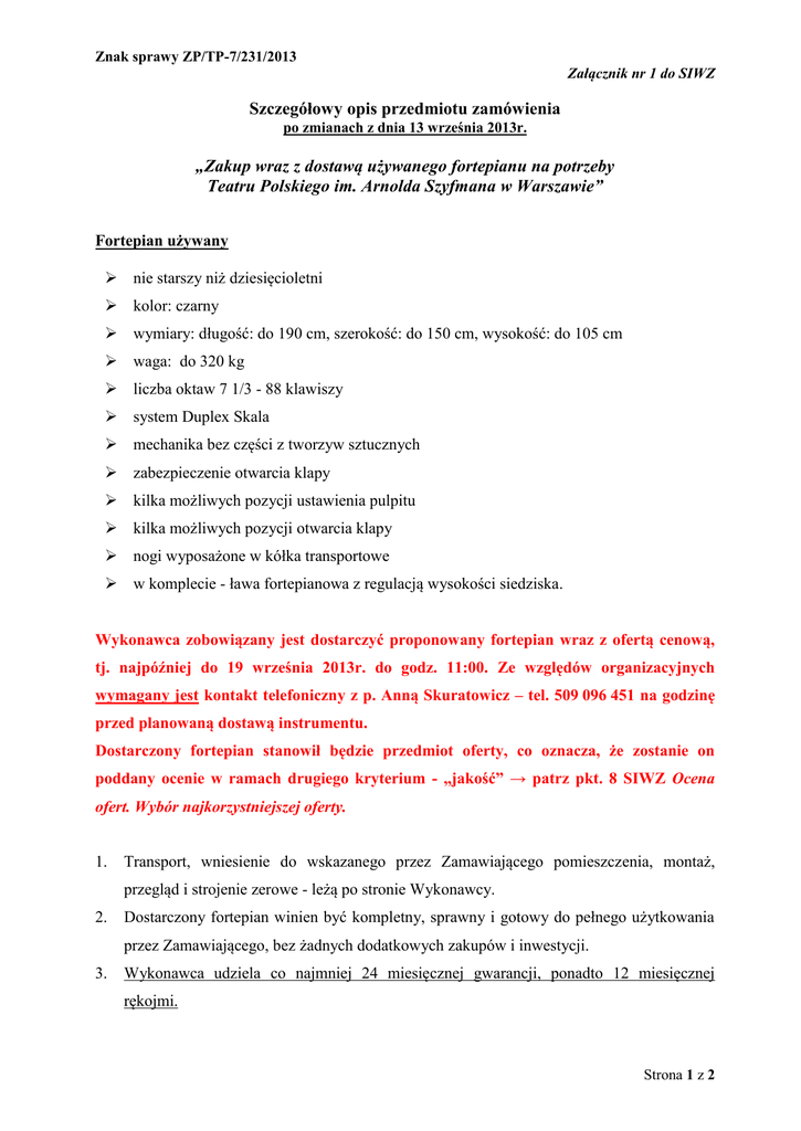 Znak sprawy ZP/TP-7/231/2013 Załącznik nr 1 do SIWZ Szczegółowy opis przedmiotu zamówienia po zmianach z dnia 13 września 2013r. „Zakup wraz z dostawą używanego fortepianu na potrzeby Teatru Polskiego im. Arnolda Szyfmana w Warszawie” Fortepian używany nie starszy niż dziesięcioletni kolor: czarny wymiary: długość: do 190 cm, szerokość: do 150 cm, wysokość: do 105 cm waga: do 320 kg liczba oktaw 7 1/3 - 88 klawiszy system Duplex Skala mechanika bez części z tworzyw sztucznych zabezpieczenie otwarcia klapy kilka możliwych pozycji ustawienia pulpitu kilka możliwych pozycji otwarcia klapy nogi wyposażone w kółka transportowe w komplecie - ława fortepianowa z regulacją wysokości siedziska. Wykonawca zobowiązany jest dostarczyć proponowany fortepian wraz z ofertą cenową, tj. najpóźniej do 19 września 2013r. do godz. 11:00. Ze względów organizacyjnych wymagany jest kontakt telefoniczny z p. Anną Skuratowicz – tel. 509 096 451 na godzinę przed planowaną dostawą instrumentu. Dostarczony fortepian stanowił będzie przedmiot oferty, co oznacza, że zostanie on poddany ocenie w ramach drugiego kryterium - „jakość” → patrz pkt. 8 SIWZ Ocena ofert. Wybór najkorzystniejszej oferty. 1. Transport, wniesienie do wskazanego przez Zamawiającego pomieszczenia, montaż, przegląd i strojenie zerowe - leżą po stronie Wykonawcy. 2. Dostarczony fortepian winien być kompletny, sprawny i gotowy do pełnego użytkowania przez Zamawiającego, bez żadnych dodatkowych zakupów i inwestycji. 3. Wykonawca udziela co najmniej 24 miesięcznej gwarancji, ponadto 12 miesięcznej rękojmi. Strona 1 z 2 Znak sprawy ZP/TP-7/231/2013 Załącznik nr 1 do SIWZ Szczegółowy opis przedmiotu zamówienia po zmianach z dnia 13 września 2013r. „Zakup wraz z dostawą używanego fortepianu na potrzeby Teatru Polskiego im. Arnolda Szyfmana w Warszawie” Uwaga: W ciągu maksymalnie 3 (trzech) dni od dnia zamieszczenia informacji o wyborze najkorzystniejszej oferty na stronie internetowej Zamawiającego, Wykonawcy których oferty nie zostały wybrane - zobowiązani są do odbioru na swój koszt dostarczonych przez nich w ramach przedmiotowego postępowania fortepianów. Ze względów organizacyjnych wymagany jest kontakt telefoniczny z p. Anną Skuratowicz – tel. 509 096 451 na godzinę przed planowanym odbiorem instrumentu. Strona 2 z 2
