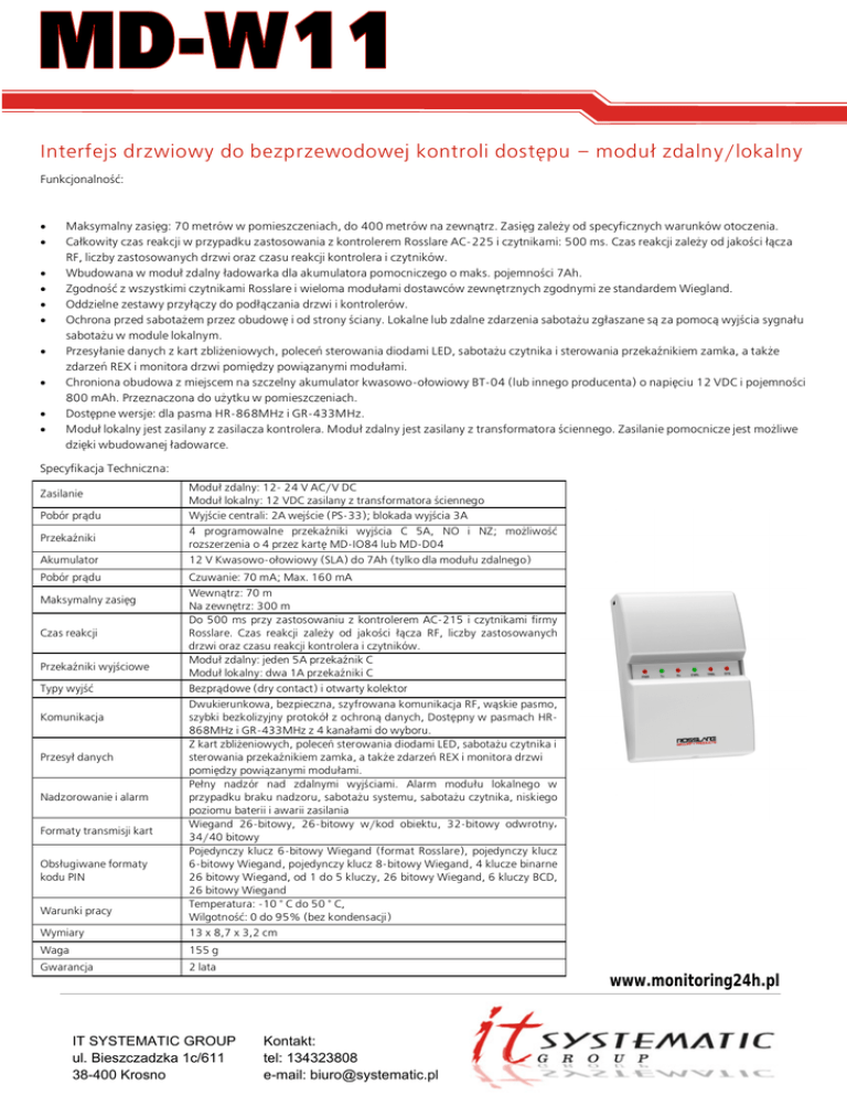 Interfejs drzwiowy do bezprzewodowej kontroli dostępu – moduł zdalny/lokalny Funkcjonalność: Maksymalny zasięg: 70 metrów w pomieszczeniach, do 400 metrów na zewnątrz. Zasięg zależy od specyficznych warunków otoczenia. Całkowity czas reakcji w przypadku zastosowania z kontrolerem Rosslare AC-225 i czytnikami: 500 ms. Czas reakcji zależy od jakości łącza RF, liczby zastosowanych drzwi oraz czasu reakcji kontrolera i czytników. Wbudowana w moduł zdalny ładowarka dla akumulatora pomocniczego o maks. pojemności 7Ah. Zgodność z wszystkimi czytnikami Rosslare i wieloma modułami dostawców zewnętrznych zgodnymi ze standardem Wiegland. Oddzielne zestawy przyłączy do podłączania drzwi i kontrolerów. Ochrona przed sabotażem przez obudowę i od strony ściany. Lokalne lub zdalne zdarzenia sabotażu zgłaszane są za pomocą wyjścia sygnału sabotażu w module lokalnym. Przesyłanie danych z kart zbliżeniowych, poleceń sterowania diodami LED, sabotażu czytnika i sterowania przekaźnikiem zamka, a także zdarzeń REX i monitora drzwi pomiędzy powiązanymi modułami. Chroniona obudowa z miejscem na szczelny akumulator kwasowo-ołowiowy BT-04 (lub innego producenta) o napięciu 12 VDC i pojemności 800 mAh. Przeznaczona do użytku w pomieszczeniach. Dostępne wersje: dla pasma HR-868MHz i GR-433MHz. Moduł lokalny jest zasilany z zasilacza kontrolera. Moduł zdalny jest zasilany z transformatora ściennego. Zasilanie pomocnicze jest możliwe dzięki wbudowanej ładowarce. Specyfikacja Techniczna: Zasilanie Pobór prądu Moduł zdalny: 12- 24 V AC/V DC Moduł lokalny: 12 VDC zasilany z transformatora ściennego Wyjście centrali: 2A wejście (PS-33); blokada wyjścia 3A Akumulator 4 programowalne przekaźniki wyjścia C 5A, NO i NZ; możliwość rozszerzenia o 4 przez kartę MD-IO84 lub MD-D04 12 V Kwasowo-ołowiowy (SLA) do 7Ah (tylko dla modułu zdalnego) Pobór prądu Czuwanie: 70 mA; Max. 160 mA Przekaźniki Maksymalny zasięg Czas reakcji Przekaźniki wyjściowe Typy wyjść Komunikacja Przesył danych Nadzorowanie i alarm Formaty transmisji kart Obsługiwane formaty kodu PIN Warunki pracy Wewnątrz: 70 m Na zewnętrz: 300 m Do 500 ms przy zastosowaniu z kontrolerem AC-215 i czytnikami firmy Rosslare. Czas reakcji zależy od jakości łącza RF, liczby zastosowanych drzwi oraz czasu reakcji kontrolera i czytników. Moduł zdalny: jeden 5A przekaźnik C Moduł lokalny: dwa 1A przekaźniki C Bezprądowe (dry contact) i otwarty kolektor Dwukierunkowa, bezpieczna, szyfrowana komunikacja RF, wąskie pasmo, szybki bezkolizyjny protokół z ochroną danych, Dostępny w pasmach HR868MHz i GR-433MHz z 4 kanałami do wyboru. Z kart zbliżeniowych, poleceń sterowania diodami LED, sabotażu czytnika i sterowania przekaźnikiem zamka, a także zdarzeń REX i monitora drzwi pomiędzy powiązanymi modułami. Pełny nadzór nad zdalnymi wyjściami. Alarm modułu lokalnego w przypadku braku nadzoru, sabotażu systemu, sabotażu czytnika, niskiego poziomu baterii i awarii zasilania Wiegand 26-bitowy, 26-bitowy w/kod obiektu, 32-bitowy odwrotny, 34/40 bitowy Pojedynczy klucz 6-bitowy Wiegand (format Rosslare), pojedynczy klucz 6-bitowy Wiegand, pojedynczy klucz 8-bitowy Wiegand, 4 klucze binarne 26 bitowy Wiegand, od 1 do 5 kluczy, 26 bitowy Wiegand, 6 kluczy BCD, 26 bitowy Wiegand Temperatura: -10 ° C do 50 ° C, Wilgotność: 0 do 95% (bez kondensacji) Wymiary 13 x 8,7 x 3,2 cm Waga 155 g Gwarancja 2 lata IT SYSTEMATIC GROUP ul. Bieszczadzka 1c/611 38-400 Krosno www.monitoring24h.pl Kontakt: tel: 134323808 e-mail: [email protected]