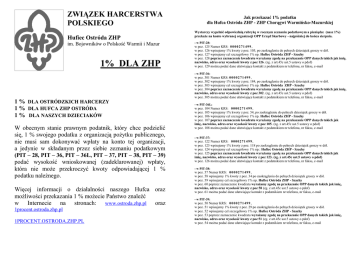 ZWIĄZEK HARCERSTWA POLSKIEGO Hufiec Ostróda ZHP im. Bojowników o Polskość Warmii i Mazur 1% DLA ZHP Jak przekazać 1% podatku dla Hufca Ostróda ZHP - ZHP Chorągwi Warmińsko-Mazurskiej Wystarczy wypełnić odpowiednią rubrykę w rocznym zeznaniu podatkowym a pieniądze (nasz 1%) przekaże na konto wybranej organizacji OPP Urząd Skarbowy - najpóźniej do końca sierpnia. - w PIT-28: w poz. 125 Numer KRS: 0 0 0 0 2 7 1 4 9 9 , w poz. 126 wpisujemy 1% kwoty z poz. 105, po zaokrągleniu do pełnych dziesiątek groszy w dół. w poz. 127 wpisujemy cel szczegółowy 1% np. Hufiec Ostróda ZHP - Szachy w poz. 128 poprzez zaznaczenie kwadratu wyrażamy zgodę na przekazanie OPP danych takich jak imię, nazwisko, adres oraz wysokość kwoty z poz 126. (zg. z art.45c ust.5 ustawy o pdof) w poz. 129 można podać dane ułatwiające kontakt z podatnikiem nr telefonu, nr faksu, e-mail - w PIT-36: 1 % DLA OSTRÓDZKICH HARCERZY 1 % DLA HUFCA ZHP OSTRÓDA 1 % DLA NASZYCH DZIECIAKÓW W obecnym stanie prawnym podatnik, który chce podzielić się, 1 % swojego podatku z organizacją pożytku publicznego, nie musi sam dokonywać wpłaty na konto tej organizacji, a jedynie w składanym przez siebie zeznaniu podatkowym (PIT – 28, PIT – 36, PIT – 36L, PIT – 37, PIT – 38, PIT – 39) podać wysokość wnioskowanej (zadeklarowanej) wpłaty, która nie może przekroczyć kwoty odpowiadającej 1 % podatku należnego. Więcej informacji o działalności naszego Hufca oraz możliwości przekazania 1 % możecie Państwo znaleźć w Internecie na stronach: www.ostroda.zhp.pl oraz 1procent.ostroda.zhp.pl 1PROCENT.OSTRODA.ZHP.PL w poz. 301 Numer KRS: 0 0 0 0 2 7 1 4 9 9 , w poz. 302 wpisujemy 1% kwoty z poz. 184, po zaokrągleniu do pełnych dziesiątek groszy w dół. w poz. 303 wpisujemy cel szczegółowy 1% np. Hufiec Ostróda ZHP - Szachy w poz. 304 poprzez zaznaczenie kwadratu wyrażamy zgodę na przekazanie OPP danych takich jak imię, nazwisko, adres oraz wysokość kwoty z poz 302. (zg. z art.45c ust.5 ustawy o pdof) w poz. 305 można podać dane ułatwiające kontakt z podatnikiem nr telefonu, nr faksu, e-mail - w PIT-36L: w poz. 104 Numer KRS: 0 0 0 0 2 7 1 4 9 9 , w poz. 105 wpisujemy 1% kwoty z poz. 54, po zaokrągleniu do pełnych dziesiątek groszy w dół. w poz. 106 wpisujemy cel szczegółowy 1% np. Hufiec Ostróda ZHP - Szachy w poz. 107 poprzez zaznaczenie kwadratu wyrażamy zgodę na przekazanie OPP danych takich jak imię, nazwisko, adres oraz wysokość kwoty z poz 105. (zg. z art.45c ust.5 ustawy o pdof) w poz. 108 można podać dane ułatwiające kontakt z podatnikiem nr telefonu, nr faksu, e-mail - w PIT-37: w poz. 122 Numer KRS: 0 0 0 0 2 7 1 4 9 9 , w poz. 123 wpisujemy 1% kwoty z poz. 118 po zaokrągleniu do pełnych dziesiątek groszy w dół. w poz. 124 wpisujemy cel szczegółowy 1% np.: Hufiec Ostróda ZHP - Szachy w poz. 125 poprzez zaznaczenie kwadratu wyrażamy zgodę na przekazanie OPP danych takich jak imię, nazwisko, adres oraz wysokość kwoty z poz 123. (zg. z art.45c ust.5 ustawy o pdof) w poz. 126 można podać dane ułatwiające kontakt z podatnikiem nr telefonu, nr faksu, e-mail - w PIT-38: w poz. 57 Numer KRS: 0 0 0 0 2 7 1 4 9 9 , w poz. 58 wpisujemy 1% kwoty z poz. 34 po zaokrągleniu do pełnych dziesiątek groszy w dół. w poz. 59 wpisujemy cel szczegółowy 1% np. Hufiec Ostróda ZHP - Szachy w poz. 60 poprzez zaznaczenie kwadratu wyrażamy zgodę na przekazanie OPP danych takich jak imię, nazwisko, adres oraz wysokość kwoty z poz 58 (zg. z art.45c ust.5 ustawy o pdof) w poz. 61 można podać dane ułatwiające kontakt z podatnikiem nr telefonu, nr faksu, e-mail - w PIT-39: w poz. 50 Numer KRS: 0 0 0 0 2 7 1 4 9 9 , w poz. 51 wpisujemy 1% kwoty z poz. 29 po zaokrągleniu do pełnych dziesiątek groszy w dół. w poz. 52 wpisujemy cel szczegółowy 1% np. Hufiec Ostróda ZHP - Szachy w poz. 53 poprzez zaznaczenie kwadratu wyrażamy zgodę na przekazanie OPP danych takich jak imię, nazwisko, adres oraz wysokość kwoty z poz 51 (zg. z art.45c ust.5 ustawy o pdof) w poz. 54 można podać dane ułatwiające kontakt z podatnikiem nr telefonu, nr faksu, e-mail