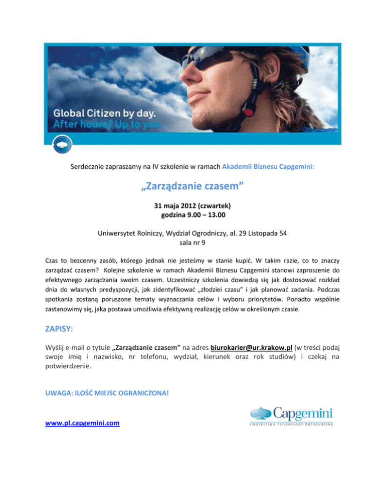 Serdecznie zapraszamy na IV szkolenie w ramach Akademii Biznesu Capgemini: „Zarządzanie czasem” 31 maja 2012 (czwartek) godzina 9.00 – 13.00 Uniwersytet Rolniczy, Wydział Ogrodniczy, al. 29 Listopada 54 sala nr 9 Czas to bezcenny zasób, którego jednak nie jesteśmy w stanie kupid. W takim razie, co to znaczy zarządzad czasem? Kolejne szkolenie w ramach Akademii Biznesu Capgemini stanowi zaproszenie do efektywnego zarządzania swoim czasem. Uczestniczy szkolenia dowiedzą się jak dostosowad rozkład dnia do własnych predyspozycji, jak zidentyfikowad „złodziei czasu” i jak planowad zadania. Podczas spotkania zostaną poruszone tematy wyznaczania celów i wyboru priorytetów. Ponadto wspólnie zastanowimy się, jaka postawa umożliwia efektywną realizację celów w określonym czasie. ZAPISY: Wyślij e-mail o tytule „Zarządzanie czasem” na adres [email protected] (w treści podaj swoje imię i nazwisko, nr telefonu, wydział, kierunek oraz rok studiów) i czekaj na potwierdzenie. UWAGA: ILOŚĆ MIEJSC OGRANICZONA! www.pl.capgemini.com