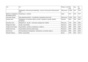 Aut. Tyt. Miejsce wyd. Rok wyd. Syg. Nr inw. Manipulacja i obrona przed manipulacją : sesja na Uniwersytecie Warszawskim 1981. [Warszawa] [1984] SOC 5186 Butkiewicz Magdalena, Manipulacja w mediach. Konopacka Sylwia Opole 2012 SOC 5197 Głowiński Michał Opis papieskiej podróży : [z problemów manipulacji językowej]. [Warszawa] [1983] SOC 5185 Jarmuła Anna Manipulacja i wywieranie wpływu na ludzi : [podstawy, metody, techniki, przykłady]. Wrocław 2006 SOC 4603 Kirschner Josef Manipulować - ale jak? : osiem praw postępowani z ludźmi. Warszawa 1994 SOC 5082 Podgórecki Adam Zasady socjotechniki. Warszawa 1966 SOC 3719 Trejderowski Tomasz Socjotechnika : podstawy manipulacji w praktyce. Warszawa 2009 SOC 3889 Ziółkowski Jacek Socjotechnika autorytetu politycznego. Warszawa 2007 SOC 3890 Znyk Paweł Od komunikacji do manipulacji : mechanizmy wywierania wpływu. Kežmarok 2008 SOC 4028 Żeleźnik Tadeusz Wobec socjotechniki. Kielce 1998 SOC 2523