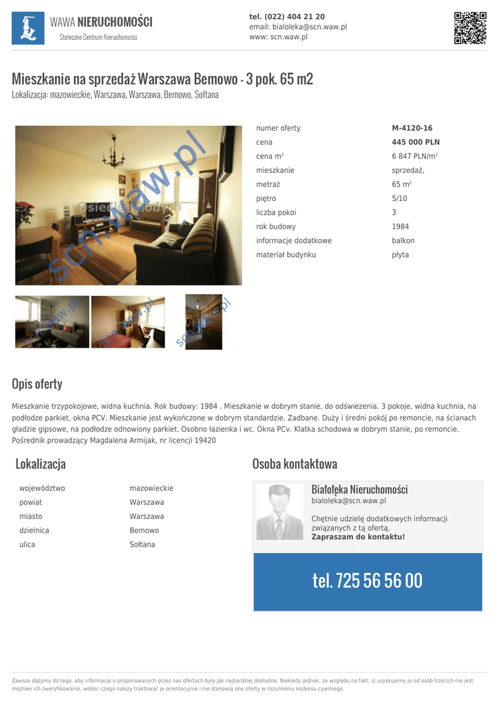 tel. (022) 404 21 20 email: [email protected] www: scn.waw.pl Mieszkanie na sprzedaż Warszawa Bemowo - 3 pok. 65 m2 Lokalizacja: mazowieckie, Warszawa, Warszawa, Bemowo, Sołtana numer oferty M-4120-16 cena 445 000 PLN cena m 6 847 PLN/m2 mieszkanie sprzedaż, metraż 65 m2 piętro 5/10 liczba pokoi 3 rok budowy 1984 informacje dodatkowe balkon materiał budynku płyta 2 Opis oferty Mieszkanie trzypokojowe, widna kuchnia. Rok budowy: 1984 . Mieszkanie w dobrym stanie, do odświezenia. 3 pokoje, widna kuchnia, na podłodze parkiet, okna PCV. Mieszkanie jest wykończone w dobrym standardzie. Zadbane. Duży i średni pokój po remoncie, na ścianach gładzie gipsowe, na podłodze odnowiony parkiet. Osobno łazienka i wc. Okna PCv. Klatka schodowa w dobrym stanie, po remoncie. Pośrednik prowadzący Magdalena Armijak, nr licencji 19420 Lokalizacja Osoba kontaktowa Białołęka Nieruchomości województwo mazowieckie powiat Warszawa [email protected] miasto Warszawa dzielnica Bemowo ulica Sołtana Chętnie udzielę dodatkowych informacji związanych z tą ofertą. Zapraszam do kontaktu! tel. 725 56 56 00 Zawsze dążymy do tego, aby informacje o proponowanych przez nas ofertach były jak najbardziej dokładne. Niekiedy jednak, ze względu na fakt, iż uzyskujemy je od osób trzecich nie jest możliwe ich zweryfikowanie, wobec czego należy traktować je orientacyjnie i nie stanowią one oferty w rozumieniu kodeksu cywilnego.