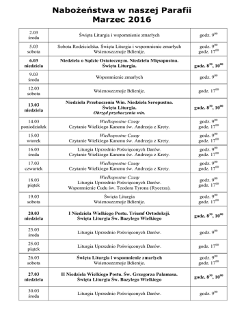 Nabożeństwa w naszej Parafii Marzec 2016 2.03 środa Święta Liturgia i wspomnienie zmarłych godz. 900 5.03 sobota Sobota Rodzicielska. Święta Liturgia i wspomnienie zmarłych Wsienoszcznoje Bdienije. godz. 900 godz. 1700 6.03 niedziela Niedziela o Sądzie Ostatecznym. Niedziela Mięsopustna. Święta Liturgia. godz. 830, 1000 9.03 środa Wspomnienie zmarłych godz. 900 12.03 sobota Wsienoszcznoje Bdienije. godz. 1700 13.03 niedziela Niedziela Przebaczenia Win. Niedziela Seropustna. Święta Liturgia. Obrzęd przebaczenia win. godz. 830, 1000 14.03 poniedziałek Wielkopostne Czasy Czytanie Wielkiego Kanonu św. Andrzeja z Krety. godz. 900 godz. 1700 15.03 wtorek Wielkopostne Czasy Czytanie Wielkiego Kanonu św. Andrzeja z Krety. godz. 900 godz. 1700 16.03 środa Liturgia Uprzednio Poświęconych Darów. Czytanie Wielkiego Kanonu św. Andrzeja z Krety. godz. 900 godz. 1700 17.03 czwartek Wielkopostne Czasy Czytanie Wielkiego Kanonu św. Andrzeja z Krety. godz. 900 godz. 1700 18.03 piątek Wielkopostne Czasy Liturgia Uprzednio Poświęconych Darów. Wspomnienie Cudu św. Teodora Tyrona (Rycerza). godz. 900 godz. 1700 19.03 sobota Święta Liturgia Wsienoszcznoje Bdienije. godz. 900 godz. 1700 20.03 niedziela I Niedziela Wielkiego Postu. Triumf Ortodoksji. Święta Liturgia Św. Bazylego Wielkiego godz. 830, 1000 23.03 środa Liturgia Uprzednio Poświęconych Darów. godz. 900 25.03 piątek Liturgia Uprzednio Poświęconych Darów. godz. 1700 26.03 sobota Święta Liturgia i wspomnienie zmarłych Wsienoszcznoje Bdienije. godz. 900 godz. 1700 27.03 niedziela II Niedziela Wielkiego Postu. Św. Grzegorza Palamasa. Święta Liturgia Św. Bazylego Wielkiego godz. 830, 1000 30.03 środa Liturgia Uprzednio Poświęconych Darów. godz. 900