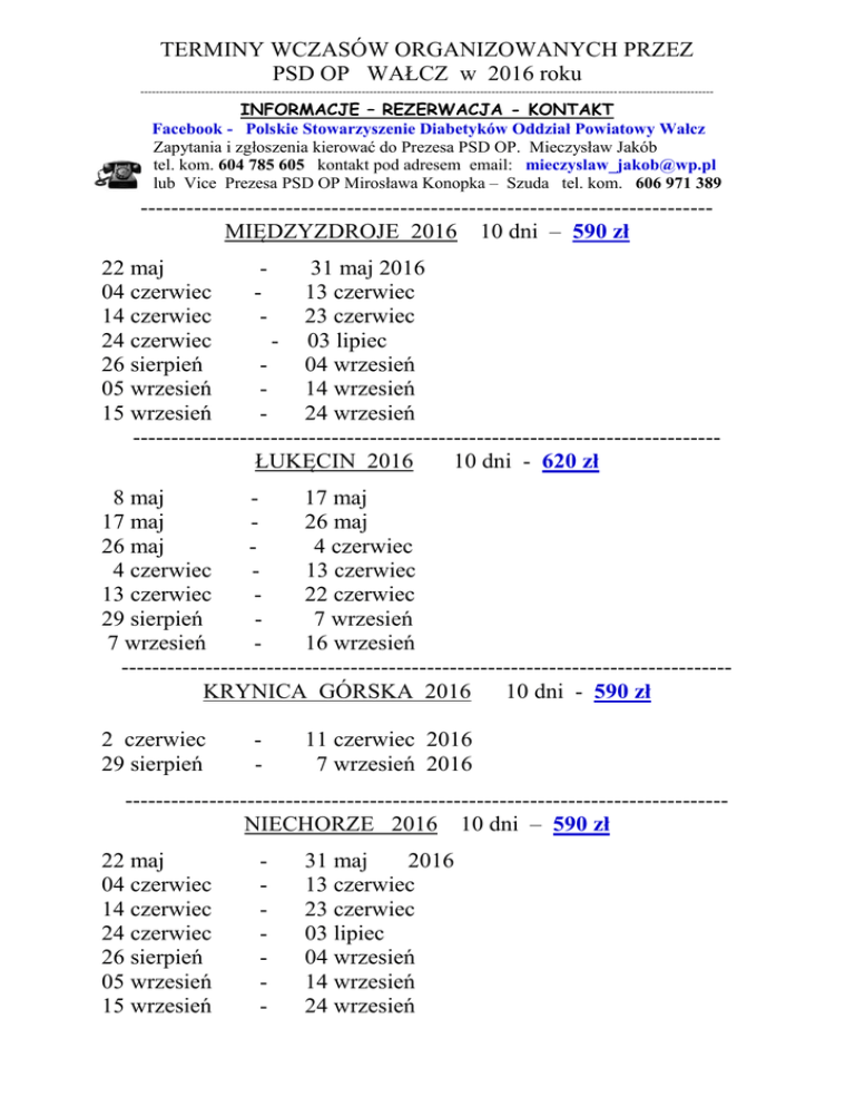 TERMINY WCZASÓW ORGANIZOWANYCH PRZEZ PSD OP WAŁCZ w 2016 roku ------------------------------------------------------------------------------------------------------------------------------------------------------ INFORMACJE – REZERWACJA - KONTAKT Facebook - Polskie Stowarzyszenie Diabetyków Oddział Powiatowy Wałcz Zapytania i zgłoszenia kierować do Prezesa PSD OP. Mieczysław Jakób tel. kom. 604 785 605 kontakt pod adresem email: [email protected] lub Vice Prezesa PSD OP Mirosława Konopka – Szuda tel. kom. 606 971 389 --------------------------------------------------------------------------MIĘDZYZDROJE 2016 10 dni – 590 zł 22 maj 31 maj 2016 04 czerwiec 13 czerwiec 14 czerwiec 23 czerwiec 24 czerwiec - 03 lipiec 26 sierpień 04 wrzesień 05 wrzesień 14 wrzesień 15 wrzesień 24 wrzesień ----------------------------------------------------------------------------ŁUKĘCIN 2016 10 dni - 620 zł 8 maj 17 maj 17 maj 26 maj 26 maj 4 czerwiec 4 czerwiec 13 czerwiec 13 czerwiec 22 czerwiec 29 sierpień 7 wrzesień 7 wrzesień 16 wrzesień -------------------------------------------------------------------------------KRYNICA GÓRSKA 2016 10 dni - 590 zł 2 czerwiec 29 sierpień - 11 czerwiec 2016 7 wrzesień 2016 ------------------------------------------------------------------------------NIECHORZE 2016 10 dni – 590 zł 22 maj 04 czerwiec 14 czerwiec 24 czerwiec 26 sierpień 05 wrzesień 15 wrzesień - 31 maj 2016 13 czerwiec 23 czerwiec 03 lipiec 04 wrzesień 14 wrzesień 24 wrzesień