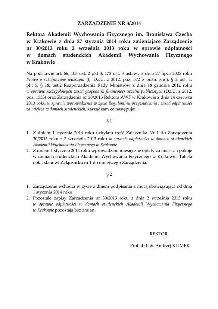 ZARZĄDZENIE NR 3/2014 Rektora Akademii Wychowania Fizycznego im. Bronisława Czecha w Krakowie z dnia 27 stycznia 2014 roku zmieniające Zarządzenie nr 30/2013 roku 2 września 2013 roku w sprawie odpłatności w domach studenckich Akademii Wychowania Fizycznego w Krakowie Na podstawie art. 66, 103 ust. 2 pkt 3, 173 ust. 3 ustawy z dnia 27 lipca 2005 roku Prawo o szkolnictwie wyższym (tj. Dz.U. z 2012, poz. 572 z późn. zm.), § 2 ust. 1, pkt 5, § 18, ust.2 Rozporządzenia Rady Ministrów z dnia 18 grudnia 2012 roku w sprawie szczegółowych zasad gospodarki finansowej uczelni publicznych (Dz.U. z 2012, poz. 1533) oraz Zarządzenia nr 20/2013 Rektora AWF w Krakowie z dnia 14 czerwca 2013 roku w sprawie wprowadzenia w życie Regulaminu przyznawania i zasad odpłatności za miejsca w domach studenckich, zarządzam co następuje: § 1 1. Z dniem 1 stycznia 2014 roku uchylam treść Załącznika Nr 1 do Zarządzenia 30/2013 roku z 2 września 2013 roku w sprawie odpłatności w domach studenckich Akademii Wychowania Fizycznego w Krakowie. 2. Z dniem 1 stycznia 2014 roku wprowadzam miesięczne opłaty za miejsca i pokoje w domach studenckich Akademii Wychowania Fizycznego w Krakowie. Tabela opłat stanowi Załączniku nr 1 do niniejszego Zarządzenia. § 2 1. Zarządzenie wchodzi w życie z dniem podpisania z mocą obowiązująca od dnia 1 stycznia 2014 roku. 2. Pozostałe zapisy Zarządzenia nr 30/2013 roku z dnia 2 września 2013 roku w sprawie odpłatności w domach studenckich Akademii Wychowania Fizycznego w Krakowie pozostają bez zmian. REKTOR Prof. dr hab. Andrzej KLIMEK Załącznik nr 1 do Zarządzenia nr 3/2014 Rektora AWF w Krakowie z dnia 27 stycznia 2014 r. Miesięczna odpłatność (w złotych) za miejsca i pokoje w domach studenckich Akademii Wychowania Fizycznego w Krakowie L.p. 1. 2. 3. 4. 5. 6. 7. 8. 9. 1 miejsce/ pokój miejsce miejsce miejsce pokój 2‐osob. pokój 2–osob. pokój 2‐osob. pokój rodzinny pokój rodzinny pokój rodzinny Przydział dla: DS 1, DS 2 DS 3 studenta AWF w Krakowie studenta/słuchacza innej szkoły innej osoby jednego studenta AWF w Krakowie jednego studenta/słuchacza innej szkoły jednej innej osoby studenta AWF w Krakowie studenta/słuchacza innej szkoły innej osoby 360,00 396,00 ‐ 650,00 715,00 385,00 424,00 458,00 690,00 759,00 ‐ ‐ ‐ ‐ 820,00 1.100,00 1.210,00 1.307,00 1. Przy wynajmie pojedynczych miejsc w pokojach rodzinnych wyszczególnionych w poz. 7‐9 (normatywnie 4 miejsca w pokoju) stosuje się odpowiednio stawki z poz. 1‐3. 2. W przypadku, gdy Akademia Wychowania Fizycznego w Krakowie ma zawarte stosowne umowy z uczelniami lub szkołami, z których rekrutują się mieszkańcy, opłaty wyszczególnione w poz. 2, 5 i 8 są zwolnione od podatku VAT. Przy braku umów wyżej wymienionych opłaty są kwotami brutto. 3. Opłaty wymienione w poz. 3, 6 i 9 są kwotami brutto. 4. Opłaty wnoszone przez współmałżonków studentów AWF nie będących studentami AWF są kwotami brutto. REKTOR Prof. dr hab. Andrzej KLIMEK 2 3