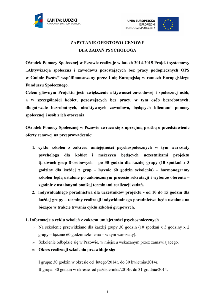 ZAPYTANIE OFERTOWE psycholog 2014,2015