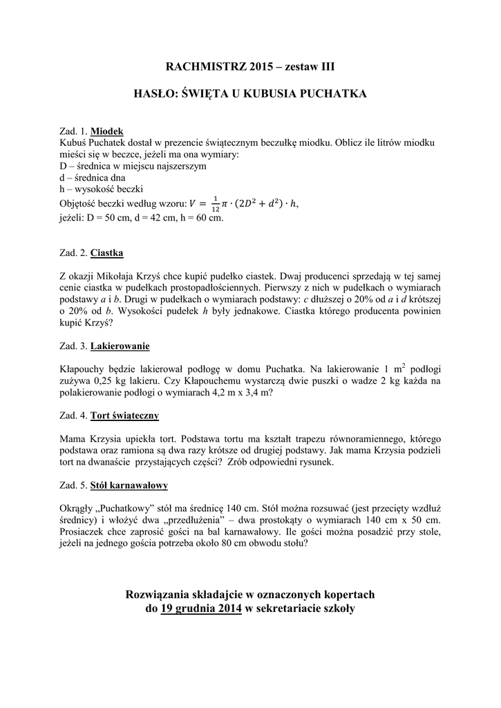 RACHMISTRZ 2015 – zestaw III HASŁO: ŚWIĘTA U KUBUSIA PUCHATKA Zad. 1. Miodek Kubuś Puchatek dostał w prezencie świątecznym beczułkę miodku. Oblicz ile litrów miodku mieści się w beczce, jeżeli ma ona wymiary: D – średnica w miejscu najszerszym d – średnica dna h – wysokość beczki ( ) , Objętość beczki według wzoru: jeżeli: D = 50 cm, d = 42 cm, h = 60 cm. Zad. 2. Ciastka Z okazji Mikołaja Krzyś chce kupić pudełko ciastek. Dwaj producenci sprzedają w tej samej cenie ciastka w pudełkach prostopadłościennych. Pierwszy z nich w pudełkach o wymiarach podstawy a i b. Drugi w pudełkach o wymiarach podstawy: c dłuższej o 20% od a i d krótszej o 20% od b. Wysokości pudełek h były jednakowe. Ciastka którego producenta powinien kupić Krzyś? Zad. 3. Lakierowanie Kłapouchy będzie lakierował podłogę w domu Puchatka. Na lakierowanie 1 m2 podłogi zużywa 0,25 kg lakieru. Czy Kłapouchemu wystarczą dwie puszki o wadze 2 kg każda na polakierowanie podłogi o wymiarach 4,2 m x 3,4 m? Zad. 4. Tort świąteczny Mama Krzysia upiekła tort. Podstawa tortu ma kształt trapezu równoramiennego, którego podstawa oraz ramiona są dwa razy krótsze od drugiej podstawy. Jak mama Krzysia podzieli tort na dwanaście przystających części? Zrób odpowiedni rysunek. Zad. 5. Stół karnawałowy Okrągły „Puchatkowy” stół ma średnicę 140 cm. Stół można rozsuwać (jest przecięty wzdłuż średnicy) i włożyć dwa „przedłużenia” – dwa prostokąty o wymiarach 140 cm x 50 cm. Prosiaczek chce zaprosić gości na bal karnawałowy. Ile gości można posadzić przy stole, jeżeli na jednego gościa potrzeba około 80 cm obwodu stołu? Rozwiązania składajcie w oznaczonych kopertach do 19 grudnia 2014 w sekretariacie szkoły