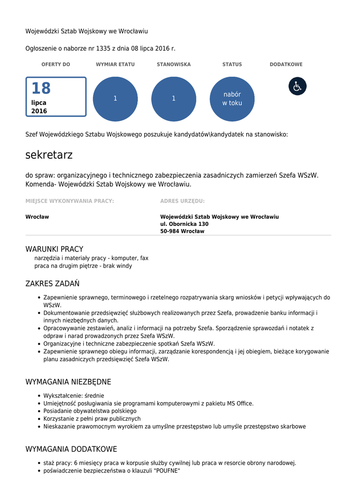 Wojewódzki Sztab Wojskowy we Wrocławiu Ogłoszenie o naborze nr 1335 z dnia 08 lipca 2016 r. OFERTY DO WYMIAR ETATU STANOWISKA STATUS 1 1 nabór w toku 18 lipca 2016 DODATKOWE Szef Wojewódzkiego Sztabu Wojskowego poszukuje kandydatów\kandydatek na stanowisko: sekretarz do spraw: organizacyjnego i technicznego zabezpieczenia zasadniczych zamierzeń Szefa WSzW. Komenda- Wojewódzki Sztab Wojskowy we Wrocławiu. MIEJSCE WYKONYWANIA PRACY: ADRES URZĘDU: Wrocław Wojewódzki Sztab Wojskowy we Wrocławiu ul. Obornicka 130 50-984 Wrocław WARUNKI PRACY narzędzia i materiały pracy - komputer, fax praca na drugim piętrze - brak windy ZAKRES ZADAŃ Zapewnienie sprawnego, terminowego i rzetelnego rozpatrywania skarg wniosków i petycji wpływających do WSzW. Dokumentowanie przedsięwzięć służbowych realizowanych przez Szefa, prowadzenie banku informacji i innych niezbędnych danych. Opracowywanie zestawień, analiz i informacji na potrzeby Szefa. Sporządzenie sprawozdań i notatek z odpraw i narad prowadzonych przez Szefa WSzW. Organizacyjne i techniczne zabezpieczenie spotkań Szefa WSzW. Zapewnienie sprawnego obiegu informacji, zarządzanie korespondencją i jej obiegiem, bieżące korygowanie planu zasadniczych przedsięwzięć Szefa WSzW. WYMAGANIA NIEZBĘDNE Wykształcenie: średnie Umiejętność posługiwania sie programami komputerowymi z pakietu MS Office. Posiadanie obywatelstwa polskiego Korzystanie z pełni praw publicznych Nieskazanie prawomocnym wyrokiem za umyślne przestępstwo lub umyśle przestępstwo skarbowe WYMAGANIA DODATKOWE staż pracy: 6 miesięcy praca w korpusie służby cywilnej lub praca w resorcie obrony narodowej. poświadczenie bezpieczeństwa o klauzuli "POUFNE" DOKUMENTY I OŚWIADCZENIA NIEZBĘDNE Życiorys/CV i list motywacyjny Kopie dokumentów potwierdzających spełnienie wymagania niezbędnego w zakresie wykształcenia Oświadczenie o posiadaniu obywatelstwa polskiego albo kopia dokumentu potwierdzającego posiadanie polskiego obywatelstwa Oświadczenie o wyrażeniu zgody na przetwarzanie danych osobowych do celów naboru Oświadczenie o korzystaniu z pełni praw publicznych Oświadczenie o nieskazaniu prawomocnym wyrokiem za umyślne przestępstwo lub umyślne przestępstwo skarbowe DOKUMENTY I OŚWIADCZENIA DODATKOWE kopia dokumentu potwierdzającego niepełnosprawność - w przypadku kandydatek/kandydatów, zamierzających skorzystać z pierwszeństwa w zatrudnieniu w przypadku, gdy znajdą się w gronie najlepszych kandydatek/kandydatów Kopie dokumentów potwierdzających spełnienie wymagania dodatkowego w zakresie wykształcenia Kopie dokumentów potwierdzających spełnienie wymagania dodatkowego w zakresie doświadczenia zawodowego / stażu pracy Swiadectwo pracy potwierdzające staż pracy w korpusie słuzby cywilnej lu resorcie obrony narodowej. TERMINY I MIEJSCE SKŁADANIA DOKUMENTÓW Dokumenty należy złożyć do: 18 lipca 2016 r. Decyduje data: stempla pocztowego / osobistego dostarczenia oferty do urzędu Miejsce składania dokumentów: Wojewódzki Sztab Wojskowy we Wrocławiu ul. Obornicka 130 50-984 Wrocław INNE INFORMACJE: W miesiącu poprzedzającym datę upublicznienia ogłoszenia wskaźnik zatrudnienia osób niepełnosprawnych w urzędzie, w rozumieniu przepisów o rehabilitacji zawodowej i społecznej oraz zatrudnianiu osób niepełnosprawnych, nie wynosi co najmniej 6%. Nasz urząd jest pracodawcą równych szans i wszystkie aplikacje są rozważane z równą uwagą bez względu na płeć, wiek, niepełnosprawność, rasę, narodowość, przekonania polityczne, przynależność związkową, pochodzenie etniczne, wyznanie, orientacje seksualną czy też jakąkolwiek inną cechę prawnie chronioną. W ciągu 3 miesięcy od dnia publikacji wyniku naboru istnieje możliwość odbioru złożonych dokumentów, po tym terminie oferty zostaną komisyjnie zniszczone. Kandydaci, którzy spełniają wymagania formalne, zostaną poinformowani (telefonicznie lub e-mailem) o terminie dalszego etapu naboru. Oferty złożone lub wysłane po terminie nie będą rozpatrywane (liczy się data stempla pocztowego). W ofercie należy podać dane kontaktowe (adres do korespondencji, adres e-mail, numer telefonu) oraz numer ogłoszenia. Proponowane wynagrodzenie brutto wznosi: 2.346,05 zł. Dodatkowe informacje można uzyskać pod numerem tel. 261 656 002 (sprawy dotyczące zadań na stanowisku) lub 261 656 050 (sprawy organizacyjne i formalne). Legenda Pierwszeństwo dla osób z niepełnosprawnościami Ogłoszenie z tym symbolem oznacza, że pierwszeństwo w zatrudnieniu mają osoby z niepełnosprawnościami, które spełniają wszystkie następujące warunki: • złożyły w terminie ofertę wraz z dokumentem potwierdzającym niepełnosprawność, • spełniają warunki wymienione w ogłoszeniu, • po rekrutacji znalazły się w gronie najlepszych kandydatów. Zastępstwo Ogłoszenie z tym symbolem oznacza, że urząd poszukuje kandydatów do pracy na czas przewidywanej nieobecności swojego pracownika. Jeśli w ogłoszeniu nie wskazano okresu zastępstwa, możesz o to spytać w urzędzie. Osoba zatrudniona na zastępstwo jest członkiem korpusu służby cywilnej. Nabór otwarty dla cudzoziemców Ogłoszenie z tym symbolem oznacza, że o stanowisko mogą starać się, poza polskimi obywatelami, również cudzoziemcy. Kandydaci muszą spełniać następujące warunki: • są obywatelami państwa Unii Europejskiej lub innego państwa, którego obywatelom na podstawie umów międzynarodowych lub przepisów prawa wspólnotowego przysługuje prawo podjęcia zatrudnienia na terytorium Polski, • ich znajomość języka polskiego jest potwierdzona jednym z dokumentów wskazanych w rozporządzeniu w sprawie rodzajów dokumentów potwierdzających znajomość języka polskiego przez osoby nieposiadające obywatelstwa polskiego, ubiegające się o zatrudnienie w służbie cywilnej.