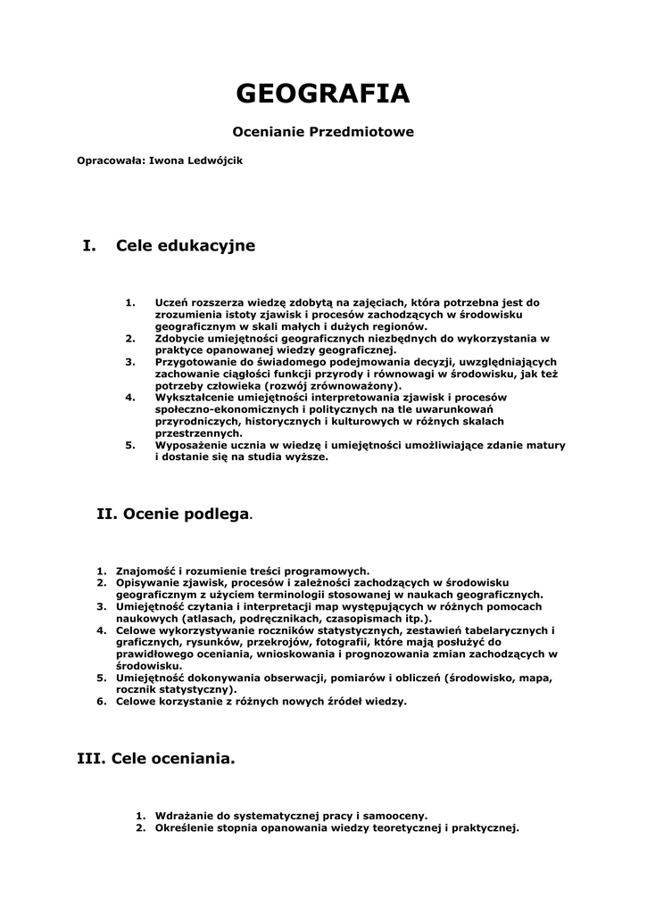 GEOGRAFIA Ocenianie Przedmiotowe Opracowała: Iwona Ledwójcik I. Cele edukacyjne 1. 2. 3. 4. 5. Uczeń rozszerza wiedzę zdobytą na zajęciach, która potrzebna jest do zrozumienia istoty zjawisk i procesów zachodzących w środowisku geograficznym w skali małych i dużych regionów. Zdobycie umiejętności geograficznych niezbędnych do wykorzystania w praktyce opanowanej wiedzy geograficznej. Przygotowanie do świadomego podejmowania decyzji, uwzględniających zachowanie ciągłości funkcji przyrody i równowagi w środowisku, jak też potrzeby człowieka (rozwój zrównoważony). Wykształcenie umiejętności interpretowania zjawisk i procesów społeczno-ekonomicznych i politycznych na tle uwarunkowań przyrodniczych, historycznych i kulturowych w różnych skalach przestrzennych. Wyposażenie ucznia w wiedzę i umiejętności umożliwiające zdanie matury i dostanie się na studia wyższe. II. Ocenie podlega. 1. Znajomość i rozumienie treści programowych. 2. Opisywanie zjawisk, procesów i zależności zachodzących w środowisku geograficznym z użyciem terminologii stosowanej w naukach geograficznych. 3. Umiejętność czytania i interpretacji map występujących w różnych pomocach naukowych (atlasach, podręcznikach, czasopismach itp.). 4. Celowe wykorzystywanie roczników statystycznych, zestawień tabelarycznych i graficznych, rysunków, przekrojów, fotografii, które mają posłużyć do prawidłowego oceniania, wnioskowania i prognozowania zmian zachodzących w środowisku. 5. Umiejętność dokonywania obserwacji, pomiarów i obliczeń (środowisko, mapa, rocznik statystyczny). 6. Celowe korzystanie z różnych nowych źródeł wiedzy. III. Cele oceniania. 1. Wdrażanie do systematycznej pracy i samooceny. 2. Określenie stopnia opanowania wiedzy teoretycznej i praktycznej. 3. Wspieranie szkolnej kariery uczniów i ich motywowanie. 4. Oddziaływanie na uczniów najzdolniejszych, ale także słabych oraz przeciętnych, których w szkole jest najwięcej. 5. Dostarczenie nauczycielom informacji o poziomie osiągnięć edukacyjnych i postępach w tym zakresie. 6. Ustalenie oceny śródrocznej i rocznej. IV.Ogólne kryteria oceny Ocena celująca Ocenę tę otrzymuje uczeń, który: twórczo rozwija własne uzdolnienia i zainteresowania, pomysłowo i oryginalnie rozwiązuje nietypowe zadania, bierze udział i osiąga sukcesy w konkursach i olimpiadach geograficznych lub olimpiadach pokrewnych, posiada wiedzę wykraczającą poza obowiązujący program nauczania. Ocena bardzo dobra Ocenę tę otrzymuje uczeń, który opanował pełen zakres wiadomości i umiejętności przewidzianych programem nauczania oraz potrafi: sprawnie poruszać się w tematyce geograficznej, samodzielnie rozwiązywać problemy, wykazać się znajomością pojęć i terminów oraz umiejętnością poprawnego ich zastosowania w sytuacjach typowych i nietypowych, posługiwać się poprawnie terminologią geograficzną, samodzielnie zdobywać wiedzę i umiejętności, przeprowadzać prawidłową analizę związków przyczynowoskutkowych, zachodzących pomiędzy elementami środowiska geograficznego, w oparciu o źródła przeprowadzić analizę procesów i określić ich konsekwencje. Ocena dobra Ocenę tę otrzymuje uczeń, który opanował wiadomości i umiejętności przewidziane podstawą programowa oraz wybrane elementy programu nauczania a także potrafi: samodzielnie wyjaśniać typowe zależności, posługiwać się terminologią geograficzną z nielicznymi potknięciami i błędami, sprawnie rozwiązywać zadania geograficzne, przeprowadzić prostą analizę związków przyczynowo-skutkowych zachodzących pomiędzy elementami środowiska geograficznego, samodzielnie dokonać analizy danych statystycznych przedstawionych w różnej formie, w oparciu o dane liczbowe sporządzić diagramy, wykresy, kartodiagramy itp. Ocena dostateczna Ocenę tę otrzymuje uczeń, który opanował wiadomości i umiejętności przewidziane podstawą programową, co pozwala mu na: wykazanie się znajomością i rozumieniem podstawowych pojęć i terminów geograficznych, stosowanie poznanych pojęć i terminów w sytuacjach typowych, wykonywanie prostych obliczeń geograficznych, wskazywanie elementarnych związków przyczynowo-skutkowych zachodzących pomiędzy elementami środowiska geograficznego, samodzielne rozwiązywanie elementarnych zadań geograficznych Ocena dopuszczająca Uczeń opanował wiadomości i umiejętności przewidziane podstawą programową w takim zakresie, że potrafi: samodzielnie lub z niewielka pomocą nauczyciela wykonać ćwiczenia i zadania o niewielkim stopniu trudności, wykazać się znajomością i rozumieniem najprostszych pojęć i terminów geograficznych, wskazać elementarne związki pomiędzy składnikami środowiska geograficznego. Ocena niedostateczna Ocenę tę otrzymuje uczeń, który nie opanował podstawowych wiadomości i umiejętności wynikających z programu nauczania oraz: nie radzi sobie ze zrozumieniem najprostszych pojęć i terminów geograficznych, nie potrafi nawet przy pomocy nauczyciela wykonać najprostszych ćwiczeń i zadań, nie wykazuje najmniejszych chęci współpracy w celu uzupełnienia braków oraz nabycia podstawowej wiedzy i umiejętności. Ocenianie form sprawdzania wiadomości ucznia (sprawdziany, kartkówki) Uczeń może uzyskać następujące oceny wynikające ze skali procentowej zdobytych punktów: 0-25% ocena niedostateczna 26-27% ocena +niedostateczna 28-29% ocena –dopuszczająca 30-35% ocena dopuszczająca 36-41% ocena +dopuszczająca 42-47% ocena -dostateczna 48-53% ocena dostateczna 54-59% ocena +dostateczna 60-65% ocena –dobra 66-71% ocena dobra 72-77% ocena +dobra 78-83% ocena –bardzo dobra 84-89% ocena bardzo dobra 90-93% ocena +bardzo dobra 94-97% ocena –celujący 98-100% ocena celujący V. Formy aktywności 1. Formy aktywności - odpowiedź ustna: a) częstotliwość w półroczu - 1-2 razy b) zakres - trzy ostatnie tem