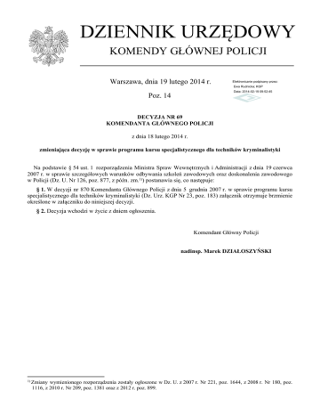 DZIENNIK URZĘDOWY KOMENDY GŁÓWNEJ POLICJI Warszawa, dnia 19 lutego 2014 r. Elektronicznie podpisany przez: Ewa Rudnicka; KGP Data: 2014-02-19 09:52:45 Poz. 14 DECYZJA NR 69 KOMENDANTA GŁÓWNEGO POLICJI z dnia 18 lutego 2014 r. zmieniająca decyzję w sprawie programu kursu specjalistycznego dla techników kryminalistyki Na podstawie § 54 ust. 1 rozporządzenia Ministra Spraw Wewnętrznych i Administracji z dnia 19 czerwca 2007 r. w sprawie szczegółowych warunków odbywania szkoleń zawodowych oraz doskonalenia zawodowego w Policji (Dz. U. Nr 126, poz. 877, z późn. zm.1)) postanawia się, co następuje: § 1. W decyzji nr 870 Komendanta Głównego Policji z dnia 5 grudnia 2007 r. w sprawie programu kursu specjalistycznego dla techników kryminalistyki (Dz. Urz. KGP Nr 23, poz. 183) załącznik otrzymuje brzmienie określone w załączniku do niniejszej decyzji. § 2. Decyzja wchodzi w życie z dniem ogłoszenia. Komendant Główny Policji nadinsp. Marek DZIAŁOSZYŃSKI 1) Zmiany wymienionego rozporządzenia zostały ogłoszone w Dz. U. z 2007 r. Nr 221, poz. 1644, z 2008 r. Nr 180, poz. 1116, z 2010 r. Nr 209, poz. 1381 oraz z 2012 r. poz. 899. Dziennik Urzędowy Komendy Głównej Policji –2– Poz. 14 Załącznik do decyzji nr 69 Komendanta Głównego Policji z dnia 18 lutego 2014 r. PROGRAM KURSU SPECJALISTYCZNEGO DLA TECHNIKÓW KRYMINALISTYKI Dziennik Urzędowy Komendy Głównej Policji –3– SPIS TREŚCI 1. ZAŁOŻENIA ORGANIZACYJNO-PROGRAMOWE KURSU 1.1. 1.2. 1.3. 1.4. 1.5. 1.6. 1.7. 1.8. 1.9. 1.10 Nazwa kursu Wnioskodawca Ogólna charakterystyka programu Cele kursu Kryteria formalne kandydatów kierowanych na kurs Forma organizacyjna kursu Zakres tematyczny i system oceniania Katalog zadań Czas trwania i organizacja zajęć Zaliczenie końcowe 2. WYKAZ I UKŁAD STRUKTURALNY JEDNOSTKI MODUŁOWEJ 2.1. Jednostka modułowa i jednostki szkolne 2.2. Obowiązki nauczyciela realizującego zajęcia na kursie 3. OCENA REALIZOWANEGO PROGRAMU 4. WEWNĘTRZNY UKŁAD REALIZACJI TREŚCI PROGRAMOWYCH Poz. 14 Dziennik Urzędowy Komendy Głównej Policji –4– Poz. 14 1. ZAŁOŻENIA ORGANIZACYJNO-PROGRAMOWE KURSU 1.1. Nazwa kursu Kurs specjalistyczny dla techników kryminalistyki. 1.2. Wnioskodawca Dyrektor Biura Służby Kryminalnej KGP. 1.3. Cel kursu Program przygotowuje słuchacza do wykonywania zadań na stanowisku technika kryminalistyki. 1.4. Kryteria formalne kandydatów kierowanych na kurs Na kurs kierowany jest policjant, który: − ukończył szkolenie zawodowe podstawowe, − jest w służbie stałej, − posiada prawo jazdy kat. B, − został zakwalifikowany przez kierownika jednostki organizacyjnej Policji do pełnienia służby w komórce techniki kryminalistycznej po pozytywnym zaopiniowaniu przez krajowego/wojewódzkiego koordynatora techniki kryminalistycznej. Na kurs może być skierowany pracownik Policji, który zatrudniony jest w laboratorium kryminalistycznym po pozytywnym zaopiniowaniu przez krajowego/wojewódzkiego koordynatora techniki kryminalistycznej. 1.5. Ogółna charakterystyka programu Program kursu został opracowany zgodnie z metodologią tzw. modułów umiejętności zawodowych, w której zadania wykonywane przez techników kryminalistyki stanowią zarówno kryterium doboru, jak i organizacji treści nauczania/uczenia się. Kurs, realizowany na podstawie programu, przygotowuje do wykonywania podstawowych zadań zawodowych, którym odpowiadają tzw. jednostki modułowe. Zadania zawodowe (jednostki modułowe) poddano analizie, w wyniku której: − zidentyfikowano i nazwano etapy pracy, − przyporządkowano umiejętności poszczególnym etapom pracy, − wyodrębniono i nazwano jednostki szkolne, nawiązując do charakteru zajęć dydaktycznych. Jednostki modułowe podzielone zostały na mniejsze, samodzielne partie materiału nauczania, tzw. jednostki szkolne, odpowiadające kolejnym etapom realizacji zadania służbowego. Dla wszystkich jednostek modułowych, na podstawie wchodzących w nie jednostek szkolnych, opracowano: − cele kształcenia, − listę wyposażenia dydaktycznego. W ramach każdej jednostki szkolnej wskazano: − operacyjne cele doskonalenia, zawierające czynności, składające się na właściwą realizację zadania służbowego, − kluczowe punkty nauczania niezbędne do osiągnięcia zakładanych celów kursu w ramach danej jednostki szkolnej, − czas niezbędny do realizacji kluczowych punktów nauczania, − proponowane metody realizacji zajęć, − pomoce dydaktyczne, sprzęt i materiały niezbędne do realizacji kursu. Wskazywane w programie metody realizacji zajęć są proponowane jako optymalne do osiągnięcia zakładanych celów kształcenia. Prowadzący zajęcia może dokonać doboru innej metody, jeżeli zagwarantuje ona osiągnięcie założonych celów kształcenia. Właściwa realizacja treści objętych programem wymaga, aby jednostka realizująca kurs specjalistyczny dysponowała odpowiednimi warunkami organizacyjnymi oraz technicznymi, określonymi w Listach wyposażenia dydaktycznego, wyodrębnionych dla jednostek modułowych. Program kursu konsultowano z Dyrektorem Centralnego Laboratorium Kryminalistycznego Policji. Dziennik Urzędowy Komendy Głównej Policji –5– Poz. 14 Objaśnienia skrótów dotyczących dokumentacji programowej: JM – jednostka modułowa JS – jednostka szkolna PN – poradnik dla nauczyciela LW – lista wyposażenia dydaktycznego Użyte w programie doskonalenia zawodowego określenie specjalista odnosi się do technika kryminalistyki w rozumieniu art. 205 § 1 k.p.k. 1.6. Forma organizacyjna kursu Formą realizacji Programu jest doskonalenie w systemie stacjonarnym. Słuchacze są kwaterowani w jednostce szkoleniowej realizującej kurs. 1.7. Zakres tematyczny i system oceniania Nr JM 1. 2. Określenie sposobu zaliczeń w obrębie Nazwa i charakterystyka jednostki modułowej jednostki modułowej, stanowiących ocenę okresową W jednostce modułowej zaplanowano Interdyscypl