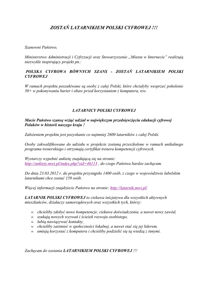 ZOSTAŃ LATARNIKIEM POLSKI CYFROWEJ !!! Szanowni Państwo, Ministerstwo Administracji i Cyfryzacji oraz Stowarzyszenie „Miasta w Internecie” realizują niezwykle inspirujący projekt pn.: POLSKA CYFROWA RÓWNYCH SZANS - ZOSTAŃ LATARNIKIEM POLSKI CYFROWEJ W ramach projektu poszukiwane są osoby z całej Polski, które chciałyby wesprzeć pokolenie 50+ w pokonywaniu barier i obaw przed korzystaniem z komputera, tzw. LATARNICY POLSKI CYFROWEJ Macie Państwo szansę wziąć udział w największym przedsięwzięciu edukacji cyfrowej Polaków w historii naszego kraju ! Założeniem projektu jest pozyskanie co najmniej 2600 latarników z całej Polski. Osoby zakwalifikowane do udziału w projekcie zostaną przeszkolone w ramach unikalnego programu trenerskiego i otrzymają certyfikat trenera kompetencji cyfrowych. Wystarczy wypełnić ankietę znajdującą się na stronie: http://ankiety.mwi.pl/index.php?sid=46113 , do czego Państwa bardzo zachęcam. Do dnia 23.03.2012 r. do projektu przystąpiło 1400 osób, z czego w województwie lubelskim latarnikami chce zostać 159 osób. Więcej informacji znajdziecie Państwo na stronie: http://latarnik.mwi.pl/ LATARNIK POLSKI CYFROWEJ to ciekawa inicjatywa dla wszystkich aktywnych mieszkańców, działaczy samorządowych oraz wszystkich tych, którzy: • • • • • chcieliby zdobyć nowe kompetencje, ciekawe doświadczenia, a nawet nowy zawód, szukają nowych wyzwań i ścieżek rozwoju osobistego, lubią nawiązywać kontakty, chcieliby zaistnieć w społeczności lokalnej, a nawet stać się jej liderem, umieją korzystać z komputera i chcieliby podzielić się tą wiedzą z innymi. Zachęcam do zostania LATARNIKIEM POLSKI CYFROWEJ !!!
