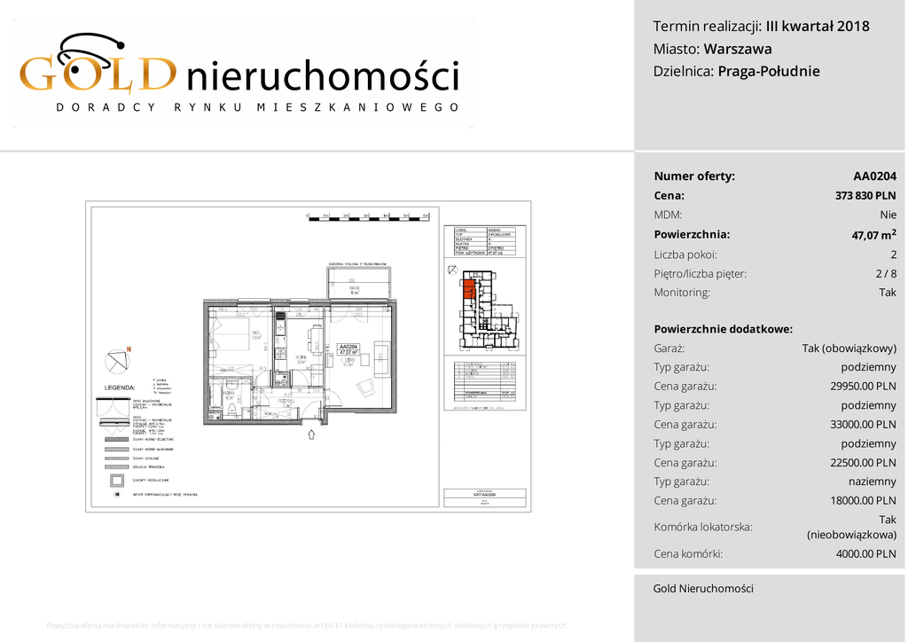 Termin realizacji: III kwartał 2018 Miasto: Warszawa Dzielnica: Praga-Południe Numer oferty: AA0204 Cena: 373 830 PLN MDM: Nie Powierzchnia: Liczba pokoi: Piętro/liczba pięter: Monitoring: 47,07 m2 2 2/8 Tak Powierzchnie dodatkowe: Garaż: Typ garażu: Cena garażu: Typ garażu: Cena garażu: Typ garażu: Cena garażu: Typ garażu: Cena garażu: Komórka lokatorska: Cena komórki: Gold Nieruchomości Powyższa oferta ma charakter informacyjny i nie stanowi oferty w rozumieniu art.66 $1 kodeksu cywilnego oraz innych właściwych przepsiów prawnych. Tak (obowiązkowy) podziemny 29950.00 PLN podziemny 33000.00 PLN podziemny 22500.00 PLN naziemny 18000.00 PLN Tak (nieobowiązkowa) 4000.00 PLN Termin realizacji: III kwartał 2018 Miasto: Warszawa Dzielnica: Praga-Południe Numer oferty: AA0204 Cena: 373 830 PLN MDM: Nie Powierzchnia: Liczba pokoi: Piętro/liczba pięter: Monitoring: 47,07 m2 2 2/8 Tak Powierzchnie dodatkowe: Garaż: Typ garażu: Cena garażu: Typ garażu: Cena garażu: Typ garażu: Cena garażu: Typ garażu: Cena garażu: Komórka lokatorska: Cena komórki: Gold Nieruchomości Powyższa oferta ma charakter informacyjny i nie stanowi oferty w rozumieniu art.66 $1 kodeksu cywilnego oraz innych właściwych przepsiów prawnych. Tak (obowiązkowy) podziemny 29950.00 PLN podziemny 33000.00 PLN podziemny 22500.00 PLN naziemny 18000.00 PLN Tak (nieobowiązkowa) 4000.00 PLN Termin realizacji: III kwartał 2018 Miasto: Warszawa Dzielnica: Praga-Południe Numer oferty: AA0204 Cena: 373 830 PLN MDM: Nie Powierzchnia: Liczba pokoi: Piętro/liczba pięter: Monitoring: 47,07 m2 2 2/8 Tak Powierzchnie dodatkowe: Opis Garaż: Typ garażu: Wyjątkowe mieszkania na Pradze to nietuzinkowa inwestycja położona na Grochowie - w części warszawskiej Pragi. Nowoczesny projekt został zlokalizowany w jednym z najlepszych komunikacyjnie punktów dzielnicy. To tutaj najciekawsze atrybuty miejskiego życia harmonijnie przeplatają się z terenami zielonymi i mnóstwem praskich atrakcji. Cena garażu: Kameralna i estetyczna zabudowa - zaledwie 84 mieszkania. 8 dopracowanych w każdym detalu pięter. Przestronne 1-, 2-, 3- i 4-pokojowe mieszkania już od 31 m2, a na ostatniej kondygnacji także dwupoziomowe apartamenty z dużymi tarasami o oryginalnych pergolach i metrażu 97 m2. Elegancki hol wejściowy utrzymany w minimalistycznych szarościach i beżach. Możliwość skorzystania z Inteligentnego Systemu Mieszkaniowego. Typ garażu: Typ garażu: Cena garażu: Cena garażu: Typ garażu: Cena garażu: Komórka lokatorska: Cena komórki: Gold Nieruchomości Powyższa oferta ma charakter informacyjny i nie stanowi oferty w rozumieniu art.66 $1 kodeksu cywilnego oraz innych właściwych przepsiów prawnych. Tak (obowiązkowy) podziemny 29950.00 PLN podziemny 33000.00 PLN podziemny 22500.00 PLN naziemny 18000.00 PLN Tak (nieobowiązkowa) 4000.00 PLN