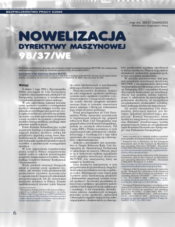 BEZPIECZEŃSTWO PRACY 5/2005 mgr inż. JERZY ZAWADZKI NOWELIZACJA Ministerstwo Gospodarki i Pracy DYREKTYWY MASZYNOWEJ 98/37/WE W artykule przedstawiono stan prac oraz omówiono projekt nowelizacji dyrektywy 98/37/WE, tzw. maszynowej zaakceptowany przez Radę ds. Konkurencyjności w dniu 24 września 2004 r. Amendment of the machinery directive 98/37/EC This article presents the advancement of work on a draft of the amendment of the 98/37/EC directive, the so-called machine directive, accepted by the Council for Competitiveness on September 24, 2004. It also discusses the draft. Wstęp Z dniem 1 maja 2004 r. Rzeczpospolita Polska przystąpiła do Unii Europejskiej i wspólnie z innymi państwami, członkami Unii Europejskiej, uczestniczy w kształtowaniu i wypełnianiu przepisów prawa unijnego. W celu zapewnienia realizacji procedur oceny zgodności wyrobów z wymaganiami dyrektyw laboratoria badające wyroby oraz jednostki je certyfikujące przygotowały swoje zaplecze techniczne, personel oraz poddały się ocenie i uzyskały uprawnienia do badania i oceny wyrobów na zgodność z przepisami dyrektyw nowego podejścia, uzyskując statut jednostek notyfikowanych. Polski Komitet Normalizacyjny wydał na potrzeby każdego z rozporządzeń wdrażających przepisy dyrektyw, polską lub przejściowo angielską wersję norm zharmonizowanych, ułatwiających producentom wykazanie zgodności produkowanych wyrobów z zasadniczymi wymaganiami dyrektyw. W celu zapewnienia respektowania prawa został w Polsce zorganizowany nadzór rynku w zakresie przestrzegania przepisów bezpieczeństwa wyrobów, który podlega Urzędowi Ochrony Konkurencji i Konsumentów. Wiele polskich instytucji biorących udział w systemie oceny zgodności wyrobów, jak również wielu przedstawicieli producentów wyrobów uczestniczyło w zagranicznych i krajowych szkoleniach przygotowujących ich do stosowania przepisów dyrektyw w Polsce. Zostało opublikowanych również wiele broszur 1 Wymagania bezpieczeństwa dla maszyn umieszczanych na rynkach Unii Europejskiej i na rynku w Polsce. http://www.mgip.gov.pl/Przedsiebiorcy/ Ocena+zgodnosci/Wymagania++bezpieczenstwa ++dla++maszyn+umieszczanych++na+rynkach+ +Unii++Europejskiej++i++n.htm 6 do celów szkoleniowych, w tym broszura dotycząca dyrektywy maszynowej.1 Dotychczasowe działania, mające na celu osiągnięcie zgodności polskiego systemu oceny zgodności wyrobów z systemem unijnym, z uwagi na ich zakończenie zostały obecnie zastąpione udziałem naszego kraju w systemie stanowienia prawa unijnego i bieżącym wdrażaniem jego zmian do prawa polskiego. Przed przystąpieniem do Unii Europejskiej Polska wprawdzie uczestniczyła w organizacjach unijnych (np. grupach roboczych Rady Unii Europejskiej oraz grupach roboczych Komisji Europejskiej), jednak na zasadach obserwatora. Od 1 maja 2004 r. Polska uczestniczy w tych organizacjach jako pełnoprawny członek, korzystając z wynikających z tego faktu uprawnień, ale i wywiązując się z obowiązków i odpowiedzialności. Jednym z przykładów jest uczestnictwo w Grupie Roboczej Rady Unii Europejskiej ds. Harmonizacji Technicznej w odniesieniu do maszyn. Obecnie prace te są w końcowym stadium uzgadniania treści projektu nowelizacji dyrektywy 98/37/WE, tzw. maszynowej, który ma zastąpić tę dyrektywę. Losy dyrektywy maszynowej, w tym przygotowania do jej nowelizacji, mogą być doskonałym przykładem rozwoju wspólnego rynku, obejmującego coraz więcej grup wyrobów przez harmonizację przepisów i doskonalenie organizacji systemu oceny ich zgodności. Są również przykładem intensywnej współpracy specjalistów państw członkowskich dążących do jak najlepszego i zasadnego, w ich rozumieniu, ukształtowania zakresu, zasadniczych wymagań, procedur oceny zgodności, uprawnień i obowiązków organów unijnych oraz zobowiązań państw członkowskich czy obowiąz- ków producentów wyrobów określonych w tekście dyrektywy. Prace te mają ułatwić działalność podmiotów gospodarczych, w tym szczególnie producentów. W artykule przedstawiono: stan prac nad projektem nowelizacji dyrektywy 98/37/WE z uwzględnieniem pierwotnej wersji projektu przedłożonego przez Komisję Europejską (KE) i uzasadnień Komisji dotyczących konieczności jej nowelizacji, obecny stan projektu, zmiany wprowadzane w odniesieniu do poszczególnych podmiotów dyrektywy, ze szczególnym uwzględnieniem producentów wyrobów, które podlegają dyrektywie maszynowej.2 Na stronie internetowej Unii Europejskiej, dotyczącej maszyn, jest dostępny dokument przedstawiający propozycje3 Komisji Europejskiej zmian dyrektywy maszynowej i ich uzasadnienie oraz dokument4 przedstawiający korektę proponowanych zmian po uwzględnieniu opinii Komitetu Ekonomiczno-Społecznego5 oraz Parlamentu Europejskiego6. 2 Autor uczestniczył w ostatnim stadium uzgodnień treści projektu nowelizacji dyrektywy maszynowej. 3 Proposal for a Directive of the European Parliament and of the Council on Machinery and amending Directive 95/16/EC. Document COM(2000) 899 final of 26.01.2001 http://europa. eu.int/comm/enterprise/mechan_equipment/machinery/direct/proposal.htm 4 Amended Proposal for a Directive of the European Parliament and of the Council on Machinery and amending Directive 95/16/EC. Document COM(2003) 48 final of 11.2.2003 http://europa.eu.int/comm/enterprise/mechan_ equipment/machinery/direct/proposal.htm 5 “Opinion of the Economic and Social Committee on the “Proposal for a Directive of the European Parliament and of the Council on machinery and amending Directive 95/16/EC” – Official Journal C 311 , 07/11/2001 P. 0001 – 0006 http://europa. eu.int/eur-lex/lex/LexUriServ/LexUriServ.do?uri=CELEX:52001AE1112:EN:HTML 6 “European Parliament legislative resolution on the proposal for a directive of the European Parliament and of the Council on machinery and amending Directive 95/16/EC“ (COM(2000) 899 - C50035/2001 - 2001/0004(COD))