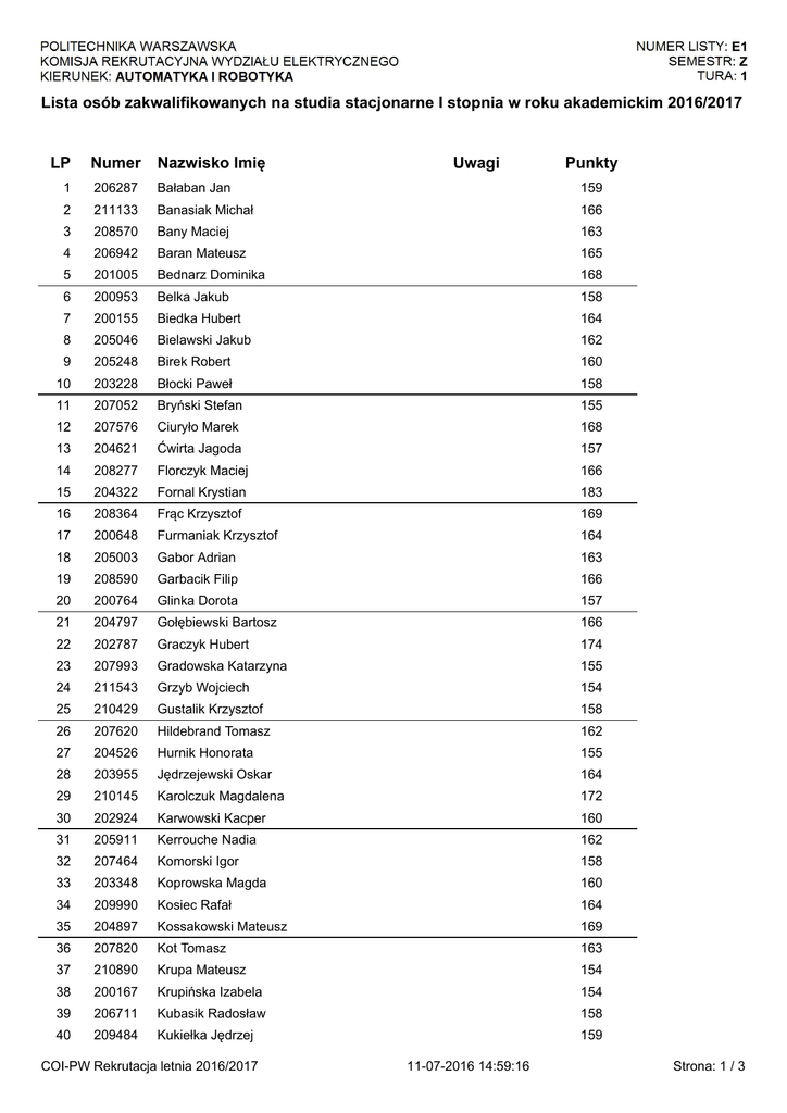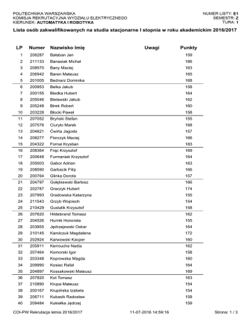 Lista osób zakwalifikowanych na studia stacjonarne I stopnia w roku akademickim 2016/2017 LP Numer Nazwisko Imię 1 206287 Bałaban Jan 159 2 211133 Banasiak Michał 166 3 208570 Bany Maciej 163 4 206942 Baran Mateusz 165 5 201005 Bednarz Dominika 168 6 200953 Belka Jakub 158 7 200155 Biedka Hubert 164 8 205046 Bielawski Jakub 162 9 205248 Birek Robert 160 10 203228 Błocki Paweł 158 11 207052 Bryński Stefan 155 12 207576 Ciuryło Marek 168 13 204621 Ćwirta Jagoda 157 14 208277 Florczyk Maciej 166 15 204322 Fornal Krystian 183 16 208364 Frąc Krzysztof 169 17 200648 Furmaniak Krzysztof 164 18 205003 Gabor Adrian 163 19 208590 Garbacik Filip 166 20 200764 Glinka Dorota 157 21 204797 Gołębiewski Bartosz 166 22 202787 Graczyk Hubert 174 23 207993 Gradowska Katarzyna 155 24 211543 Grzyb Wojciech 154 25 210429 Gustalik Krzysztof 158 26 207620 Hildebrand Tomasz 162 27 204526 Hurnik Honorata 155 28 203955 Jędrzejewski Oskar 164 29 210145 Karolczuk Magdalena 172 30 202924 Karwowski Kacper 160 31 205911 Kerrouche Nadia 162 32 207464 Komorski Igor 158 33 203348 Koprowska Magda 160 34 209990 Kosiec Rafał 164 35 204897 Kossakowski Mateusz 169 36 207820 Kot Tomasz 163 37 210890 Krupa Mateusz 154 38 200167 Krupińska Izabela 154 39 206711 Kubasik Radosław 158 40 209484 Kukiełka Jędrzej 159 COI-PW Rekrutacja letnia 2016/2017 Uwagi 11-07-2016 14:59:16 Punkty Strona: 1 / 3 Lista osób zakwalifikowanych na studia stacjonarne I stopnia w roku akademickim 2016/2017 LP Numer Nazwisko Imię 41 209084 Kwolek Jakub 186 42 200121 Leszczyński Paweł 162 43 206969 Lis Jakub 178 44 207273 Lisowski Wiktor 166 45 208901 Łuczyński Piotr 181 46 203541 Machałek Agata 159 47 207824 Mackiewicz Mateusz 161 48 208292 Michalski Marcin 167 49 208375 Olszewski Radosław 161 50 202690 Paleski Piotr 154 51 203932 Panasewicz Filip 162 52 210397 Pawłowski Kasper 182 53 211114 Piątek Szymon 159 54 201806 Pieczul Albert 181 55 208976 Pogwizd Karol 154 56 208076 Przeczka Arkadiusz 172 57 206811 Purgat Michalina 154 58 210730 Pylowski Piotr 167 59 202030 Rogala Maksymilian 158 60 204495 Rogalski Jakub 154 61 206420 Rot Michał 163 62 208163 Rybczyński Jacek 164 63 209167 Sajnóg Dawid 159 64 211137 Siedlecka Paulina 164 65 211544 Skwarek Michalina 161 66 207691 Sobczyk Alicja 160 67 203043 Sobiecki Jacek 191 68 201830 Sobolewski Przemysław 156 69 207337 Soczewski Marcin 160 70 201420 Stasiak Łukasz 163 71 206368 Staszewski Wojciech 162 72 212028 Stobba Jan 155 73 201022 Stryja Mikołaj 166 74 205982 Szczyrek Michał 174 75 204676 Szubert Piotr 162 76 208365 Szurkowski Karol 176 77 205610 Szymański Maciej 171 78 208118 Taczała Dawid 179 79 202159 Tytko Karolina 176 80 206474 Urbanowicz Dominik 166 COI-PW Rekrutacja letnia 2016/2017 Uwagi 11-07-2016 14:59:16 Punkty Strona: 2 / 3 Lista osób zakwalifikowanych na studia stacjonarne I stopnia w roku akademickim 2016/2017 LP Numer Nazwisko Imię 81 205701 Wasak Jan 160 82 205741 Wędrowski Paweł 155 83 200490 Wierzchowski Michał 160 84 210120 Włodarczyk Stanisław 154 85 204248 Wojciuk Mikołaj 161 86 205017 Wolska Katarzyna 87 207925 Woźnica Piotr 165 88 208842 Zaborniak Szymon 155 89 208988 Zakrzewski Piotr 160 90 210623 Zarzycki Marcin 157 91 202774 Zdulski Rafał 166 COI-PW Rekrutacja letnia 2016/2017 Uwagi OL 11-07-2016 14:59:16 Punkty 225 Strona: 3 / 3