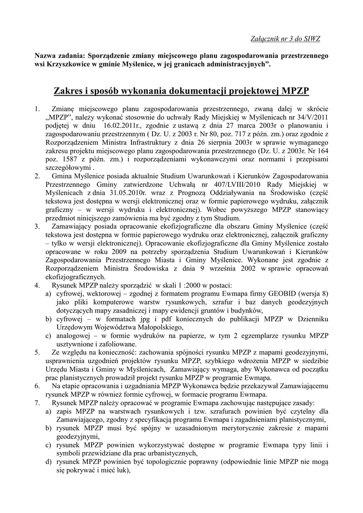 Załącznik nr 3 do SIWZ Nazwa zadania: Sporządzenie zmiany miejscowego planu zagospodarowania przestrzennego wsi Krzyszkowice w gminie Myślenice, w jej granicach administracyjnych”. Zakres i sposób wykonania dokumentacji projektowej MPZP 1. 2. 3. 4. 5. 6. 7. Zmianę miejscowego planu zagospodarowania przestrzennego, zwaną dalej w skrócie „MPZP”, należy wykonać stosownie do uchwały Rady Miejskiej w Myślenicach nr 34/V/2011 podjętej w dniu 16.02.2011r., zgodnie z ustawą z dnia 27 marca 2003r o planowaniu i zagospodarowaniu przestrzennym ( Dz. U. z 2003 r. Nr 80, poz. 717 z późn. zm.) oraz zgodnie z Rozporządzeniem Ministra Infrastruktury z dnia 26 sierpnia 2003r w sprawie wymaganego zakresu projektu miejscowego planu zagospodarowania przestrzennego (Dz. U. z 2003r. Nr 164 poz. 1587 z późn. zm.) i rozporządzeniami wykonawczymi oraz normami i przepisami szczegółowymi . Gmina Myślenice posiada aktualnie Studium Uwarunkowań i Kierunków Zagospodarowania Przestrzennego Gminy zatwierdzone Uchwałą nr 407/LVIII/2010 Rady Miejskiej w Myślenicach z dnia 31.05.2010r. wraz z Prognozą Oddziaływania na Środowisko (część tekstowa jest dostępna w wersji elektronicznej oraz w formie papierowego wydruku, załącznik graficzny – w wersji wydruku i elektronicznej). Wobec powyższego MPZP stanowiący przedmiot niniejszego zamówienia ma być zgodny z tym Studium. Zamawiający posiada opracowanie ekofizjograficzne dla obszaru Gminy Myślenice (część tekstowa jest dostępna w formie papierowego wydruku oraz elektronicznej, załącznik graficzny – tylko w wersji elektronicznej). Opracowanie ekofizjograficzne dla Gminy Myślenice zostało opracowane w roku 2009 na potrzeby sporządzenia Studium Uwarunkowań i Kierunków Zagospodarowania Przestrzennego Miasta i Gminy Myślenice. Wykonane jest zgodnie z Rozporządzeniem Ministra Środowiska z dnia 9 września 2002 w sprawie opracowań ekofizjograficznych. Rysunek MPZP należy sporządzić w skali 1 :2000 w postaci: a) cyfrowej, wektorowej – zgodnej z formatem programu Ewmapa firmy GEOBID (wersja 8) jako pliki komputerowe warstw rysunkowych, szrafur i baz danych geodezyjnych dotyczących mapy zasadniczej i mapy ewidencji gruntów i budynków, b) cyfrowej – w formatach jpg i pdf koniecznych do publikacji MPZP w Dzienniku Urzędowym Województwa Małopolskiego, c) analogowej – w formie wydruków na papierze, w tym 2 egzemplarze rysunku MPZP usztywnione i zafoliowane. Ze względu na konieczność: zachowania spójności rysunku MPZP z mapami geodezyjnymi, usprawnienia uzgodnień projektów rysunku MPZP, szybkiego wdrożenia MPZP w siedzibie Urzędu Miasta i Gminy w Myślenicach, Zamawiający wymaga, aby Wykonawca od początku prac planistycznych prowadził projekt rysunku MPZP w programie Ewmapa. Na etapie opracowania i uzgadniania MPZP Wykonawca będzie przekazywał Zamawiającemu rysunek MPZP w również formie cyfrowej, w formacie programu Ewmapa. Rysunek MPZP należy opracować w programie Ewmapa zachowując następujące zasady: a) zapis MPZP na warstwach rysunkowych i tzw. szrafurach powinien być czytelny dla Zamawiającego, zgodny z specyfikacją programu Ewmapa i zagadnieniami planistycznymi, b) rysunek MPZP musi być spójny w uzasadnionym merytorycznie zakresie z mapami geodezyjnymi, c) rysunek MPZP powinien wykorzystywać dostępne w programie Ewmapa typy linii i symboli przewidziane dla prac urbanistycznych, d) rysunek MPZP powinien być topologicznie poprawny (odpowiednie linie MPZP nie mogą się pokrywać i mieć luk), e) odległości odpowiednich linii MPZP powinny być zgodne z tekstem MPZP (np. szerokość terenu przewidzianego pod pas drogowy, strefy ochronne elementów MPZP). f) poszczególne zagadnienia planistyczne (wnioski, analizy, przeznaczenie, infrastrukturę) należy umieścić w odrębnych katalogach. 8. W sprawach nie objętych niniejszym dokumentem, dotyczących opracowania wersji cyfrowej rysunku MPZP należy dokonać uzgodnień z Zamawiającym. 9. Ostateczną wersję MPZP należy wykonać i przekazać Zamawiającemu: a) w 5 egzemplarzach w postaci cyfrowej zamieszczonej na opisanych płytach CD w formacie programu Ewmapa wersja 8 - dla rysunku MPZP, b) w 5 egzemplarzach w postaci cyfrowej zamieszczonej na opisanych płytach CD w formacie JPG lub PDF – dla rysunku MPZP, c) w 5 egzemplarzach w postaci oprawionego wydruku – dla tekstu MPZP, d) w 5 egzemplarzach w postaci wydruku kolorowego w skali 1:1000 – dla rysunku MPZP, e) w 4 egzemplarzach w postaci wydruku rysunku MPZP czarno-białego, pomniejszonego dla potrzeb publikacji, f) w 2 egzemplarzach w postaci plików w formacie html zamieszczonych na CD, umożliwiających bezproblemowe umieszczenie rysunku MPZP w na stronie internetowej Zamawiającego Internecie oraz oglądanie z wykorzystaniem opcji powiększania i pomniejszania, g) 2 egzemplarzach w postaci cyfrowej potrzebnej do druku w Dzienniku Urzędowym Województwa Małopolskiego zgodnie z wymaganiami tego urzędu, przy uwzględnieniu przepisów: ustawy z dnia 20 lipca 2000r. o ogłaszaniu aktów normatywnych i niektórych innych aktów prawnych (tekst jednolity z 2007r. Dz.U.Nr 68, poz.449), Rozporządzenie Ministra Spraw Wewnętrznych z 25 kwietnia 2008r. w sprawie wymagań technicznych dokumentów elektronicznych zawierających akty normatywne i inne akty prawne, elektronicznej formy dzienników urzędowych oraz środków komunikacji elektronicznej i informatycznych nośników danych (Dz. U. Nr 75, poz. 451; zmiany Dz.U. Nr 113, poz. 722 i Dz. U. Nr 232, poz.1568). 10. W zakresie zamówienia jest również wdrożenie cyfrowego MPZP w systemie informatycznym oraz przeszkolenie pracowników Urzędu Miasta i Gminy w Myślenicach w obsłudze. 11. Do Wykonawcy należy wykonanie wszelkich prac merytorycznych oraz technicznych związanych z procedurą uchwalania miejscowego planu zagospodarowania przestrzennego w tym m.in. przygotowywanie treści: ogłoszeń , obwieszczeń, zawi