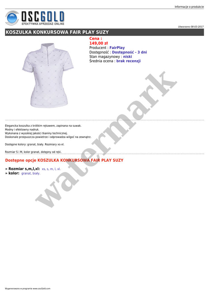 Informacje o produkcie Utworzono 08-03-2017 KOSZULKA KONKURSOWA FAIR PLAY SUZY Cena : 149,00 zł er m ar k Producent : FairPlay Dostępność : Dostępność - 3 dni Stan magazynowy : niski Średnia ocena : brak recenzji Elegancka koszulka z krótkim rękawem, zapinana na suwak. Modny i efektowny nadruk. Wykonana z wysokiej jakości tkaniny technicznej. Doskonale przepuszcza powietrze i odprowadza wilgoć na zewnątrz. Dostępne kolory: granat, biały. Rozmiary xs-xl. Rozmiar S i M, kolor granat, dotępny od ręki. Dostępne opcje KOSZULKA KONKURSOWA FAIR PLAY SUZY w at » Rozmiar s,m,l,xl: xs, s, m, l, xl. » kolor: granat, biały. Wygenerowano w programie www.oscGold.com