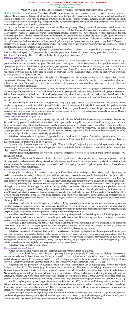 KATECHIZM KOŚCIOŁA KATOLICKIEGO JEST SYMFONIĄ WIARY Archiwalna pogadanka z dnia 23 maja 1993 r. O. Kornelian Dende Witam Was zacni Rodacy i miłe Rodaczki słowami: Niech będzie pochwalony Jezus Chrystus! O. Kornelian Dende: Aleksander Chodźko (1804-1891) poeta, orientalista i slawista, a także przyjaciel naszego wieszcza Adama Mickiewicza, po którym objął katedrę slawistyki w Collége de France, pod koniec życia nie mógł już chodzić do kościoła z braku siły. Dwa razy na miesiąc przynosił mu do domu Komunię świętą kapelan, ksiądz Postawka. Za każdą wizytą kapelan zastawał uczonego klęczącego na podłodze, a ponieważ poeta-staruszek nie mógł utrzymać się na kolanach o swoich siłach, podtrzymali go dwaj pielęgniarze. Ks. Kapelan zawsze był wzruszony tym widokiem klęczącego poety, dlatego przekazał potomności wiadomość o tej głębokiej pobożności uczonego Polaka starca, liczącego wtedy 87 lat. Starzec objawem takiej pobożności oddawał cześć Zbawicielowi świata w Przenajświętszym Sakramencie Ołtarza. Niegdyś był zwolennikiem błędów mesjanisty-filozofa Towiańskiego. Teraz chętnie rozmawiał o sprawach Bożych. W ostatnich latach życia pilnie czytał dzieła Ojców Kościoła w języku greckim i łacińskim i rozkoszował się tą lekturą. Wyznawał przed kapelanem: „Tyle czasu straciłem na głupstwa, a nie zgłębiałem, nie badałem skarbów niedocenionych, jakimi są pisma Ojców Kościoła i w ogóle rzeczy Boże”. Żałował, że zaniedbywał się dawnej w głębszym poznaniu wiary, i że wobec tego niektóre prawdy wiary wyszły mu z pamięci. Nieraz z prostotą dziecka prosił kapelana o ich wyjaśnienie. Ten wzruszający przykład z dziejów ojczystych niech nas zachęci do pilnego wykorzystania w swym życiu Katechizmu Kościoła Katolickiego […]. W pogadance będę mówił o pogłębieniu i umocnieniu naszej wiary przez korzystanie z katechizmu. Tytułuję ją: „Katechizm Kościoła Katolickiego jest symfonią wiary”. Odbiorcy katechizmu […] Ojciec Święty Jan Paweł II przekazując oficjalnie Katechizm Kościołów w Sali Królewskiej na Watykanie, po przemówieniu uczynił symboliczny gest. Wezwał pięciu biskupów z pięciu kontynentów i wręczył każdemu z nich egzemplarz, ponieważ Katechizm ten przeznaczony jest najpierw dla biskupów, bo oni są oficjalnymi nauczycielami prawd wiary chrześcijańskiej. Do nich bowiem, jako do następców Apostołów, zwraca się Chrystus z rozkazem: „Idźcie i nauczajcie wszystkie narody, udzielając im chrztu w imię Ojca i Syna i Ducha Świętego. Uczcie je zachowywać wszystko, co wam przekazałem” (Mt 28, 19-20). Ale Katechizm przeznaczony jest nie tylko dla biskupów, ale dla wszystkich ludzi, w każdym wieku, każdej narodowości i kultury. Dlatego Papież wręczył również egzemplarze parze małżonków, dwojgu przedstawicielom młodzieży i dwojgu dzieciom. Tym gestem Ojciec Święty podkreślił, że pierwszymi nauczycielami wiary są rodzice, a odbiorcami skarbu wiary są dzieci i młodzież. Biskupi, para małżeńska, młodzieniec i panna, chłopczyk i dziewczynka z radością przyjęli Katechizm z rąk Papieża, Najwyższego Nauczyciela wiary. Przyjęli nowy katechizm, jako przedstawiciela rożnych środowisk, grup wiekowych i kultur, które współtworzą Lud Boży. Kościół podaje nam wszystkim Katechizm, abyśmy byli gotowi świadczyć wobec wszystkich o wierze Kościoła i odpowiedzieć każdemu, kto zażąda od nas uzasadnienia tej nadziei, która jest w nas (por. 1 P 3, 15). To Ojciec Święty nazwał ten Katechizm „symfonią wiary”, gdyż jego treść jest „współbrzmieniem wielu głosów”. Pełny wykład wiary tworzy prawdziwą całość i jedność. Setki uczonych duchownych i świeckich przez sześć lat zgodnie zebrało naukę naszej wiary katolickiej w zwartą i prostą całość. Przeszło tysiąc biskupów z szerokiego świata wniosło do tej przedziwnej symfonii wiary swoje przemyślenia i życzenia osobiste i zbiorowe, by zabrzmiała wspaniale na chwałę Boga, a wykład wiary był jasny dla całego Ludu Bożego. Jasny wykład nauki chrześcijańskiej Katechizm zawiera jasny i autorytatywny wykład nauki chrześcijańskiej dla współczesnego człowieka. Poucza jaki kierunek każdy powinien nadać własnemu życiu, aby zapanowała ewangeliczna sprawiedliwość w naszych sercach i w świecie. A sprawiedliwość to fundamentalny problem naszej epoki, a w istocie rzeczy wszystkich epok. Co człowiek powinien oddać Bogu, a co cesarzowi, co sprawom naszej ziemi, a co sprawom wiecznym, jak odnosić się do bliźniego, czego spodziewać się od innych dla siebie? W jaki sposób możemy zapewnić sobie i całemu światu przyszłość, w której będzie warto żyć? Kiedy życie nasze staje się sprawiedliwe? Katechizm odpowiada na te pytania. Sięga daleko poza środowisko teologów. Nie podaje opinii prywatnych, lecz prawdy i zasady moralne jasne, pewne, autorytatywne, oparte na Objawieniu Bożym to jest na Piśmie świętym i Tradycji. Katechizm dzieli się tradycyjnie na cztery części. Omawia więc kolejno wyznanie wiary czyli „Wierzę w Boga”, tajemnicę chrześcijańskiego uświęcenia przez sakramenty i liturgię Kościoła, życie w Chrystusie przez wypełnianie Przykazań Bożych, i modlitwę, której wzorem jest „Ojcze nasz” – Modlitwa Pańska. Mocnym punktem Katechizmu jest włączenie doktryny społecznej Kościoła w całokształt życia chrześcijańskiego” (O. Hallenbach, USA). Katechizm zachęca do formowania ducha zdrowej krytyki wobec władz publicznych, zrywając z pewną tradycją biernego podporządkowania się władzy. Katechizm uświadamia katolikom, że chrześcijanin ma obowiązek odważnej krytyki wobec państwa, bo państwo nie może pozbawiać osób, rodzin i innych grup społecznych ich praw i funkcji, które do nich należą z prawa Bożego naturalnego. Katechizm jest symfonia wia