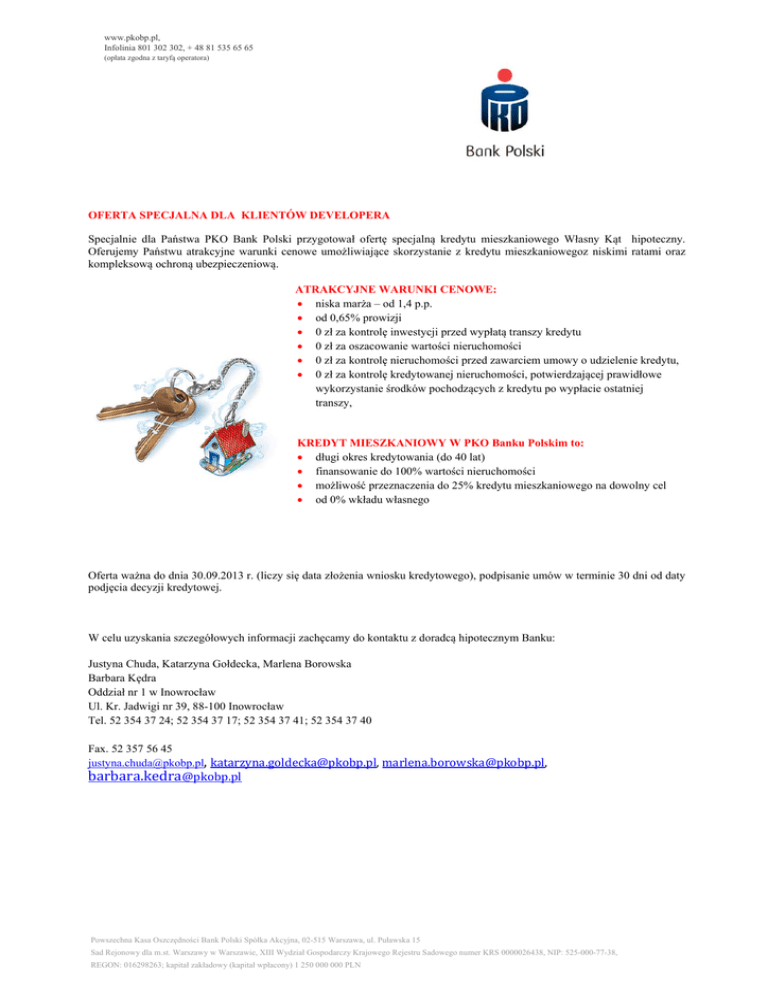 www.pkobp.pl, Infolinia 801 302 302, + 48 81 535 65 65 (opłata zgodna z taryfą operatora) OFERTA SPECJALNA DLA KLIENTÓW DEVELOPERA Specjalnie dla Państwa PKO Bank Polski przygotował ofertę specjalną kredytu mieszkaniowego Własny Kąt hipoteczny. Oferujemy Państwu atrakcyjne warunki cenowe umożliwiające skorzystanie z kredytu mieszkaniowegoz niskimi ratami oraz kompleksową ochroną ubezpieczeniową. ATRAKCYJNE WARUNKI CENOWE: niska marża – od 1,4 p.p. od 0,65% prowizji 0 zł za kontrolę inwestycji przed wypłatą transzy kredytu 0 zł za oszacowanie wartości nieruchomości 0 zł za kontrolę nieruchomości przed zawarciem umowy o udzielenie kredytu, 0 zł za kontrolę kredytowanej nieruchomości, potwierdzającej prawidłowe wykorzystanie środków pochodzących z kredytu po wypłacie ostatniej transzy, KREDYT MIESZKANIOWY W PKO Banku Polskim to: długi okres kredytowania (do 40 lat) finansowanie do 100% wartości nieruchomości możliwość przeznaczenia do 25% kredytu mieszkaniowego na dowolny cel od 0% wkładu własnego Oferta ważna do dnia 30.09.2013 r. (liczy się data złożenia wniosku kredytowego), podpisanie umów w terminie 30 dni od daty podjęcia decyzji kredytowej. W celu uzyskania szczegółowych informacji zachęcamy do kontaktu z doradcą hipotecznym Banku: Justyna Chuda, Katarzyna Gołdecka, Marlena Borowska Barbara Kędra Oddział nr 1 w Inowrocław Ul. Kr. Jadwigi nr 39, 88-100 Inowrocław Tel. 52 354 37 24; 52 354 37 17; 52 354 37 41; 52 354 37 40 Fax. 52 357 56 45 [email protected],[email protected],[email protected], [email protected] Powszechna Kasa Oszczędności Bank Polski Spółka Akcyjna, 02-515 Warszawa, ul. Puławska 15 Sad Rejonowy dla m.st. Warszawy w Warszawie, XIII Wydział Gospodarczy Krajowego Rejestru Sadowego numer KRS 0000026438, NIP: 525-000-77-38, REGON: 016298263; kapitał zakładowy (kapitał wpłacony) 1 250 000 000 PLN