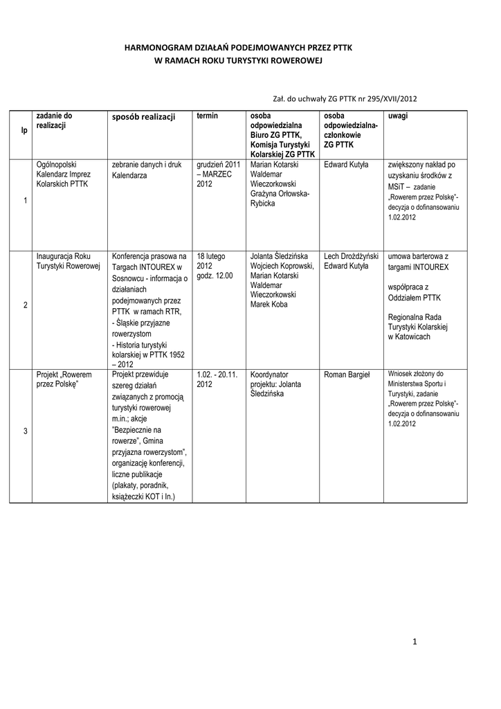 1 HARMONOGRAM DZIAŁAŃ PODEJMOWANYCH PRZEZ PTTK W