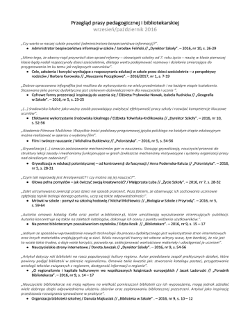 Przegląd prasy pedagogicznej i bibliotekarskiej wrzesień/październik 2016 „Czy warto w naszej szkole powołać [administratora bezpieczeństwa informacji]?”. Administrator bezpieczeństwa informacji w szkole / Jarosław Feliński // „Dyrektor Szkoły”. – 2016, nr 10, s. 26-29 „Mimo tego, że obecny rząd przywrócił stan sprzed reformy – obowiązek szkolny od 7. roku życia – naukę w klasie pierwszej klasie będą nadal rozpoczynały dzieci sześcioletnie, dlatego warto podejmować rozmowy i działania zmierzające do przygotowania im ku temu jak najlepszych warunków”. Cele, założenia i korzyści wynikające z rozpoczynania edukacji w szkole przez dzieci sześcioletnie – z perspektywy rodziców / Barbara Kurowska // „Nauczanie Początkowe”. – 2016/2017, nr 1, s. 7-19 „Dobrze opracowana infografika jest możliwa do wykorzystania na wielu przedmiotach i na każdym etapie kształcenia. Stosowana jako pomoc dydaktyczna jest ciekawym doświadczeniem dla nauczyciela i ucznia ”. Cyfrowe formy prezentacji inspiracją do uczenia się / Elżbieta Pryłowska-Nowak, Izabela Rudnicka // „Geografia w Szkole”. – 2016, nr 5, s. 23-25 „(…) środowisko lokalne jako ważny zasób pozwalający zwiększyć efektywność pracy szkoły i rozwijać kompetencje kluczowe uczniów”. Efektywne wykorzystanie środowiska lokalnego / Elżbieta Tołwińska-Królikowska // „Dyrektor Szkoły”. – 2016, nr 10, s. 52-56 „Akademia Filmowa Multikino: Wszystkie treści podstawy programowej języka polskiego na każdym etapie edukacyjnym można realizować w oparciu o wybrany film”. Film i twórcze nauczanie / Michalina Butkiewicz // „Polonistyka”. – 2016, nr 5, s. 54-56 „Grywalizacja (…) oznacza zastosowanie mechanizmów gier w nauczaniu. Stosując grywalizację, nauczyciel przenosi do struktury lekcji zasady i mechanizmy funkcjonujące w grach (zwłaszcza mechanizmy motywacyjne i systemy organizacji pracy nad określonym zadaniem)”. Grywalizacja w edukacji polonistycznej – od kontrowersji do fascynacji / Anna Podemska-Kałuża // „Polonistyka”. – 2016, nr 5, s. 28-31 „Czym tak naprawdę jest kreatywność? I czy można się jej nauczyć?”. Głowa pełna pomysłów – jak ćwiczyć swoją kreatywność? / Małgorzata Łuba // „Życie Szkoły”. – 2016, nr 7, s. 28-32 „Zalet utrzymywania zwierząt przez dzieci nie sposób przecenić. Poza faktem, że obserwując ich zachowania uczniowie zgłębiają tajniki biologii danego gatunku, uczą się także odpowiedzialności”. Mrówki w szkole : pomysł na szkolną hodowlę / Michał Michlewicz // „Biologia w Szkole z Przyrodą”. – 2016, nr 5, s. 59-64 „Autorka omawia katalog KaRo oraz portal w.bibliotece.pl, które umożliwiają wyszukiwanie interesujących publikacji. Autorka koncentruje się także na zaletach katalogów, dokonuje ich oceny z punktu widzenia użytkowników.”. Na pomoc bibliotecznym poszukiwaniom czytelnika / Edyta Kosik // „Bibliotekarz”. – 2016, nr 9, s. 15 – 17 „Jednym ze sposobów wprowadzanie nowych technologii do procesu dydaktycznego jest wykorzystanie stron internetowych oraz innych materiałów znajdujących się w sieci. Wielu nauczycieli tworzy też własne witryny www, tym bardziej, że nie jest to wcale takie trudne, a daje wiele korzyści, pozwala np. selekcjonować wartościowe materiały i udostępniać je uczniom”. Nauczycielskie strony internetowe / Dorota Janczak // „Dyrektor Szkoły”. – 2016, nr 9, s. 54-56 „Artykuł dotyczy roli biblioteki na rzecz popularyzacji kultury regionu. Autor przedstawia zespół praktycznych działań, które powinny podjąć biblioteki w zakresie regionalizmu. Omawia takie kwestie jak: stworzenie katalogu postaci, przygotowanie antologii tekstów związanych z regionem, dostępność informacji o regionie”. „O regionalizmie i kapitale kulturowym we współczesnych książnicach europejskich / Jacek Ladorucki // „Poradnik Bibliotekarza”. – 2016, nr 9, s. 14 – 17 „Nauczyciele bibliotekarze nie mają wpływu na wielkość pomieszczeń biblioteki czy ich wyposażenia, mogą jednak zdziałać wiele dobrego dzięki odpowiedniemu ułożeniu zbiorów oraz zaplanowaniu bibliotecznej przestrzeni. Artykuł jako inspirację przedstawia rozwiązania sprawdzone w praktyce”. Organizacja biblioteki szkolnej / Danuta Majkusiak // „Biblioteka w Szkole” . – 2016, nr 9, s. 10 – 12 „Przed nauczycielem, który rozpoczyna staż na poszczególny stopień awansu zawodowego, stoi na początku niełatwe wyzwanie, jakim jest opracowanie dobrego projektu planu rozwoju zawodowego. Jak zadania zaplanować, w jakiej formie je ująć, jaką przyjąć strukturę planu – to tylko niektóre z zagadnień, których znajomość może okazać się pomocna na tym etapie awansowej procedury”. Plan rozwoju zawodowego nauczyciela przedszkola / Maria Pecyna // „Wychowanie w Przedszkolu”. – 2016, nr 7, s. 34-36 „(…) zasady przydzielania nauczycielom zajęć pozalekcyjnych i pozaszkolnych oraz zapewnienia uczniom bezpiecznego w nich uczestnictwa”. Podstawy prawne organizacji zajęć dodatkowych / Michał Łyszczarz // „Dyrektor Szkoły”. – 2016, nr 9, s. 44-46 „Codzienność dyrektora szkoły pełna jest różnorakich napięć związanych z wyzwaniami, z jakimi przychodzi mu się mierzyć, i wymaga od niego profesjonalnych działań, które powinny iść w parze z dbałością o profesjonalizację tej funkcji”. Profesjonalizm pracy dyrektora / Joanna Madalińska-Michalak // „Dyrektor Szkoły”. – 2016, nr 10, s. 12-15 „Pomysł na realizację projektu, jako bloku o odżywianiu, wynika z wielu błędów żywieniowych popełnionych przez dzieci i ich rodziców oraz wiązanych z nimi negatywnych konsekwencji dla zdrowia”. Program edukacyjny dotyczący zasad zdrowego żywienia : program przeznaczony do realizacji w klasach IV-V szkoły podstawowej / Magdalena Krzelowska // „Wychowanie 