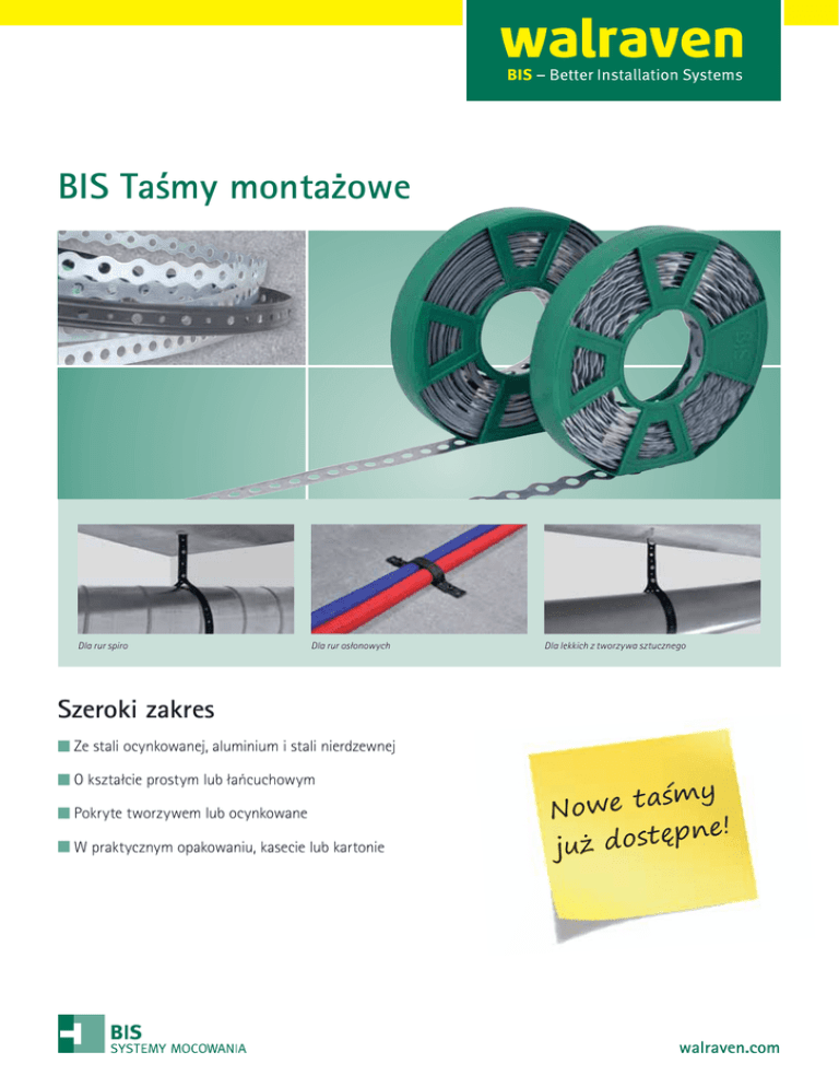 BIS Taśmy montażowe Dla rur spiro Dla rur osłonowych Dla lekkich z tworzywa sztucznego Szeroki zakres Ze stali ocynkowanej, aluminium i stali nierdzewnej O kształcie prostym lub łańcuchowym Pokryte tworzywem lub ocynkowane W praktycznym opakowaniu, kasecie lub kartonie my ś a t e w No ne! p ę t s o d już walraven.com BIS Taśmy montażowe - proste Stalowe, ocynkowane metodą Sendzimira k s b d1 Nr. kat. bxs (mm) 083 1 012 083 1 017 083 1 026 083 0 012 083 0 017 12 x 0,8 17 x 0,8 26 x 1,0 12 x 1,0 17 x 1,0 Nr. kat. bxs (mm) 083 2 714 083 2 728 083 2 719 083 2 019 14 x 3,0 26 x 3,2 19 x 3,0 19 x 3,0 L k d1 (m) (mm) (mm) 10 10 10 10 10 8 12 14 8 12 5,0 7,0 8,5 5,0 7,0 Fa,z (N) Pud. (szt.) 560 800 1.800 880 1.230 10 10 10 10 10 Stalowe, powlekane tworzywem d1 # 083 2 714 # 083 2 728 1 mm b s k d1 d2 # 083 2 719 # 083 2 019 1 mm b s k L k d1 d2 (m) (mm) (mm) (mm) 10 10 10 10 15 16 15 15 4,5 8,5 4,5 4,5 6,5 6,5 Fa,z (N) Pud. (szt.) 880 1.400 1.230 1.230 1 1 1 1 Stalowe, ocynkowane z potrójną perforacją k Nowość! s Nr. kat. b d1 bxs (mm) L k d1 d1 (m) (mm) (mm) (mm) 083 1 0117 17 x 0,8 10 083 1 0125 25 x 0,8 10 d2 12 14 3,0 4,0 Fa,z (N) Pud. (szt.) ? ? 10 10 7,0 8,5 Taśmy montażowe - łańcuchowe Stalowe, ocynkowane metodą Sendzimira k Nowość! s b Nr. kat. bxs (mm) 083 5 012 12 x 0,8 083 5 017 17 x 0,8 083 5 026 26 x 1,0 d1 L k (m) (mm) 10 10 10 14,5 20,2 25,0 d1 (mm) Fa,z (N) Pud. (szt.) 5,0 7,0 8,0 560 800 1.800 10 10 10 Aluminiowe Nowość! s Nr. kat. b bxs (mm) 083 4 112 12 x 1,0 083 4 117 17 x 1,0 d1 L k (m) (mm) 10 10 14,5 20,2 d1 (mm) Fa,z (N) Pud. (szt.) 5,0 7,0 190 270 10 10 Ze stali nierdzewnej Nowość! k b d1 s Nr. kat. bxs (mm) 083 3 012 12 x 0,8 083 3 017 17 x 0,8 083 3 026 26 x 1,0 L k d1 (m) (mm) (mm) Fa,z (N) Pud. (szt.) 10 10 10 1.210 1.730 3.900 10 10 10 Walraven Sp. z o.o | Tel. +48 (0)12 684 00 95 | [email protected] 14 20 25 5,0 7,0 8,0 walraven.com BIS Suspension Band (PL) - 07/2013 - PDF - Zastrzega się możliwość wprowadzenia zmian k