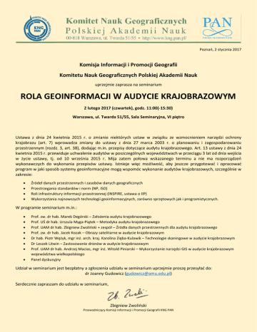 Poznań, 2 stycznia 2017 Komisja Informacji i Promocji Geografii Komitetu Nauk Geograficznych Polskiej Akademii Nauk uprzejmie zaprasza na seminarium ROLA GEOINFORMACJI W AUDYCIE KRAJOBRAZOWYM 2 lutego 2017 (czwartek), godz. 11:00(-15:30) Warszawa, ul. Twarda 51/55, Sala Seminaryjna, VI piętro Ustawa z dnia 24 kwietnia 2015 r. o zmianie niektórych ustaw w związku ze wzmocnieniem narzędzi ochrony krajobrazu (art. 7) wprowadza zmiany do ustawy z dnia 27 marca 2003 r. o planowaniu i zagospodarowaniu przestrzennym (rozdz. 3, art. 38), dodając m.in. przepisy dotyczące audytu krajobrazowego. Art. 13 ustawy z dnia 24 kwietnia 2015 r. przewiduje uchwalenie audytów w poszczególnych województwach w przeciągu 3 lat od dnia wejścia w życie ustawy, tj. od 10 września 2015 r. Mija zatem połowa wskazanego terminu a nie ma rozporządzeń wykonawczych do wykonania przepisów ustawy. Istnieje więc możliwość, aby jeszcze przygotować i opracować program w jaki sposób systemy geoinformacyjne mogą wspomóc wykonanie audytów krajobrazowych, szczególnie w zakresie: Źródeł danych przestrzennych i zasobów danych geograficznych Przestrzegania standardów i norm (NP, ISO) Roli infrastruktury informacji przestrzennej (INSPIRE, ustawa o IIP) Wykorzystania najnowszych technologii geoinformacyjnych, zarówno sprzętowych jak i programistycznych. W programie seminarium m.in.: Prof. zw. dr hab. Marek Degórski – Założenia audytu krajobrazowego Prof. UŚ dr hab. Urszula Myga-Piątek – Metodyka audytu krajobrazowego Prof. UAM dr hab. Zbigniew Zwoliński + zespół – Źródła danych przestrzennych dla audytu krajobrazowego Prof. zw. dr hab. Jacek Kozak – Obrazy satelitarne w audycie krajobrazowym Dr hab. Piotr Wężyk, mgr inż. arch. kraj. Karolina Zięba-Kulawik – Technologie skaningowe w audycie krajobrazowym Dr Leszek Litwin – Zastosowanie dronów w audycie krajobrazowym Prof. UAM dr hab. Andrzej Macias, mgr inż. Witold Piniarski – Wykorzystanie narzędzi GIS w audycie krajobrazowym województwa wielkopolskiego Panel dyskusyjny Udział w seminarium jest bezpłatny a zgłoszenia udziału w seminarium uprzejmie proszę przesyłać do: dr Joanny Gudowicz ([email protected]) Serdecznie zapraszam do udziału w seminarium, Zbigniew Zwoliński Przewodniczący Komisji Informacji i Promocji Geografii KNG PAN