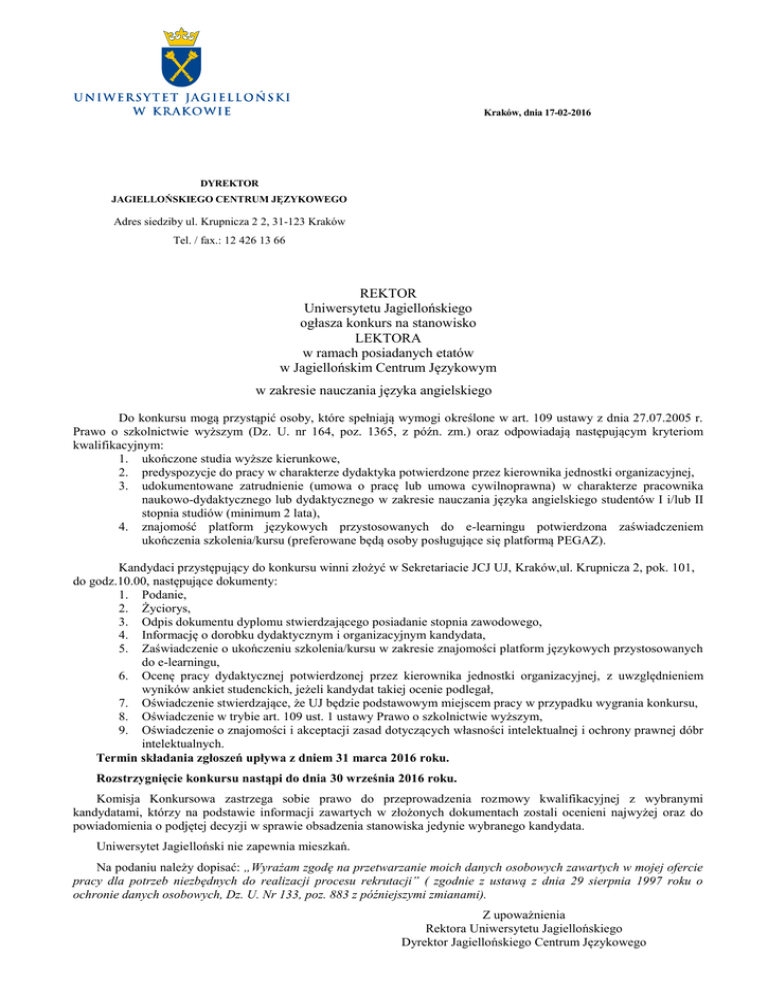 Kraków, dnia 17-02-2016 DYREKTOR JAGIELLOŃSKIEGO CENTRUM JĘZYKOWEGO Adres siedziby ul. Krupnicza 2 2, 31-123 Kraków Tel. / fax.: 12 426 13 66 REKTOR Uniwersytetu Jagiellońskiego ogłasza konkurs na stanowisko LEKTORA w ramach posiadanych etatów w Jagiellońskim Centrum Językowym w zakresie nauczania języka angielskiego Do konkursu mogą przystąpić osoby, które spełniają wymogi określone w art. 109 ustawy z dnia 27.07.2005 r. Prawo o szkolnictwie wyższym (Dz. U. nr 164, poz. 1365, z późn. zm.) oraz odpowiadają następującym kryteriom kwalifikacyjnym: 1. ukończone studia wyższe kierunkowe, 2. predyspozycje do pracy w charakterze dydaktyka potwierdzone przez kierownika jednostki organizacyjnej, 3. udokumentowane zatrudnienie (umowa o pracę lub umowa cywilnoprawna) w charakterze pracownika naukowo-dydaktycznego lub dydaktycznego w zakresie nauczania języka angielskiego studentów I i/lub II stopnia studiów (minimum 2 lata), 4. znajomość platform językowych przystosowanych do e-learningu potwierdzona zaświadczeniem ukończenia szkolenia/kursu (preferowane będą osoby posługujące się platformą PEGAZ). Kandydaci przystępujący do konkursu winni złożyć w Sekretariacie JCJ UJ, Kraków,ul. Krupnicza 2, pok. 101, do godz.10.00, następujące dokumenty: 1. Podanie, 2. Życiorys, 3. Odpis dokumentu dyplomu stwierdzającego posiadanie stopnia zawodowego, 4. Informację o dorobku dydaktycznym i organizacyjnym kandydata, 5. Zaświadczenie o ukończeniu szkolenia/kursu w zakresie znajomości platform językowych przystosowanych do e-learningu, 6. Ocenę pracy dydaktycznej potwierdzonej przez kierownika jednostki organizacyjnej, z uwzględnieniem wyników ankiet studenckich, jeżeli kandydat takiej ocenie podlegał, 7. Oświadczenie stwierdzające, że UJ będzie podstawowym miejscem pracy w przypadku wygrania konkursu, 8. Oświadczenie w trybie art. 109 ust. 1 ustawy Prawo o szkolnictwie wyższym, 9. Oświadczenie o znajomości i akceptacji zasad dotyczących własności intelektualnej i ochrony prawnej dóbr intelektualnych. Termin składania zgłoszeń upływa z dniem 31 marca 2016 roku. Rozstrzygnięcie konkursu nastąpi do dnia 30 września 2016 roku. Komisja Konkursowa zastrzega sobie prawo do przeprowadzenia rozmowy kwalifikacyjnej z wybranymi kandydatami, którzy na podstawie informacji zawartych w złożonych dokumentach zostali ocenieni najwyżej oraz do powiadomienia o podjętej decyzji w sprawie obsadzenia stanowiska jedynie wybranego kandydata. Uniwersytet Jagielloński nie zapewnia mieszkań. Na podaniu należy dopisać: „Wyrażam zgodę na przetwarzanie moich danych osobowych zawartych w mojej ofercie pracy dla potrzeb niezbędnych do realizacji procesu rekrutacji” ( zgodnie z ustawą z dnia 29 sierpnia 1997 roku o ochronie danych osobowych, Dz. U. Nr 133, poz. 883 z późniejszymi zmianami). Z upoważnienia Rektora Uniwersytetu Jagiellońskiego Dyrektor Jagiellońskiego Centrum Językowego