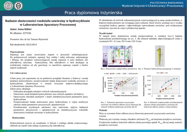 Praca dyplomowa inżynierska Badanie skuteczności rozdziału zawiesiny w hydrocyklonie w Laboratorium Aparatury Procesowej Autor: Anna Kibler Nr albumu: 227236 Promotor: doc. dr inż. Tomasz Wąsowski W odróżnieniu od wirówek sedymentacyjnych wykorzystujących tą samą zasadę działania, w budowie hydrocyklonów nie występują części ruchome. Ruch wirowy uzyskuje się w wyniku szczególnej budowy aparatu i odpowiedniego wprowadzania zawiesiny- pod zwiększonym ciśnieniem, stycznie do części cylindrycznej aparatu. Wyniki badań W ramach pracy dyplomowej zostały przeprowadzone w instalacji (rys.1) badania hydrocyklonu przedstawionego na rys. 2. dla różnych nakładek odprowadzających szlam o wymiarach D1= 4,5 mm, D2=6 mm i D3=8 mm. Rok akademicki: 2013/2014 Celem pracy jest zapoznanie się na podstawie przeglądu literatury z budową i zasadą działania hydrocyklonów, przeprowadzenie badań skuteczności rozdziału zawiesiny w hydrocyklonie, zbudowanym w ramach ćwiczenia naukowo-dydaktycznego w Laboratorium Aparatury Procesowej. Zakres pracy obejmuje: - Dokonanie przeglądu rodzajów wirówek sedymentacyjnych - Omówienie zasad działania hydrocyklonów oraz różnych aspektów ich budowy - Opracowanie metodyki pomiarów i analiz charakterystycznych parametrów pracy hydrocyklonu - Przeprowadzenie badań skuteczności pracy hydrocyklonu w całym możliwym zakresie zmian parametrów procesowych i aparaturowych - Przedstawienie uzyskanych zależności oraz omówienie wpływu badanych parametrów procesowych i aparaturowych na charakterystyczne wskaźniki skuteczności rozdziału zawiesiny w hydrocyklonie. Hydrocyklon Hydrocyklonem nazywa się urządzenie, w którym z ciekłego układu rozproszonego, oddziela się cząstki ciała stałego za pomocą siły odśrodkowej. 1400 2000 2400 2800 100,00% 90,00% 80,00% 70,00% 60,00% 50,00% 500 1500 D1 3200 [dm3/h] 2500 Przepływ cieczy klarownej [dm3/h]] Współczynnik uwielokrotnienia max Cel i zakres pracy Rys.1. Rzeczywisty wygląd tablicy pomiarowej Rys. 2. Wymiary hydrocyklonu pracującego w instalacji Sprawność oczyszczania zawiesiny Wprowadzenie Separacja jest często stosowanym etapem w procesach technologicznych. Do podstawowych rodzajów separacji fazy ciekłej i stałej zaliczamy sedymentację i filtrację. Do urządzeń wykorzystujących zasadę separacji w polu działania siły odśrodkowej zaliczamy hydrocyklony. Siły odśrodkowe w nich działające są wielokrotnie większe od siły grawitacji, co umożliwia separacje cząstek o bardzo małych średnicach. D2 D3 20,00 15,00 10,00 5,00 0,00 0 1000 2000 3000 4000 Przepływ zawiesiny [dm3/h] Rys. 3. Zależność sprawności oczyszczania zawiesiny od wielkości odbioru cieczy klarownej dla różnych wielkości podawanej zawiesiny dla D1 Rys. 4. Zależność współczynnika uwielokrotnienia stężenia szlamu od przepływu zawiesiny dla końcówek odbioru szlamu o różnej średnicy Wnioski Wraz ze wzrostem ilości odbioru cieczy klarownej sprawność oczyszczania zawiesiny wzrasta. Widoczny jest wyraźny rosnący charakter zależności Wmax od natężenia przepływu zawiesiny. Zwiększenie średnicy końcówki odbioru szlamu powoduje spadek Wmax dla tej samej wartości przepływu zawiesiny.