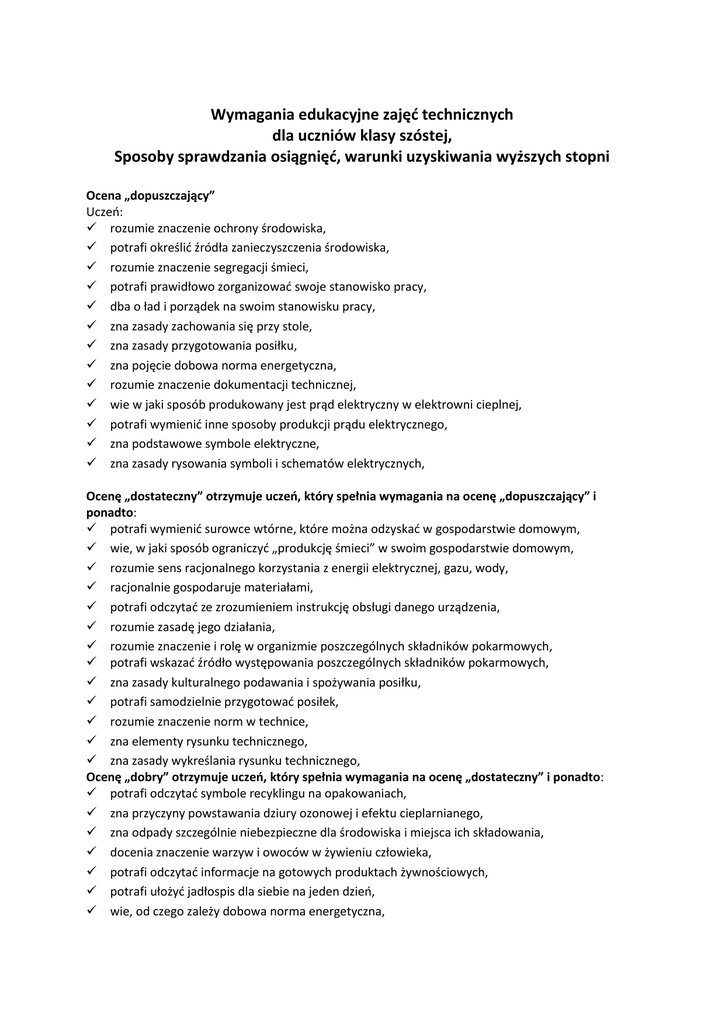 Wymagania edukacyjne zajęć technicznych dla uczniów klasy szóstej, Sposoby sprawdzania osiągnięć, warunki uzyskiwania wyższych stopni Ocena „dopuszczający” Uczeń: rozumie znaczenie ochrony środowiska, potrafi określić źródła zanieczyszczenia środowiska, rozumie znaczenie segregacji śmieci, potrafi prawidłowo zorganizować swoje stanowisko pracy, dba o ład i porządek na swoim stanowisku pracy, zna zasady zachowania się przy stole, zna zasady przygotowania posiłku, zna pojęcie dobowa norma energetyczna, rozumie znaczenie dokumentacji technicznej, wie w jaki sposób produkowany jest prąd elektryczny w elektrowni cieplnej, potrafi wymienić inne sposoby produkcji prądu elektrycznego, zna podstawowe symbole elektryczne, zna zasady rysowania symboli i schematów elektrycznych, Ocenę „dostateczny” otrzymuje uczeń, który spełnia wymagania na ocenę „dopuszczający” i ponadto: potrafi wymienić surowce wtórne, które można odzyskać w gospodarstwie domowym, wie, w jaki sposób ograniczyć „produkcję śmieci” w swoim gospodarstwie domowym, rozumie sens racjonalnego korzystania z energii elektrycznej, gazu, wody, racjonalnie gospodaruje materiałami, potrafi odczytać ze zrozumieniem instrukcję obsługi danego urządzenia, rozumie zasadę jego działania, rozumie znaczenie i rolę w organizmie poszczególnych składników pokarmowych, potrafi wskazać źródło występowania poszczególnych składników pokarmowych, zna zasady kulturalnego podawania i spożywania posiłku, potrafi samodzielnie przygotować posiłek, rozumie znaczenie norm w technice, zna elementy rysunku technicznego, zna zasady wykreślania rysunku technicznego, Ocenę „dobry” otrzymuje uczeń, który spełnia wymagania na ocenę „dostateczny” i ponadto: potrafi odczytać symbole recyklingu na opakowaniach, zna przyczyny powstawania dziury ozonowej i efektu cieplarnianego, zna odpady szczególnie niebezpieczne dla środowiska i miejsca ich składowania, docenia znaczenie warzyw i owoców w żywieniu człowieka, potrafi odczytać informacje na gotowych produktach żywnościowych, potrafi ułożyć jadłospis dla siebie na jeden dzień, wie, od czego zależy dobowa norma energetyczna, wie, ile wynosi dobowa norma energetyczna w jego wieku, rozumie konieczność wymiarowania rysunku i zna zasady wymiarowania, zna zasady rysowania w rzutach prostokątnych, zna rodzaje pisma technicznego, potrafi wymienić elementy elektryczne przykładowych urządzeń elektrycznych w gospodarstwie domowym, potrafi czytać schematy elektryczne, umie zmontować obwód elektryczny na podstawie schematu, potrafi opisać rolę poszczególnych elementów wykonanej instalacji, Ocenę „bardzo dobry” otrzymuje uczeń, który spełnia wymagania na ocenę „dobry” i ponadto: potrafi wytłumaczyć związek między produkcją, np. prądu elektrycznego, a zanieczyszczeniem środowiska, potrafi samodzielnie przenieść wymiary z rysunku na materiał, potrafi rysować przedmioty w rzutach aksonometrycznych, zna zasady wymiarowania przedmiotów potrafi wymienić wady tworzyw sztucznych, potrafi wytłumaczyć zależność między produkcją tworzyw sztucznych a zanieczyszczeniem środowiska, potrafi przygotować dokumentację techniczną, prawidłowo nazywa poszczególne operacje technologiczne, potrafi wyjaśnić pojęcie urządzenie energooszczędne, potrafi wskazać sposoby zagospodarowania odpadków produktów żywnościowych, potrafi wyjaśnić pojęcie zdrowa żywność, zna podstawowe witaminy i składniki mineralne oraz ich rolę w organizmie, potrafi obliczyć wartość energetyczną przygotowanej potrawy, zna skutki nieprawidłowego odżywiania się, potrafi wyjaśnić pojęcie dieta, rozumie niebezpieczeństwo wynikające ze stosowania różnego rodzaju diet, potrafi pisać pismem technicznym prostym, potrafi zwymiarować prostą figurę, potrafi wykreślić w rzutach prostokątnych prostą bryłę, potrafi przyporządkować rzutowanie do bryły i bryłę do rzutowania, wie, w jaki sposób dociera prąd elektryczny do naszych mieszkań, rozumie problem odzyskiwania, składowania i likwidacji baterii i akumulatorów, Ocenę „celujący” otrzymuje uczeń, który spełnia wymagania na ocenę „bardzo dobry” i ponadto: czynnie uczestniczy w akcjach zbiórki baterii, opakowań aluminiowych, makulatury, bierze udział w konkursach poświęconych ekologii, uczestniczy w konkursach plastycznych związanych z produkcją i obróbką papieru, potrafi rozpoznać i wymienić nazwy materiałów drewnopochodnych, prezentuje swoje wytwory na konkursach i wystawach, potrafi wykonać samodzielnie karmnik dla ptaków, zakładkę do książki, ozdobną serwetkę, itp., zna podstawowe nazwy włókien sztucznych, potrafi rozróżnić, nazwać i wskazać zastosowanie podstawowych tworzyw sztucznych, potrafi odczytać informacje z tabliczki znamionowej urządzenia, potrafi wyjaśnić pojęcia: konserwanty, polepszacze, potrafi omówić sposoby konserwowania żywności, potrafi wskazać błędy w rzutowaniu i wymiarowaniu, potrafi wskazać sposoby oszczędzania energii elektrycznej w swoim domu Sposoby sprawdzania osiągnięć, warunki uzyskiwania wyższych stopni z zajęć technicznych są zgodne z zasadami oceniania wewnątrzszkolnego i znajdują się w rozdziale 7 Statutu Szkoły mgr Danuta Wicherek mgr Izabela Zdebska