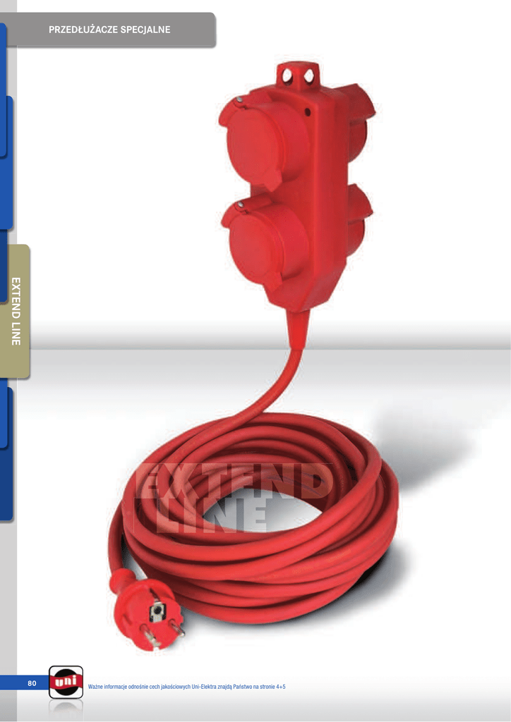 PRZEDŁUŻACZE SPECJALNE EXTEND LINE 80 Ważne informacje odnośnie cech jakościowych Uni-Elektra znajdą Państwo na stronie 4+5 PRZEDŁUŻACZE SPECJALNE PRZEDŁUŻACZE Z ZESTYKIEM OCHRONNYM IP20 Przedłużacz z tworzywa sztucznego – H05VV-F do stosowania wewnątrz z wtyczką z zestykiem ochronnym i gniazdem Nr art. Typ Opis Opak. Ciężar g Nr EAN 41 384B H05VV-F 5m H05VV-F 3G1,5 1 41 385B H05VV-F 10m H05VV-F 3G1,5 1 § 1000 4003038413855 41 740B H05VV-F 25m H05VV-F 3G1.5 1 § 2400 4003038417402 41 741B H05VV-F 50m H05VV-F 3G1,5 1 § 4750 4003038417419 10m H05VV-F 3G1,5 1 § 1000 4003038716758 71 676B H05VV-F 25m H05VV-F 3G1.5 1 § 2400 4003038716765 71 677B H05VV-F 50m H05VV-F 3G1,5 1 § 4750 4003038716772 czarna § 550 4003038413848 czerwony 71 675B H05VV-F IP20 do stosowania wewnątrz z wtyczką z zestykiem ochronnym i gniazdem potrójnym Nr art. Typ Opis Opak. Ciężar g Nr EAN 5m H05VV-F 3G1,5 1 IP20 § 650 EXTEND LINE czarna 41 470B H05VV-F 4003038414708 41 519B H05VV-F 10m H05VV-F 3G1,5 1 § 1100 4003038415194 41 520B H05VV-F 25m H05VV-F 3G1,5 1 § 2500 4003038415200 do stosowania wewnątrz z wtyczką z zestykiem ochronnym i gniazdem poczwórnym Nr art. Typ Opis Opak. Ciężar g Nr EAN czarna 41 692 H05VV-F 5m H05VV-F 3G1,5 1 § 900 4003038416924 41 687 H05VV-F 10m H05VV-F 3G1,5 1 § 1400 4003038416870 do stosowania wewnątrz z wtyczką z zestykiem ochronnym i 6-krotnym gniazdem Nr art. Typ Opis Opak. Ciężar g Nr EAN 5m H05VV-F 3G1,5 1 czarna 41 693 H05VV-F § 1000 4003038416931 Przedłużacz gumowy – H05RR-F do stosowania na zewnątrz z wtyczką z zestykiem ochronnym i gniazdem Nr art. IP44 Typ Opis Opak. Ciężar g Nr EAN czarna § 850 4003038413909 41 390B H05RR-F 5m H05RR-F 3G1,5 1 41 391B H05RR-F 10m H05RR-F 3G1,5 1 § 1500 4003038413916 41 392B H05RR-F 25m H05RR-F 3G1.5 1 § 3500 4003038413923 41 393B H05RR-F 50m H05RR-F 3G1,5 1 § 6900 4003038413930 41 437B H05RR-F 5m H05RR-F 3G2,5 1 § 1000 4003038414371 41 410B H05RR-F 10m H05RR-F 3G2,5 1 § 1850 4003038414104 41 411B H05RR-F 25m H05RR-F 3G2,5 1 § 4400 4003038414111 41 438B H05RR-F 50m H05RR-F 3G2,5 1 § 8650 4003038414388 Produkty, do których numerów katalogowych dodano »B«, są (ewentualniewbrew rysunkowi) dostarczane w wykonaniu z kołkiem (bolcem) uziemiającym. 81 PRZEDŁUŻACZE I PRZEWODY ADAPTEROWE PRZEDŁUŻACZE Z ZESTYKIEM OCHRONNYM Przedłużacz gumowy – H05RR-F IP44 do stosowania na zewnątrz z gumową wtyczką z zestykiem ochronnym i 3-krotnym-gumowym łącznikiem z klapką samozamykającą Nr art. Typ Opis Opak. Ciężar g Nr EAN 41 524B H05RR-F 5m H05RR-F 3G1,5 1 § 1200 41 522B H05RR-F 10m H05RR-F 3G1,5 1 § 1850 4003038415224 41 523B H05RR-F 25m H05RR-F 3G1,5 1 § 3875 4003038415231 4003038413893 czarna 4003038415248 41 389B H05RR-F 50m H05RR-F 3G1,5 1 § 7250 41 361B H05RR-F 5m H05RR-F 3G2,5 1 § 1350 4003038413619 41 362B H05RR-F 10m H05RR-F 3G2,5 1 § 2200 41 363B H05RR-F 25m H05RR-F 3G2,5 1 § 4750 4003038413633 4003038413626 EXTEND LINE Przedłużacz neoprenowy – H07RN-F IP44 do stosowania na zewnątrz z wtyczką z zestykiem ochronnym i łącznikiem Nr art. Typ Opis Opak. Ciężar g Nr EAN 41 395B H07RN-F 5m 3G1,5 1 41 396B H07RN-F 10m 3G1,5 1 § 1750 4003038413961 41 397B H07RN-F 25m 3G1,5 1 § 4150 41 398B H07RN-F 50m 3G1,5 1 § 8150 4003038413985 41 417B H07RN-F 5m 3G2,5 1 § 1250 4003038414173 czarna § 950 4003038413954 4003038413978 41 412B H07RN-F 10m 3G2,5 1 § 2350 4003038414128 41 413B H07RN-F 25m 3G2,5 1 § 5650 41 456B H07RN-F 50m 3G2,5 1 4003038414135 § 11250 4003038414562 Przedłużacz PUR – H07BQ-F IP44 do stosowania na zewnątrz z wtyczką z zestykiem ochronnym i łącznikiem Nr art. Typ Opis Opak. Ciężar g Nr EAN pomarańczowy (H07BQ-F poliuretanowy przewód budowlany z żyłami izolowanymi gumą, przeznaczony dla wysokich obciążeń mechanicznych) 82 71 786B H07BQ-F 10m 3G1,5 1 § 1170 4003038717861 71 787B H07BQ-F 25m 3G1,5 1 § 2700 4003038717878 71 788B H07BQ-F 50m 3G1,5 1 § 5250 4003038717885 71 792B H07BQ-F 25m 3G2,5 1 § 3950 4003038717922 71 793B H07BQ-F 50m 3G2,5 1 § 7750 4003038717939 Ważne informacje odnośnie cech jakościowych Uni-Elektra znajdą Państwo na stronie 4+5 PRZEDŁUŻACZE SPECJALNE PRZEDŁUŻACZE Z ZESTYKIEM OCHRONNYM Przedłużacz neoprenowy – H07RN-F IP44 do stosowania na zewnątrz z wtyczką z zestykiem ochronnym i potrójnym gniazdem łącznikiem z gumy z klapką samozamykającą Nr art. Typ Opis Opak. Ciężar g Nr EAN czarna 41 388B H07RN-F 5m 3G1,5 1 § 1350 4003038413886 41 399B H07RN-F 10m 3G1,5 1 § 2150 4003038413992 41 394B H07RN-F 25m 3G1,5 1 § 4550 4003038413947 41 457B H07RN-F 5m 3G2,5 1 § 1650 41 458B H07RN-F 10m 3G2,5 1 § 2750 4003038414586 41 459B H07RN-F 25m 3G2,5 1 § 6050 1 § 3100 4003038717977 4003038414579 4003038414593 pomarańczowy 71 797B H07BQ-F do stosowania na zewnątrz z wtyczką z zestykiem ochronnym i poczwórnym czerwonym gniazdem zawieszanym z klapką samozamykającą Nr art. Typ Opis Opak. Ciężar g Nr EAN 2m 3G1,5 1 EXTEND LINE IP44 25m 3G1,5 czarna IP44 § 700 4003038416955 41 695 H07RN-F 41 684 H07RN-F 5m 3G1,5 1 § 1200 4003038416849 41 689 H07RN-F 10m 3G1,5 1 § 2000 4003038416894 do stosowania na zewnątrz z wtyczką z zestykiem ochronnym i 6-krotnym czerwonym gniazdem zawieszanym z klapką samozamykającą Nr art. Typ Opis Opak. Ciężar g Nr EAN 2m 3G1,5 1 czarna 41 690 IP68 H07RN-F § 800 4003038416900 41 691 H07RN-F 5m 3G1,5 1 § 1300 4003038416917 41 697 H07RN-F 10m 3G1,5 1 § 2200 4003038416979 do stosowania na zewnątrz z wtyczką z zestykiem ochronnym i gniazdem Nr art. Typ Opis Opak. Ciężar g Nr EAN czarna IP68 71 726 H07RN-F 10m H07RN-F 3G2,5 1 § 2500 4003038717267 71 727 H07RN-F 25m H07RN-F 3G2,5 1 § 5800 4003038717274 do stosowania na zewnątrz z wtyczką z zestykiem ochronnym i potrójnym gniazdem z tworzywa sztucznego Nr art. Typ Opis Opak. Ciężar g Nr EAN 10m H07RN-F 3G2,5 1 czarna 71 729 H07RN-F § 2700 4003038717298 Produkty, do których numerów katalogowych dod