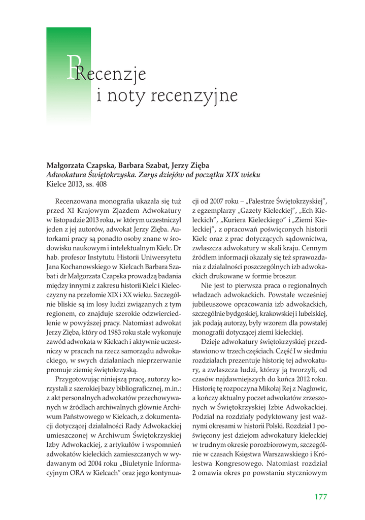 RRecenzje i noty recenzyjne Małgorzata Czapska, Barbara Szabat, Jerzy Zięba Adwokatura Świętokrzyska. Zarys dziejów od początku XIX wieku Kielce 2013, ss. 408 Recenzowana monografia ukazała się tuż przed XI Krajowym Zjazdem Adwokatury w listopadzie 2013 roku, w którym uczestniczył jeden z jej autorów, adwokat Jerzy Zięba. Autorkami pracy są ponadto osoby znane w środowisku naukowym i intelektualnym Kielc. Dr hab. profesor Instytutu Historii Uniwersytetu Jana Kochanowskiego w Kielcach Barbara Szabat i dr Małgorzata Czapska prowadzą badania między innymi z zakresu historii Kielc i Kielecczyzny na przełomie XIX i XX wieku. Szczególnie bliskie są im losy ludzi związanych z tym regionem, co znajduje szerokie odzwierciedlenie w powyższej pracy. Natomiast adwokat Jerzy Zięba, który od 1983 roku stale wykonuje zawód adwokata w Kielcach i aktywnie uczestniczy w pracach na rzecz samorządu adwokackiego, w swych działaniach nieprzerwanie promuje ziemię świętokrzyską. Przygotowując niniejszą pracę, autorzy korzystali z szerokiej bazy bibliograficznej, m.in.: z akt personalnych adwokatów przechowywanych w źródłach archiwalnych głównie Archiwum Państwowego w Kielcach, z dokumentacji dotyczącej działalności Rady Adwokackiej umieszczonej w Archiwum Świętokrzyskiej Izby Adwokackiej, z artykułów i wspomnień adwokatów kieleckich zamieszczanych w wydawanym od 2004 roku „Biuletynie Informacyjnym ORA w Kielcach” oraz jego kontynua- cji od 2007 roku – „Palestrze Świętokrzyskiej”, z egzemplarzy „Gazety Kieleckiej”, „Ech Kieleckich”, „Kuriera Kieleckiego” i „Ziemi Kieleckiej”, z opracowań poświęconych historii Kielc oraz z prac dotyczących sądownictwa, zwłaszcza adwokatury w skali kraju. Cennym źródłem informacji okazały się też sprawozdania z działalności poszczególnych izb adwokackich drukowane w formie broszur. Nie jest to pierwsza praca o regionalnych władzach adwokackich. Powstałe wcześniej jubileuszowe opracowania izb adwokackich, szczególnie bydgoskiej, krakowskiej i lubelskiej, jak podają autorzy, były wzorem dla powstałej monografii dotyczącej ziemi kieleckiej. Dzieje adwokatury świętokrzyskiej przedstawiono w trzech częściach. Część I w siedmiu rozdziałach prezentuje historię tej adwokatury, a zwłaszcza ludzi, którzy ją tworzyli, od czasów najdawniejszych do końca 2012 roku. Historię tę rozpoczyna Mikołaj Rej z Nagłowic, a kończy aktualny poczet adwokatów zrzeszonych w Świętokrzyskiej Izbie Adwokackiej. Podział na rozdziały podyktowany jest ważnymi okresami w historii Polski. Rozdział 1 poświęcony jest dziejom adwokatury kieleckiej w trudnym okresie porozbiorowym, szczególnie w czasach Księstwa Warszawskiego i Królestwa Kongresowego. Natomiast rozdział 2 omawia okres po powstaniu styczniowym 177 Recenzje i noty recenzyjne i reformie sądownictwa z 1876 roku, kiedy to nastąpiła całkowita rusyfikacja sądownictwa. Na tak trudnym dla zachowania polskości tle zaprezentowano sylwetki ówczesnych adwokatów kieleckich oraz ich dużą aktywność społeczną i zaangażowanie polityczne. Zaznacza się tu stały wzrost liczby obrońców w Kielcach, gdyż stanowiska sędziów były zarezerwowane dla Rosjan. Do zawodu adwokata pociągała też widoczna, stosunkowo mniejsza niż w urzędach państwowych, zależność od władz carskich. W czasach zawieruchy wojennej, o czym traktuje rozdział 3, rozpoczęła się ewakuacja sądownictwa Królestwa Polskiego, w tym i Kielecczyzny, w głąb Rosji. Jednak adwokaci nie zamierzali się ewakuować. Okres I wojny światowej to swego rodzaju egzamin dla kieleckiego środowiska adwokackiego. Kielce okupowane były przez wszystkie wojska zaborcze, co wprowadzało chaos organizacyjny w strukturach sądownictwa. Adwokaci jednak nie ustawali w wysiłkach tworzenia podstaw spolonizowanego sądownictwa. Należy wspomnieć, że adwokaci kieleccy już w czasie wojny zaczęli tworzyć podstawy przyszłej samorządnej adwokatury polskiej oraz nie zaprzestali swojej działalności politycznej. Głównie na łamach wychodzącej wówczas prasy prezentowali swoje poglądy na temat kształtu nowej państwowości polskiej. Wielu adwokatów włączyło się też w działalność społeczną, pomagając ludności miasta w trudnych warunkach wojennych, aktywnie działając w ramach Komitetu Obywatelskiego, następnie Komitetu Ratunkowego miasta Kielc. Rozdział 4 przybliża losy adwokatury kieleckiej w okresie międzywojennym. Jest to jeden z trudniejszych okresów państwowości polskiej. To czas tworzenia nowych podstaw prawnych, zasad organizacyjnych i samorządności. W rozdziale tym zaprezentowano również sylwetki niektórych byłych adwokatów kieleckich, którzy wykorzystali ten czas ciągłych zmian do budowania własnych karier politycznych, jak na przykład Bolesław Markowski, który w latach 1921–1925 był wiceministrem skarbu, czy zawrotna kariera 178 PALESTRA Zygmunta Nowickiego, pierwszego polskiego konsula generalnego RP w Chicago. W okresie międzywojennym problemem okazało się też dopuszczenie kobiet do zawodu adwokata. Mimo wywalczonego już równouprawnienia płci nadal pozostawało ono tylko na papierze. Pierwsza kobieta w palestrze świętokrzyskiej pojawiła się dopiero w 1938 roku. Była to Helena Plenkiewicz z Kielc. Kolejny rozdział przedstawia dzieje adwokatury kieleckiej w okresie II wojny światowej i okupacji hitlerowskiej. Widoczne jest wówczas uszczuplenie palestry kieleckiej w wyniku wyniszczającej polityki okupanta dotyczącej głównie ludności pochodzenia żydowskiego. Na zmniejszenie liczby adwokatów w Kielcach miał też wpływ udział w wojnie obronnej we wrześniu 1939 roku, dotyczy to np. tragicznych losów Jerzego Mariana Wojciechowskiego, który został rozstrzelany w Charkowie, oraz zaangażowanie się w działalność ruchu oporu, jak w przypadku np. Ludwika Koprowskiego, który w 1940 roku został ar