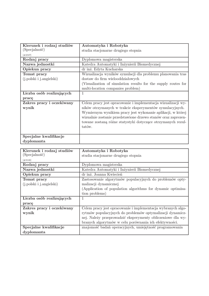 Kierunek i rodzaj studiów (Specjalność) Automatyka i Robotyka studia stacjonarne drugiego stopnia [#2347] Rodzaj pracy Nazwa jednostki Opiekun pracy Temat pracy (j.polski i j.angielski) Liczba osób realizujących pracę Zakres pracy i oczekiwany wynik Dyplomowa magisterska Katedra Automatyki i Inżynierii Biomedycznej dr inż. Edyta Kucharska Wizualizacja wyników symulacji dla problemu planowania tras dostaw do firm wielooddziałowych (Visualization of simulation results for the supply routes for multi-location companies problem) 1 Celem pracy jest opracowanie i implementacja wizualizacji wyników otrzymanych w trakcie eksperymentów symulacyjnych. Wymiernym wynikiem pracy jest wykonanie aplikacji, w której wizualnie zostanie przedstawione drzewo stanów oraz zaprezentowane zostaną różne statystyki dotyczące otrzymanych rezultatów. Specjalne kwalifikacje dyplomanta Kierunek i rodzaj studiów (Specjalność) Automatyka i Robotyka studia stacjonarne drugiego stopnia [#3146] Rodzaj pracy Nazwa jednostki Opiekun pracy Temat pracy (j.polski i j.angielski) Liczba osób realizujących pracę Zakres pracy i oczekiwany wynik Specjalne kwalifikacje dyplomanta Dyplomowa magisterska Katedra Automatyki i Inżynierii Biomedycznej dr inż. Joanna Kwiecień Zastosowanie algorytmów populacyjnych do problemów optymalizacji dynamicznej (Application of population algorithms for dynamic optimisation problems) 1 Celem pracy jest opracowanie i implementacja wybranych algorytmów populacyjnych do problemów optymalizacji dynamicznej. Należy przeprowadzić eksperymenty obliczeniowe dla wybranych algorytmów w celu porównania ich efektywności. znajomość badań operacyjnych, umiejętność programowania Kierunek i rodzaj studiów (Specjalność) Automatyka i Robotyka studia stacjonarne drugiego stopnia [#3076] Rodzaj pracy Nazwa jednostki Opiekun pracy Temat pracy (j.polski i j.angielski) Liczba osób realizujących pracę Zakres pracy i oczekiwany wynik Specjalne kwalifikacje dyplomanta Kierunek i rodzaj studiów (Specjalność) Dyplomowa magisterska Katedra Automatyki i Inżynierii Biomedycznej dr hab. inż., prof. n. Krzysztof Oprzędkiewicz Dostrajanie ułamkowego regulatora PID dla obiektu wysokiego rzędu o niepewnych parametrach. (The tuning of fractional-order PID controller to high-order, uncertain parameter plant.) 1 W ramach realizacji pracy należy (na podstawie literatury dostarczonej przez promotora) opracować metodę dostrajania ułamkowego regulatora PID współpracującego z obiektem regulacji wysokiego rzędu, opisanego transmitancją zastępczą z opóźnieniem lub bez opóźnienia. Parametry transmitancji zastępczej są opisane liczbami przedziałowymi. Opracowany algorytm należy przetestować symulacyjnie z użyciem środowiska MATLAB/SIMULINK i na podstawie parametrów rzeczywistego obiektu podanych przez promotora. Ocena końcowa z przedmiotu ”Teoria Sterowania” co najmniej 4.5, Dobra znajomość środowiska MATLAB/SIMULINK Automatyka i Robotyka studia stacjonarne drugiego stopnia [#3075] Rodzaj pracy Nazwa jednostki Opiekun pracy Temat pracy (j.polski i j.angielski) Liczba osób realizujących pracę Zakres pracy i oczekiwany wynik Specjalne kwalifikacje dyplomanta Dyplomowa magisterska Katedra Automatyki i Inżynierii Biomedycznej dr hab. inż., prof. n. Krzysztof Oprzędkiewicz Modelowanie elementów ułamkowego rzędu na platformie PLC SIEMENS z użyciem modeli CFE i PSE. (Modeling of fractional-order elements at PLC SIEMENS platform with the use of CFE and PSE models. ) 1 W ramach realizacji pracy należy zbudować, zaimplementować na PLC SIEMENS SIMATIC S7 300 (ewentualnie na S7 1500) oprogramowanie modelujące podstawowe człony dynamiczne ułamkowego rzędu (różniczkujący i całkujący). Do implementacji należy wykorzystać dwie typowe aproksymacje dyskretne elementów ułamkowych: PSE (Power Series Expansion) oraz CFE (Continuous Fraction Expansion). Do zapisu modeli należy użyć języka wysokiego poziomu STEP7-SCL. Zbudowane modele porównać pod względem: złożoności obliczeniowej i dokładności. Ocena końcowa z przedmiotu ”Teoria Sterowania” co najmniej 4.5, Znajomość systemów PLC SIEMENS S7 300 i (ewentualnie S7 1500), w szczególności języka strukturalnego wysokiego poziomu STEP7-SCL. Kierunek i rodzaj studiów (Specjalność) Automatyka i Robotyka studia stacjonarne drugiego stopnia [#3103] Rodzaj pracy Nazwa jednostki Opiekun pracy Temat pracy (j.polski i j.angielski) Liczba osób realizujących pracę Zakres pracy i oczekiwany wynik Dyplomowa magisterska Katedra Automatyki i Inżynierii Biomedycznej dr hab. inż., prof. n. Krzysztof Oprzędkiewicz Porównanie własności czasu rzeczywistego sterowników PLC SIEMENS SIMATIC serii S7-300 oraz S7-1500 (A comparison of real-time properties for PLC SIEMENS SIMATIC S7-300 and S7-1500.) 1 Specjalne kwalifikacje dyplomanta W ramach realizacji pracy należy opracować metodykę badania podstawowych własności czasu rzeczywistego (wielkość czasu cyklu i czasu odpowiedzi, szybkość wykonywania złożonych operacji obliczeniowych, różnice w przypadku stosowania różnych języków programowania) dla sterowników PLC SIEMENS dwóch serii: S7 300 i S7 1500. Następnie należy wykonać testy na rzeczywistych sterownikach z CPU: 315 oraz 1516, opracować wyniki z użyciem narzędzi statystycznych i sformułować wnioski. Znajomość systemów sterowania PLC SIEMENS i podstawowa wiedza z zakresu aplikacji SCADA. Kierunek i rodzaj studiów (Specjalność) Automatyka i Robotyka studia stacjonarne drugiego stopnia [#3217] Rodzaj pracy Nazwa jednostki Opiekun pracy Temat pracy (j.polski i j.angielski) Liczba osób realizujących pracę Zakres pracy i oczekiwany wynik Specjalne kwalifikacje dyplomanta Dyplomowa magisterska Katedra Automatyki i Inżynierii Biomedycznej dr inż. Patryk Orzechowski Metody wizualizacji wyników biklasteryzacji (Visualization methods of biclustering results) 1 Praca 
