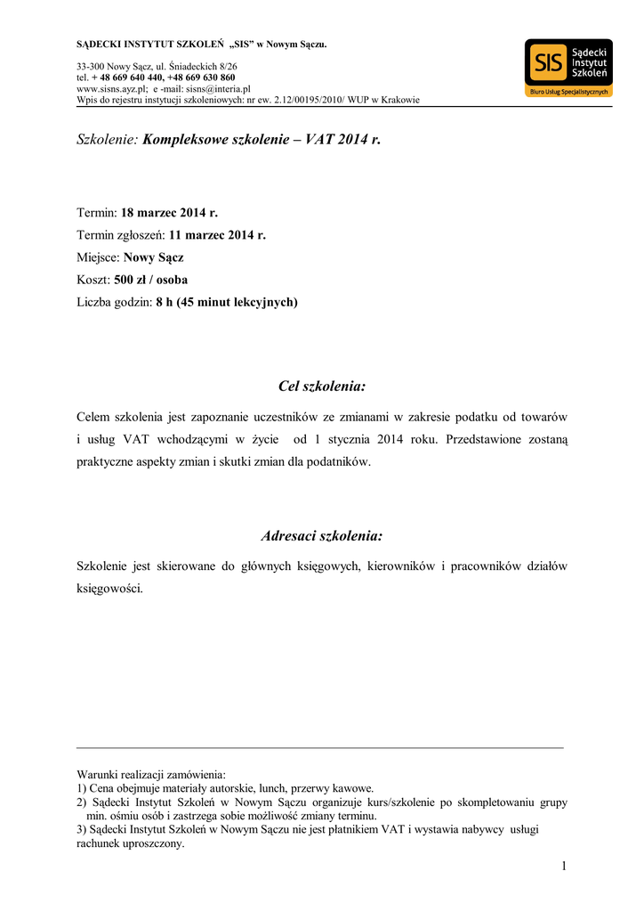 SĄDECKI INSTYTUT SZKOLEŃ „SIS” w Nowym Sączu. 33-300 Nowy Sącz, ul. Śniadeckich 8/26 tel. + 48 669 640 440, +48 669 630 860 www.sisns.ayz.pl; e -mail: [email protected] Wpis do rejestru instytucji szkoleniowych: nr ew. 2.12/00195/2010/ WUP w Krakowie Szkolenie: Kompleksowe szkolenie – VAT 2014 r. Termin: 18 marzec 2014 r. Termin zgłoszeń: 11 marzec 2014 r. Miejsce: Nowy Sącz Koszt: 500 zł / osoba Liczba godzin: 8 h (45 minut lekcyjnych) Cel szkolenia: Celem szkolenia jest zapoznanie uczestników ze zmianami w zakresie podatku od towarów i usług VAT wchodzącymi w życie od 1 stycznia 2014 roku. Przedstawione zostaną praktyczne aspekty zmian i skutki zmian dla podatników. Adresaci szkolenia: Szkolenie jest skierowane do głównych księgowych, kierowników i pracowników działów księgowości. Warunki realizacji zamówienia: 1) Cena obejmuje materiały autorskie, lunch, przerwy kawowe. 2) Sądecki Instytut Szkoleń w Nowym Sączu organizuje kurs/szkolenie po skompletowaniu grupy min. ośmiu osób i zastrzega sobie możliwość zmiany terminu. 3) Sądecki Instytut Szkoleń w Nowym Sączu nie jest płatnikiem VAT i wystawia nabywcy usługi rachunek uproszczony. 1 SĄDECKI INSTYTUT SZKOLEŃ „SIS” w Nowym Sączu. 33-300 Nowy Sącz, ul. Śniadeckich 8/26 tel. + 48 669 640 440, +48 669 630 860 www.sisns.ayz.pl; e -mail: [email protected] Wpis do rejestru instytucji szkoleniowych: nr ew. 2.12/00195/2010/ WUP w Krakowie Program szkolenia*: 1. Podstawa opodatkowania w 2014 roku: a) rozszerzenie pojęcia podstawy opodatkowania; b) podstawa opodatkowania w transakcjach krajowych, WNT, WDT; c) zasady rozliczania opakowań zwrotnych; d) postawa opodatkowania a rabaty, upusty – problemy praktyczne stosowania; 2. Zmiany w zakresie fakturowania od 1 stycznia 2014 roku: a) wprowadzenie zasad fakturowania z Rozporządzeń do Ustawy o VAT – skutki praktyczne; b) nowe dane faktury; c) nowy moment wystawienia faktury; d) zasady rozliczenia faktur korygujących według zmienionych zasad; e) faktura elektroniczna po zmianach; f) zasady stosowania dokumentów uproszczonych. 3. Odliczanie podatku VAT w 2014 roku: a) zasady odliczania podatku naliczonego od 01.01.2014 roku; b) konieczność korekty podatku naliczonego w przypadku braku faktury z tytułu WNT, importu usług; c) kwota odliczenia podatku VAT; d) zaliczka w WNT a odliczenie podatku VAT ; e) import towarów a prawo do odliczenia podatku VAT; f) rozliczenie faktury korygującej in minus po stronie kupującego i sprzedającego; 4. Pozostałe zmiany obowiązujące od 2014 roku: a) doprecyzowane pozostałych uregulowań Ustawy; b) zmiany w stawkach podatkowych. * Informujemy, iż program może ulec zmianie, o czym zostaną poinformowani wszyscy uczestnicy szkolenia. 2