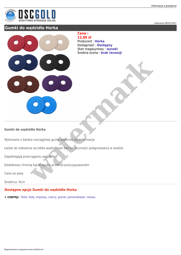 Informacje o produkcie Utworzono 08-03-2017 Gumki do wędzidła Horka Cena : 12,00 zł Gumki do wędzidła Horka er m ar k Producent : Horka Dostępność : Dostępny Stan magazynowy : wysoki Średnia ocena : brak recenzji Wykonane z bardzo rozciągliwej gumy odpornej na deformacje at Łatwe do nałożenia na kółka wędzidłowe bez konieczności podgrzewania w wodzie Zapobiegają przeciąganiu wędzidła w Dodatkowo chronią kąciki pyska przed przyszczypywaniem Cena za parę Średnica: 9cm Dostępne opcje Gumki do wędzidła Horka » czarny: fiolet, biały, brązowy, czarny, granat, jasnoniebieski, rozowy. Wygenerowano w programie www.oscGold.com