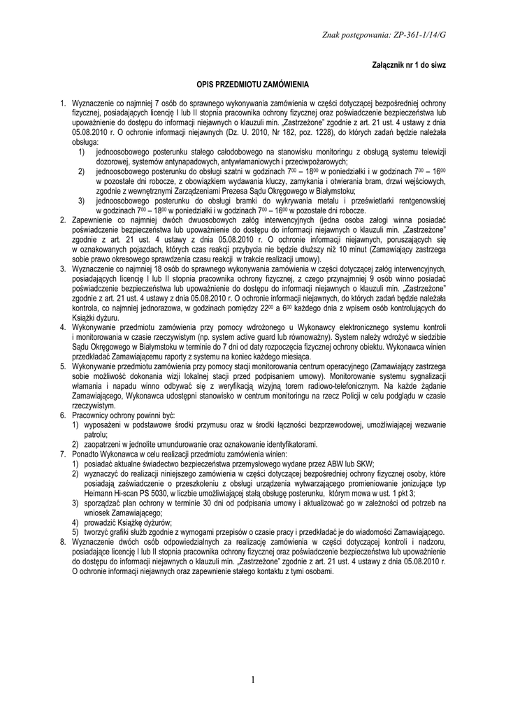 Znak postępowania: ZP-361-1/14/G Załącznik nr 1 do siwz OPIS PRZEDMIOTU ZAMÓWIENIA 1. Wyznaczenie co najmniej 7 osób do sprawnego wykonywania zamówienia w części dotyczącej bezpośredniej ochrony fizycznej, posiadających licencję I lub II stopnia pracownika ochrony fizycznej oraz poświadczenie bezpieczeństwa lub upoważnienie do dostępu do informacji niejawnych o klauzuli min. „Zastrzeżone” zgodnie z art. 21 ust. 4 ustawy z dnia 05.08.2010 r. O ochronie informacji niejawnych (Dz. U. 2010, Nr 182, poz. 1228), do których zadań będzie należała obsługa: 1) jednoosobowego posterunku stałego całodobowego na stanowisku monitoringu z obsługą systemu telewizji dozorowej, systemów antynapadowych, antywłamaniowych i przeciwpożarowych; 2) jednoosobowego posterunku do obsługi szatni w godzinach 700 – 1800 w poniedziałki i w godzinach 700 – 1600 w pozostałe dni robocze, z obowiązkiem wydawania kluczy, zamykania i otwierania bram, drzwi wejściowych, zgodnie z wewnętrznymi Zarządzeniami Prezesa Sądu Okręgowego w Białymstoku; 3) jednoosobowego posterunku do obsługi bramki do wykrywania metalu i prześwietlarki rentgenowskiej w godzinach 700 – 1800 w poniedziałki i w godzinach 700 – 1600 w pozostałe dni robocze. 2. Zapewnienie co najmniej dwóch dwuosobowych załóg interwencyjnych (jedna osoba załogi winna posiadać poświadczenie bezpieczeństwa lub upoważnienie do dostępu do informacji niejawnych o klauzuli min. „Zastrzeżone” zgodnie z art. 21 ust. 4 ustawy z dnia 05.08.2010 r. O ochronie informacji niejawnych, poruszających się w oznakowanych pojazdach, których czas reakcji przybycia nie będzie dłuższy niż 10 minut (Zamawiający zastrzega sobie prawo okresowego sprawdzenia czasu reakcji w trakcie realizacji umowy). 3. Wyznaczenie co najmniej 18 osób do sprawnego wykonywania zamówienia w części dotyczącej załóg interwencyjnych, posiadających licencję I lub II stopnia pracownika ochrony fizycznej, z czego przynajmniej 9 osób winno posiadać poświadczenie bezpieczeństwa lub upoważnienie do dostępu do informacji niejawnych o klauzuli min. „Zastrzeżone” zgodnie z art. 21 ust. 4 ustawy z dnia 05.08.2010 r. O ochronie informacji niejawnych, do których zadań będzie należała kontrola, co najmniej jednorazowa, w godzinach pomiędzy 2200 a 600 każdego dnia z wpisem osób kontrolujących do Książki dyżuru. 4. Wykonywanie przedmiotu zamówienia przy pomocy wdrożonego u Wykonawcy elektronicznego systemu kontroli i monitorowania w czasie rzeczywistym (np. system active guard lub równoważny). System należy wdrożyć w siedzibie Sądu Okręgowego w Białymstoku w terminie do 7 dni od daty rozpoczęcia fizycznej ochrony obiektu. Wykonawca winien przedkładać Zamawiającemu raporty z systemu na koniec każdego miesiąca. 5. Wykonywanie przedmiotu zamówienia przy pomocy stacji monitorowania centrum operacyjnego (Zamawiający zastrzega sobie możliwość dokonania wizji lokalnej stacji przed podpisaniem umowy). Monitorowanie systemu sygnalizacji włamania i napadu winno odbywać się z weryfikacją wizyjną torem radiowo-telefonicznym. Na każde żądanie Zamawiającego, Wykonawca udostępni stanowisko w centrum monitoringu na rzecz Policji w celu podglądu w czasie rzeczywistym. 6. Pracownicy ochrony powinni być: 1) wyposażeni w podstawowe środki przymusu oraz w środki łączności bezprzewodowej, umożliwiającej wezwanie patrolu; 2) zaopatrzeni w jednolite umundurowanie oraz oznakowanie identyfikatorami. 7. Ponadto Wykonawca w celu realizacji przedmiotu zamówienia winien: 1) posiadać aktualne świadectwo bezpieczeństwa przemysłowego wydane przez ABW lub SKW; 2) wyznaczyć do realizacji niniejszego zamówienia w części dotyczącej bezpośredniej ochrony fizycznej osoby, które posiadają zaświadczenie o przeszkoleniu z obsługi urządzenia wytwarzającego promieniowanie jonizujące typ Heimann Hi-scan PS 5030, w liczbie umożliwiającej stałą obsługę posterunku, którym mowa w ust. 1 pkt 3; 3) sporządzać plan ochrony w terminie 30 dni od podpisania umowy i aktualizować go w zależności od potrzeb na wniosek Zamawiającego; 4) prowadzić Książkę dyżurów; 5) tworzyć grafiki służb zgodnie z wymogami przepisów o czasie pracy i przedkładać je do wiadomości Zamawiającego. 8. Wyznaczenie dwóch osób odpowiedzialnych za realizację zamówienia w części dotyczącej kontroli i nadzoru, posiadające licencję I lub II stopnia pracownika ochrony fizycznej oraz poświadczenie bezpieczeństwa lub upoważnienie do dostępu do informacji niejawnych o klauzuli min. „Zastrzeżone” zgodnie z art. 21 ust. 4 ustawy z dnia 05.08.2010 r. O ochronie informacji niejawnych oraz zapewnienie stałego kontaktu z tymi osobami. 1