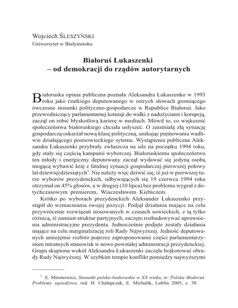 Wojciech ŒLESZYÑSKI Uniwersytet w Bia³ymstoku Bia³oruœ £ukaszenki – od demokracji do rz¹dów autorytarnych ia³oruska opinia publiczna pozna³a Aleksandra £ukaszenko w 1993 roku jako rzutkiego deputowanego w ostrych s³owach gromi¹cego ówczesne stosunki polityczno-gospodarcze w Republice Bia³oruœ. Jako przewodnicz¹cy parlamentarnej komisji do walki z nadu¿yciami i korupcj¹, zacz¹³ on robiæ b³yskotliw¹ karierê w mediach. Mówi³ to, co wiêkszoœæ spo³eczeñstwa bia³oruskiego chcia³a us³yszeæ. O zaistnia³¹ z³¹ sytuacjê gospodarcz¹ oskar¿a³ now¹ klasê polityczn¹, unikaj¹c piêtnowania wadliwie dzia³aj¹cego postsowieckiego sytemu. Wyst¹pienia publiczne Aleksandra £ukaszenki przybra³y zw³aszcza na sile na pocz¹tku 1994 roku, gdy sta³y siê czêœci¹ kampanii wyborczej. Bia³oruskiemu spo³eczeñstwu ten m³ody i energiczny deputowany zacz¹³ wydawaæ siê jedyn¹ osob¹ mog¹c¹ wybawiæ kraj z fatalnej sytuacji gospodarczej pierwszej po³owy lat dziewiêædziesi¹tych1. Nie nale¿y wiêc dziwiæ siê, i¿ ju¿ w pierwszej turze wyborów prezydenckich, odbywaj¹cych siê 19 czerwca 1994 roku otrzyma³ on 45% g³osów, a w drugiej (10 lipca) bez problemu wygra³ z dotychczasowym premierem, Wiaczes³awem Kiebiczem. Krótko po wyborach prezydenckich Aleksander £ukaszenko przyst¹pi³ do wzmacniania swojej pozycji. Podj¹³ dzia³ania maj¹ce na celu przywrócenie rozwi¹zañ stosowanych w czasach sowieckich, z t¹ tylko ró¿nic¹, i¿ zamiast struktur partyjnych, zaczêto rozbudowywaæ uprawnienia administracyjne prezydenta. Jednoczeœnie podjête zosta³y dzia³ania maj¹ce na celu marginalizacjê roli Rady Najwy¿szej. Jednoœæ deputowanych umiejêtnie rozbito poprzez zaproponowanie czêœci parlamentarzystom intratnych stanowisk w nowo powsta³ej administracji prezydenckiej. Grupa skupiona wokó³ Aleksandra £ukaszenki zaczê³a bojkotowaæ obrady Rady Najwy¿szej. W szybkim tempie konflikt pomiêdzy najwy¿szymi B 1 E. Mironowicz, Stosunki polsko-bia³oruskie w XX wieku, w: Polska–Bia³oruœ. Problemy s¹siedztwa, red. H. Cha³upczak, E. Michalik, Lublin 2005, s. 30. 122 Wojciech Œleszyñski SP 2 ’11 instytucjami w³adzy w pañstwie – prezydentem i Rad¹ Najwy¿sz¹ zacz¹³ przybieraæ formê walki o wizjê pañstwa bia³oruskiego. £ukaszenko, maj¹c poparcie znacznej czêœci spo³eczeñstwa, d¹¿y³ do zbli¿enia z Rosj¹, podczas gdy deputowani (g³ównie z Bia³oruskiego Frontu Ludowego), protestowali przeciwko zbyt bliskiemu sojuszowi z wielkim wschodnim s¹siadem. Na znak protestu w kwietniu 1995 roku grupa parlamentarzystów z Bia³oruskiego Frontu Ludowego podjê³a akcjê g³odow¹. Nie spotka³o siê to jednak ze znacz¹cym odzewem wœród spo³eczeñstwa bia³oruskiego, sympatyzuj¹cego raczej z prezydentem. Parlament postrzegany by³ jako si³a blokuj¹ca wprowadzanie pozytywnych zmian w kraju2. Wa¿nym etapem wzmocnienia pozycji prezydenta by³o referendum przeprowadzone w maju 1995 roku, w którym to spo³eczeñstwo popar³o starania £ukaszenki zmierzaj¹ce do silniejszej integracji kraju z Rosj¹. Wyrazi³o równie¿ zgodê na powrót nieco zmienionego god³a i flagi z czasów sowieckich oraz na zrównanie w prawach jêzyka bia³oruskiego i rosyjskiego3. Wzmocniony tym sukcesem £ukaszenko postanowi³ ostatecznie podporz¹dkowaæ sobie wybran¹ w 1995 roku now¹ Radê Najwy¿sz¹. Jakiekolwiek podejmowane przez parlament próby kontroli dzia³alnoœci administracji prezydenckiej spotyka³y siê ze zdecydowanym sprzeciwem £ukaszenki. Konflikt pomiêdzy parlamentem a prezydentem swoje apogeum osi¹gn¹³ jesieni¹ 1996 roku. Spo³eczeñstwo podzieli³o siê na dwa bloki, obóz prezydencki, m.in. dziêki kontroli œrodków masowego przekazu, mia³ jednak wiêksze poparcie. Prawdziw¹ koœci¹ niezgody okaza³o siê referendum z listopada 1996 roku, które zdecydowaæ mia³o o przyjêciu rozwi¹zañ konstytucyjnych, wzmacniaj¹cych pozycjê prezydenta. Po og³oszeniu pozytywnych dla bloku prezydenckiego wyników, opozycja bezskutecznie zarzuca³a sfa³szowanie g³osowania. Spo³eczeñstwo bia³oruskie nie popar³o ¿¹dañ opozycji. Od nowego prezydenta oczekiwano zdecydowanych kroków. Z punktu widzenia wiêkszoœci obywateli, wzmocnienie pozycji prezydenta w pañstwowych strukturach Republiki Bia³oruœ wydawa³o siê byæ lepszym rozwi¹zaniem ni¿ nadmierna, jak wówczas uwa¿ano, sejmokracja4. 2 Z. Szybieka, Historia Bia³orusi 1795–2000, Lublin 2002, s. 455. M. Habowski, System rz¹dów Polski i Bia³orusi – próba porównania, w: Polska–Bia³oruœ. Wybrane aspekty polityczne i gospodarcze, red. M. S. Wolañski, G. Tokarz, Toruñ 2005, s. 17–18. 4 Ibidem, s. 19. 3 SP 2 ’11 Bia³oruœ £ukaszenki – od demokracji do rz¹dów autorytarnych 123 Widz¹c nastroje spo³eczne i coraz silniejsz¹ pozycjê £ukaszenki, wiêkszoœæ deputowanych Rady Najwy¿szej ostatecznie uzna³a legalnoœæ referendum. Na mocy postanowieñ nowej konstytucji rozwi¹zaniu uleg³a Rada Najwy¿sza, a na jej miejsce powo³ano dwuizbowy parlament – Zgromadzenie Narodowe. Decyzji tej nie uznali deputowani nastawieni do £ukaszenki opozycyjnie, w dalszym ci¹gu uwa¿aj¹cy siê za jedynych legalnie wybranych przedstawicieli narodu bia³oruskiego. By³ to jednak akt bez wiêkszego znaczenia politycznego – spór tocz¹cy siê w Bia³orusi jesieni¹ 1996 roku zosta³ wygrany przez £ukaszenkê. Nowa konstytucja przyznaj¹ca olbrzymie kompetencje prezydentowi, w po³¹czeniu z coraz silniejsz¹ pozycj¹ w mediach, policji i wojsku, dawa³a Aleksandrowi £ukaszence w praktyce nieograniczon¹ w³adzê w pañstwie5. Prowadz¹c walkê z opozycj¹, prezydent zdawa³ sobie sprawê, i¿ trwa³oœæ jego sukcesu w du¿ej mierze bêdzie zale¿a³a od unormowania sytuacji gospodarczej w kraju. Proponowane dzia³ania, zak³adaj¹ce powrót do rozwi¹zañ z okresu planowania centralnego, podziela³a wiêkszoœæ obywateli. W³asnoœæ pañs