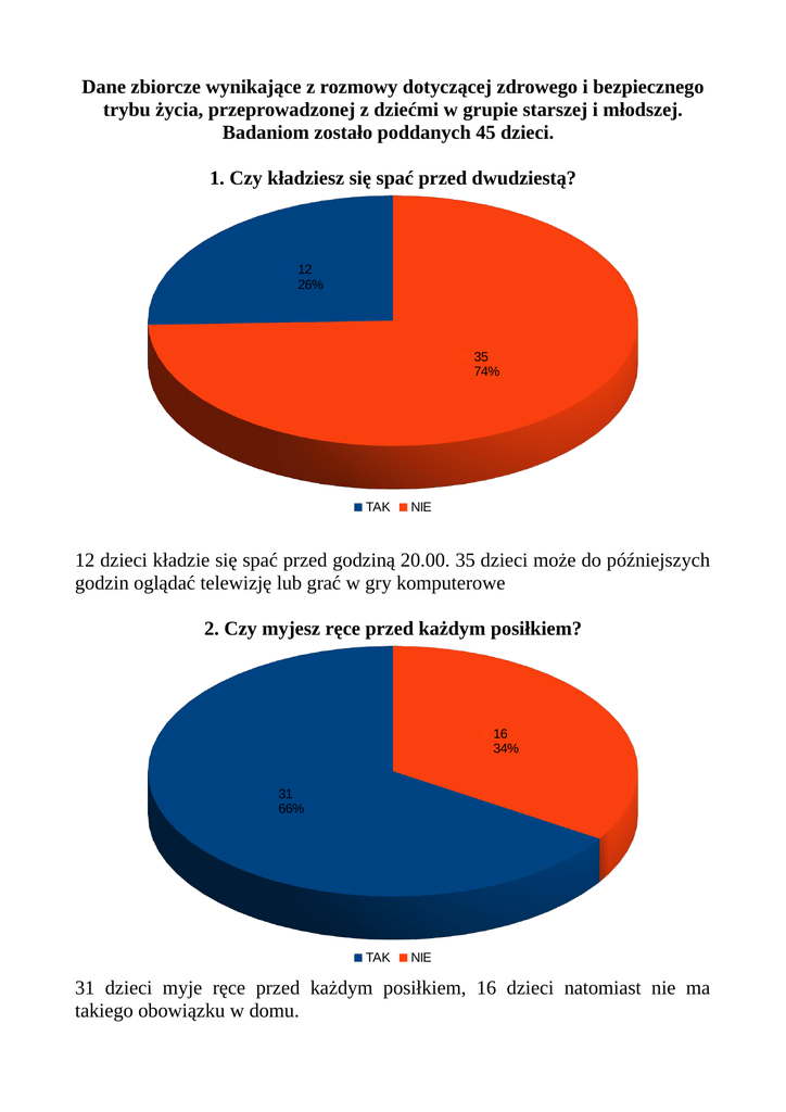 Dane zbiorcze wynikające z rozmowy dotyczącej zdrowego i bezpiecznego trybu życia, przeprowadzonej z dziećmi w grupie starszej i młodszej. Badaniom zostało poddanych 45 dzieci. 1. Czy kładziesz się spać przed dwudziestą? 12 26% 35 74% TAK NIE 12 dzieci kładzie się spać przed godziną 20.00. 35 dzieci może do późniejszych godzin oglądać telewizję lub grać w gry komputerowe 2. Czy myjesz ręce przed każdym posiłkiem? 16 34% 31 66% TAK NIE 31 dzieci myje ręce przed każdym posiłkiem, 16 dzieci natomiast nie ma takiego obowiązku w domu. 3. Czy myjesz zęby rano i wieczorem? 17 36% 30 64% TAK NIE Większa część dzieci (30) myje zęby zarówno rano i wieczorem. Natomiast 17 dzieci myje zęby raz dziennie, albo w ogóle. 4. Czy przed pójściem do przedszkola jesz śniadanie? 16 34% 31 66% TAK NIE 31 dzieci je śniadanie w domu przed wyjściem do przedszkola. 16 dzieci je śniadanie dopiero w przedszkolu. 5. Czy jadasz owoce i warzywa? 14 30% 33 70% TAK NIE Większość dzieci (33) zadeklarował0, że je owoce i warzywa w domu. 14 dzieci (30%) nie je w ogóle warzyw ani owoców. 6. Czy chodzisz na spacery lub bawisz się na podwórku? 11 23% 36 77% TAK NIE 77% dzieci wychodzi z rodzicami na podwórko pospacerować albo pobawić się. 11% dzieci woli zabawy w domu. Przy czym część z tych dzieci stwierdziła, że dotyczy to tylko okresu zimowego. 7. Czy zmieniasz codziennie bieliznę? 16 34% 31 66% TAK NIE Ponad połowa dzieci (66%) zmienia bieliznę codziennie. 34% nie musi tego robić i tę samą bieliznę nosi nawet przez kilka dni. 8. Czy jesz mało słodyczy? 18 38% 29 62% TAK NIE 38% dzieci ma ograniczony dostęp do słodyczy. 62% dzieci tych słodyczy je w bardzo dużych ilościach. 9. Czy myjesz się przed pójściem spać? 17 36% 30 64% TAK NIE 64% dzieci bierze kąpiel albo prysznic codziennie przed snem. 36% nie ma takiego obowiązku. 10. Czy znasz swój adres zamieszkania? 21 45% 26 55% TAK NIE Mniejsza część dzieci (45%) zna swój adres zamieszkania. 55% dzieci nie zna adresu – czasami tylko miejscowości, a czasami tylko ulicy. 11. Czy znasz numery alarmowe (policja, straż pożarna, pogotowie ratunkowe) 5 11% 42 89% TAK NIE Niestety tylko pięcioro dzieci (11%) zna nr alarmowe. 89% dzieci nie zna tych numerów. Część z tych dzieci wiedziało, że trzeba informować policję lub pogotowie czy straż pożarną, ale nie znało numerów. 12. Czy wiesz co oznaczają kolory sygnalizatora drogowego? 5 11% 42 89% TAK NIE Tylko pięcioro dzieci nie zna znaczenia świateł na sygnalizatorze świetlnym. Pozostałe 89% wiedziało kiedy można przechodzić przez przejście, a kiedy należy poczekać. 13. Czy wolno Ci samemu przechodzić przez jezdnię? 7 15% 40 85% TAK NIE Siedmioro dzieci (15%), z czego pięcioro wśród maluchów, może samodzielnie, bez opieki dorosłego przechodzić przez jezdnię. Pozostałe 85% ma zdecydowany zakaz przechodzenia przez jezdnię. 14. Czy chętnie uczestniczysz w zabawach ruchowych i ćwiczeniach gimnastycznych? 8 17% 39 83% TAK NIE 17% dzieci nie jest zwolennikiem zajęć ruchowych. 83% dzieci chętnie w nich uczestniczy.
