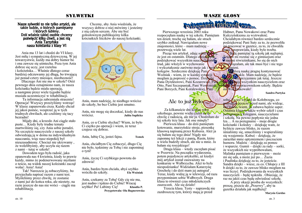 SYLWETKI Nasze sylwetki to nie tylko artyści, ale także ludzie, o których pamiętamy i których lubimy. Dziś właśnie takiej osobie chcemy poświęcić kilka chwil, a jest nią Ania Tarzyńska nasza koleżanka z klasy VI Ania ma 13 lat i chodzi do VI klasy. Jest miłą i sympatyczną dziewczyną. W jej towarzystwie, każdy ma dobry humor bo i ona zawsze się uśmiecha. Poza tym Ania dobrze się uczy, jest rzetelna i koleżeńska… Właśnie dlatego coraz bardziej odczuwamy jej długą, bo trwającą już ponad cztery miesiące, nieobecność! Dlaczego Ani nie ma w szkole? Otóż pewnego dnia oznajmiono nam, że nasza koleżanka będzie miała operację, a następnie przez wiele tygodni będzie musiała uczestniczyć w rehabilitacji. Ta informacja zabrzmiała strasznie! Operacja! Wszyscy przeżyliśmy wstrząs! W klasie zapanowała cisza. Każdy chciał jej jakoś pomóc, wesprzeć ją w tych trudnych chwilach, ale czuliśmy się tacy bezradni! Mijały dni, a krzesło Ani ciągle stało puste… Kiedy były trudne tematy martwiliśmy się, czy Ania sobie poradzi. Na szczęście nauczyciele z naszej szkoły odwiedzają ją w domu na indywidualnym nauczaniu, więc nasz niepokój był nieuzasadniony. Chociaż nie ukrywamy , że wolelibyśmy, aby uczyła się razem z nami – tutaj w szkole! Dowodem tego była radość, jaka opanowała nas 4 kwietnia, kiedy to prawie każdy, mimo że podenerwowany myślami o teście, na widok naszej koleżanki zaczął wołać: Ania! Ania! Tak! Nareszcie ją zobaczyliśmy, bo przyjechała napisać razem z nami test. Myśleliśmy przez chwilę, że zostanie z nami już do końca roku, ale niestety, na razie jeszcze do nas nie wróci – ciągle ma rehabilitację. str. 10 WASZE GŁOSY Chcemy, aby Ania wiedziała, że wszyscy dobrze o niej mówimy i jesteśmy z nią całym sercem. Aby nie być gołosłownym publikujemy kilka króciutkich liścików do naszej koleżanki. Pierwszego września 2003 roku rozpoczęłam naukę w tej szkole. Pamiętam ten dzień; trochę się bałam, ale strach szybko zniknął. Nawiązałam nowe znajomości, które – mam nadzieję – przetrwają wiele lat. Pisząc ten artykuł, zdaję sobie sprawę, że jest on ostatnim. Dlatego chciałabym podziękować wszystkim nauczycielom za trud, jaki włożyli w wychowanie i wykształcenie zarówno moje jak i moich kolegów. Serdecznie dziękuję Pani Woźniak - wiem, że w każdej sytuacji mogłam ją poprosić o pomoc. Dziękuję Panu Dyrektorowi, Pani Kozarewicz, Pani Otto, Pani Szczepaniak, Pani Wawrzniak, Pani Borzych, Pani Koralewskiej, Pani Hubner, Panu Nowakowi oraz Panu Kulczyńskiemu za wytrwałość. Chciałabym również bardzo serdecznie podziękować Pani Suty za to, że pozwoliła mi pracować w gazetce, za to, że chwaliła mnie i poprawiała, kiedy było trzeba. Będę pamiętać tą szkołę jak najlepiej. Trudno mi rozstać się z gimnazjum oraz z moimi rówieśnikami, bo się do nich przywiązałam, ale tak musi być i nic tego nie zmieni. Dalszą naukę pragnę kontynuować w LO w Nakle. Mam nadzieję, że będzie tam równie przyjemnie jak tutaj. Jeszcze raz dziękuję wszystkim nauczycielom oraz pozostałym pracownikom szkoły. Będzie mi Was brakowało! Sandra Partyka Aniu, mam nadzieję, że niedługo wrócisz do szkoły, bo bez Ciebie jest smutno. Aniu, nie mogę się doczekać, kiedy do nas Julita Suplicka wrócisz. Aniu, co u Ciebie słychać? Wiem, że było Ci ciężko po operacji i wiem, że teraz czujesz się dobrze. Aniu, lubię Cię, jesteś fajna. Tomek Aniu, chciałbym Cię zobaczyć, długo Cię nie było, tęsknimy za Tobą i nie zapominaj o tym! Aniu, życzę Ci szybkiego powrotu do zdrowia! Aniu, bardzo bym chciała, abyś szybko Ela Woźniak wróciła do szkoły. Aniu, czekamy za Tobą! Gdy cię nie ma, jest nudno i tęskno do Ciebie! Wracaj Klaudia P. szybko! Pa! Lubimy Cię! Przygotowała: Ola Bagnerowska Ale to już było… Za kilkanaście dni koniec roku szkolnego, pewnie wielu czeka na tę chwilę z radością, ale nie ja. Chodziłam do tej szkoły trzy lata. Jak one minęły? Pierwsza klasa – do dziś pamiętam kotowanie, murzyńskie stroje, piosenkę klasową napisaną przez Kubusia. Ależ ja się bałam się tego dnia! Nigdy nie zapomnę też lekcji z panią, Rusin, które u wielu budziły strach, ale nie u mnie. Ja bałam się rosyjskiego! Druga klasa – wtedy zaczęłam pisać w Przerwie. Na początku wydarzenia, potem pojedyncze artykuliki, aż kiedyś mój artykuł został zauważony na konkursie w Wałbrzychu. Ależ to była niespodzianka! Widziałam Katarzynę Grocholę i do dziś mam jej autograf . Teraz, kiedy widzę ją w telewizji, od razu przypominam sobie Wałbrzych. Druga klasa to również czas młodzieńczych zauroczeń. Ale się działo! Trzecia klasa. Testy – naprawdę nie zazdroszczę tym, którzy mają je przed sobą. To też wyjazd do Kołobrzegu, co prawda to jeszcze przed nami, ale widząc, kto jedzie, wiem, że zabawa będzie super. Ostatnia klasa to także wybór szkół i czas pożegnania z kolegami, nauczycielami i szkołą. Na pewno popłynie nie jedna łza… A na pożegnanie – moje drogie koleżanki i koledzy – dziękuję wam, że byliście zawsze blisko, że razem śmialiśmy się, smuciliśmy i wspieraliśmy się wzajemnie. Kubuś – dziękuję, że zaraziłaś mnie optymizmem i poczuciem humoru. Madziu – dziękuję za pomoc i wsparcie. Gumiś – dzięki za rady – sorki, że wszystkich nie wypróbowałam, Malinka pamiętam o pierwszym – może mi się uda, a może już po… Zuzia i Paulinka dziękuję za to, że jesteście. Sandra dzięki – wiesz, za co. Chłopcy z III b dzięki za to, że zawsze blisko mogłam na was liczyć. Podziękowania da wszystkich nauczycieli – będę tęskniła . Obiecuję, że raz na jakiś czas będę odwiedzać szkołę. A przy okazji prośba do wszystkich: proszę, piszcie do „Przerwy”, aby ta gazetka działała jak najdłużej! Marysia Gardas str. 3 s