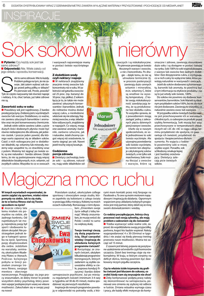 6 DODATEK DYSTRYBUOWANY WRAZ Z DZIENNIKIEM METRO ZAWIERA WYŁĄCZNIE MATERIAŁY PRZYGOTOWANE I POCHODZĄCE OD MEDIAPLANET inSPiRaCJE Sok sokowi ■■Pytanie: Czy każdy sok jest tak samo zdrowy? ■■Odpowiedź: Nie. Wiele zależy od jego składu i sposobu konserwacji. S oki to samo zdrowie. Wie to każdy. Problem polega na tym, że nie zawsze. Jaki zatem wybrać sok stojąc przed pełną półką w sklepie? Po pierwsze sok. Proste, prawda? Tyle że często nazywamy tak również napoje i nektary. A te, choć tańsze, już takie zdrowe nie są. zawartość soku w soku ■■ Prawdziwy sok jest najzdrowszy. Z bardzo prostej przyczyny. Zrobiony jest z wyciśniętych owoców lub warzyw. Dodatkowo, co ważne, nie zawiera sztucznych barwników i aromatów oraz nie jest konserwowany chemicznie. Jednak wiele soków zawiera cukier, a picie dużych ilości słodzonych płynów może być równie niebezpieczne dla zdrowia, jak jedzenie ciastek. I jeszcze jeden powód, dla którego warto zapoznać się ze składem soków. Część z nich wzbogacana jest w dodatkowe składniki, np. witaminy lub minerały, możemy więc uzupełnić to, co straciliśmy wraz z potem. Możemy też sięgnąć po świeże soki, są one naturalne i bardzo zdrowe. Dzięki temu, że nie są pasteryzowane mają więcej składników bioaktywnych, m.in. witamin, od zwykłych soków. Wszystko to co w owocach i warzywach najcenniejsze mamy w postaci świeżo wyciśniętego soku. z dodatkiem wody czyli nektary i napoje ■■ W nektarach znajdziemy znacznie mniej owoców lub koncentratu niż w soku. W zależności od gatunku owoców od 25 proc. (np. banany) do 50 proc. (np. jabłka). Z sokiem łączy je to, że także nie może zawierać sztucznych konserwantów i barwników. Jednak do nektarów można dodać więcej cukru, a niesłodzone właściwie się nie zdarzają. Najmniej owoców, a więc składników odżywczych, znajdziemy w napojach. Co więcej, mogą one zawierać aromaty i barwniki, zarówno sztuczne, jak i naturalne. Jeżeli chcemy czegoś więcej niż orzeźwienie, to warto sięgnąć po sok. Nawet jeżeli trochę więcej kosztuje. codzienna porcja zdrowia Dietetycy zachwalają świeże soki – są zdrowe, naturalne, mają wiele składników od- nierówny żywczych i są niskokaloryczne. Po pierwsze powstają ze świeżo tłoczonych warzyw i owoców, a nie z koncentratu. Po drugie – dzięki temu, że nie są utrwalane termicznie (tj. w procesie pasteryzacji) zawierają dużo cennych witamin i minerałów, m.in. witaminy C, które są wrażliwe na wysoką temperaturę . Z kolei swoją niskokaloryczność zawdzięczają temu, że są produkowane bez dodatku cukru. To wszystko sprawia, że z powodzeniem mogą zastąpić jedną z zalecanych pięciu dziennych porcji warzyw i owoców. Utarło się w naszym społeczeństwie, ze soki jednodniowe to soki świeżo wyciśnięte. Ale używajmy powiedzenia soki świeżo wyciśnięte, bo termin ten obejmuje całą kategorię soków świeżych, a nie tylko sok marchwiowy. Soki można tłoczyć z owoców i warz yw, które są Magiczna moc ruchu W innych wywiadach wspominałaś, że zanim zajęłaś się sportem, miałaś różne pomysły na siebie. Jak to się stało, że to w końcu fitness stał się Twoim sposobem na życie? Jeszcze cztery lata temu miałam sto pomysłów na siebie, ale żadnego konkretu. Od najmłodszych lat moją największą pasją był sport i dodawanie ludziom skrzydeł. Nie postrzegałam jednak tego w kategorii sposobu na życie. Sportową pasję eksplorowałam dla siebie. Jeździłam na warsztaty, seminaria, ukończyłam Akademię Pilates w Atenach. Podczas kolejnego pobytu w Grecji poznałam znanego trenera fitness, swojego mentora - obecnego narzeczonego. Przyglądając się jego pracy zrozumiałam, że dobry trener to przede wszystkim dobry psycholog, który powinien wpajać podopiecznym wiarę we własne możliwości. Zakochałam się w swojej pasji na nowo! Przestałam szukać, ukończyłam college sportowy i otworzyłam swoje studio, które zapełniło się kobietami z całego świata w przeciągu kilku miesięcy. Kobiety na moich oczach rozkwitały. Romawiając z nimi słyszałam: „Zmieniłam swoje życie odkąd z tobą trenuję”. Wtedy zrozumiałam, że muszę wrócić do Polski i zrobić to samo na większą skalę. Twoje treningi cieszą się dużą popularnością. Skąd czerpałaś wiedzę i inspirację do układania kolejnych programów ćwiczeń? Korzystając ze znanych ćwiczeń, ułożyłam kilkadziesiąt programów treningowych, których zadaniem są szybko zauważalne efekty w ciele, poprawa kondycji fizycznej i bardzo dobre samopoczucie psychiczne. Już po miesiącu regularnych ćwiczeń (minimum 3-4 razy w tygodniu od 30 do 45 minut), można spodziewać się pierwszych rezultatów. Inspiracje do nowych programów powstają w odpowiedzi na potrzeby osób, z któ- rymi mam kontakt przez mój fanpage na Facebook-u. To one są moim motorem napędowym i inspiracją do działania. Ogromnym wsparciem przy układaniu kolejnych programów jest mój partner, który dzieli się ze mną swoim doświadczeniem i wiedzą. Co radzisz początkującym, którzy chcą pracować nad swoją sylwetką, ale mają problem z zabraniem się do ćwiczenia? ■■ Trzeba wyznaczyć sobie realne cele, zaprosić do współdziałania swoją przyjaciółkę, partnera, kogoś kto będzie wspierał. Należy wygospodarować 4 x 30-35minut w tygodniu i nie zrażać się kiedy pierwszy trening przerasta nasze możliwości. Można też zacząć od 15 minut. Z czasem jest łatwiej, pojawia się pozytywne uzależnienie od endorfin czyli hormonów szczęścia. Dzień bez treningu staje się niekompletny. W kraju, w którym cierpimy na deficyt słońca, trening powinien być dawkowany niczym pigułka szczęścia. Czy to właśnie ścisłe trzymanie się grafiku ćwiczeń jest kluczem do sukcesu, co zrobić kiedy nam się zwyczajnie nie chce? Żeby kontynuować podjętą